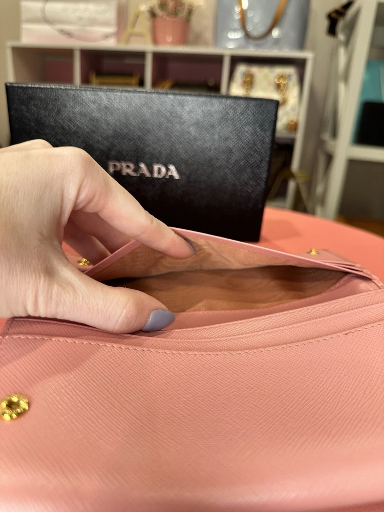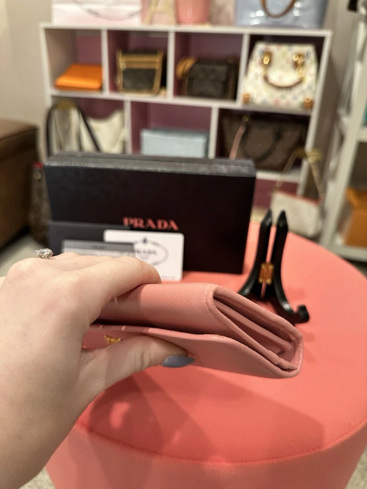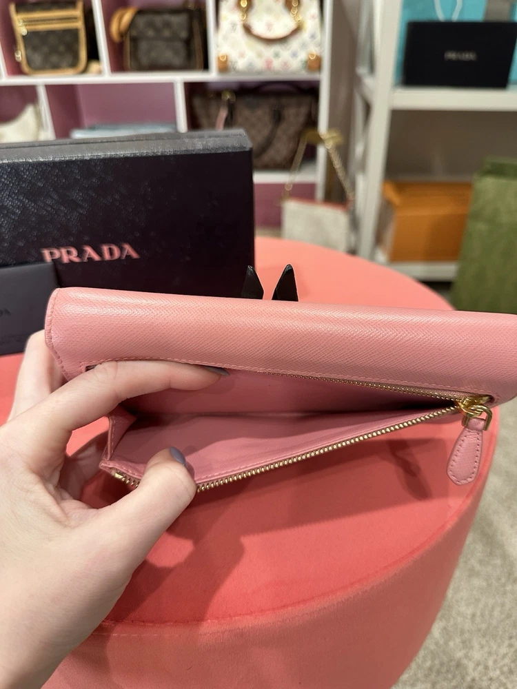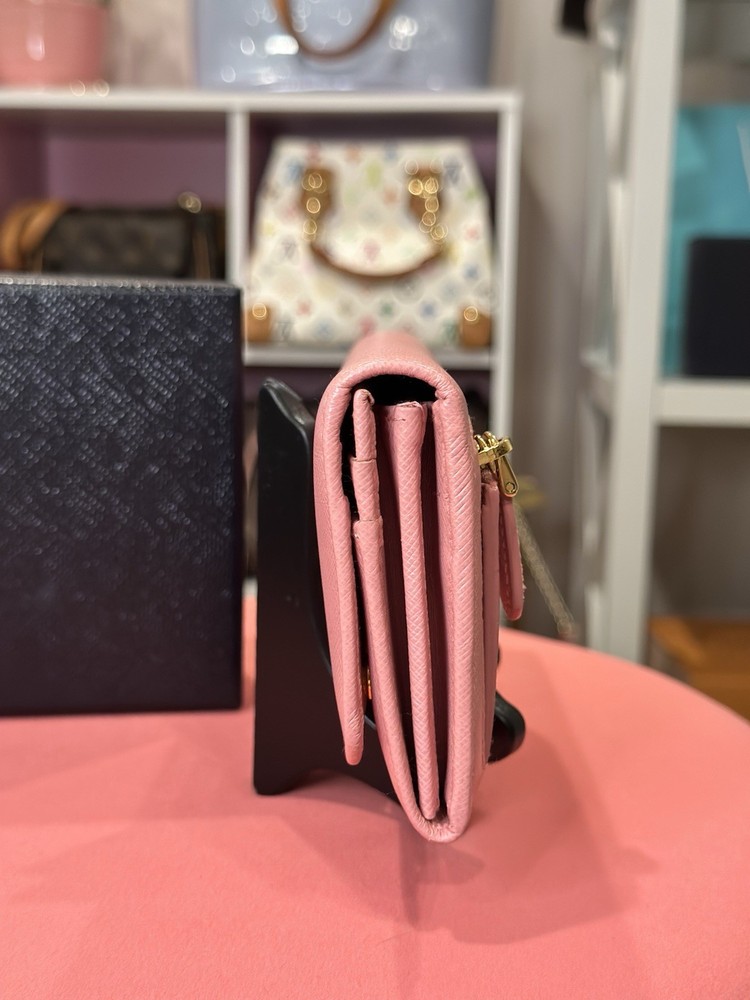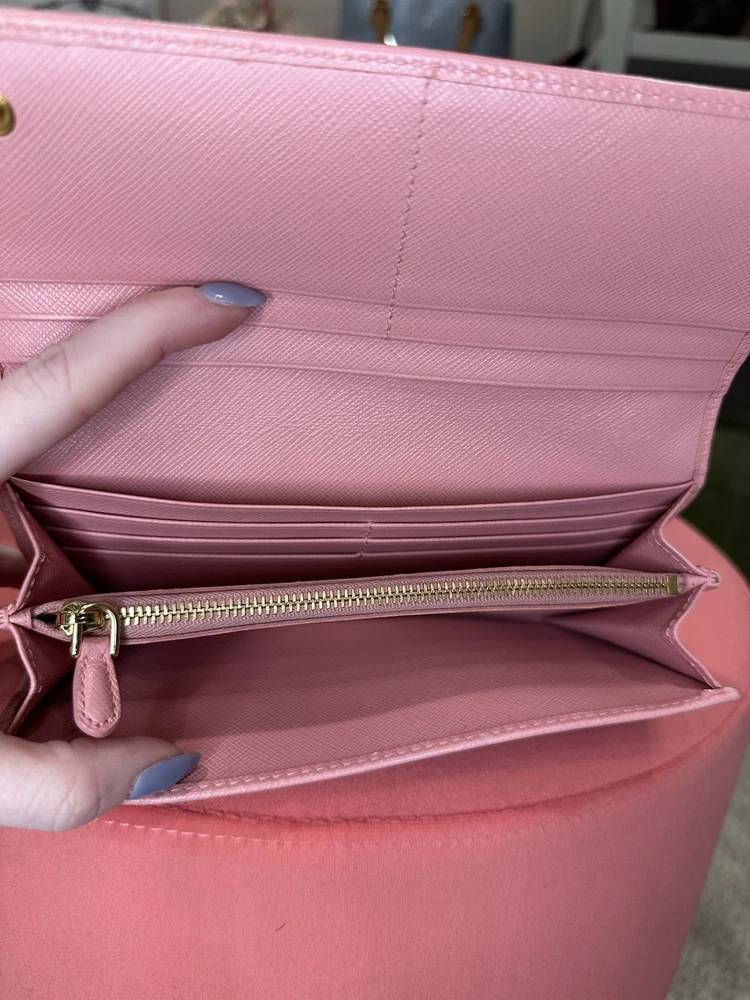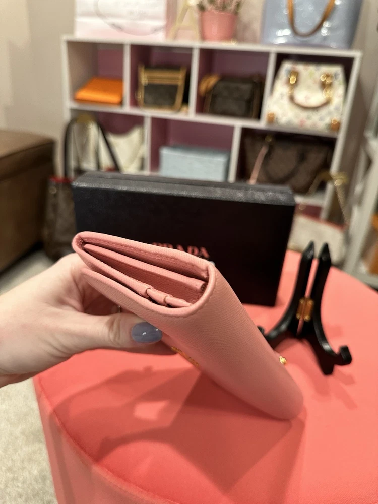 Absolutely love this Prada wallet! The pink Saffiano leather is gorgeous and durable, with a sleek gold-tone hardware that adds elegance. Plenty of card slots and pockets keep everything organized, and the snap closure feels secure. Even with minor signs of use, it looks almost new—great value for a luxury piece! Comes with box and papers, making it perfect for gifting or treating yourself. Highly recommend!
