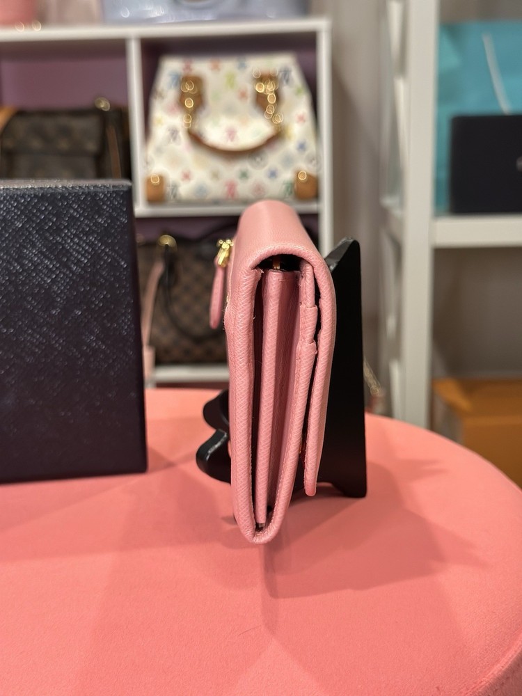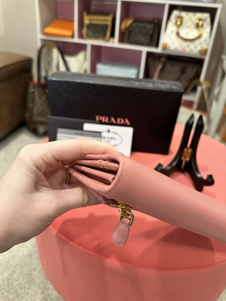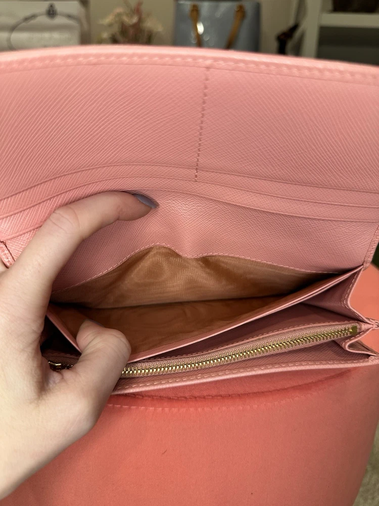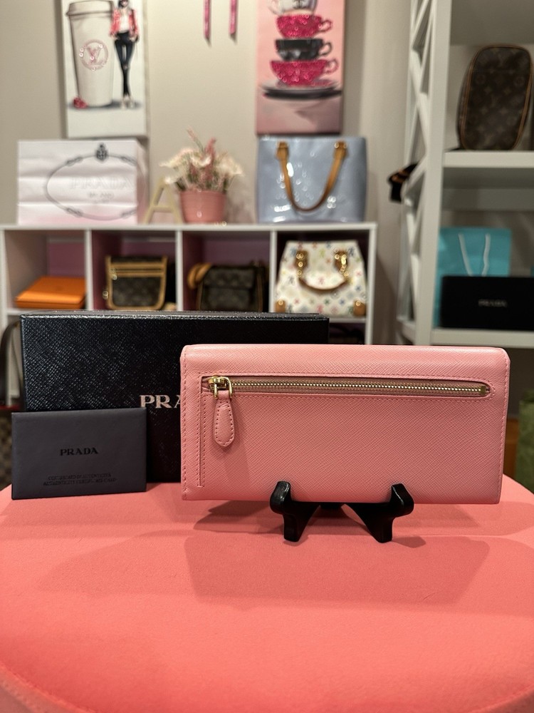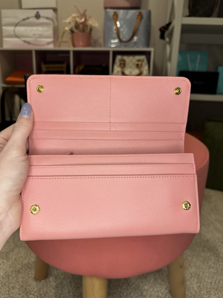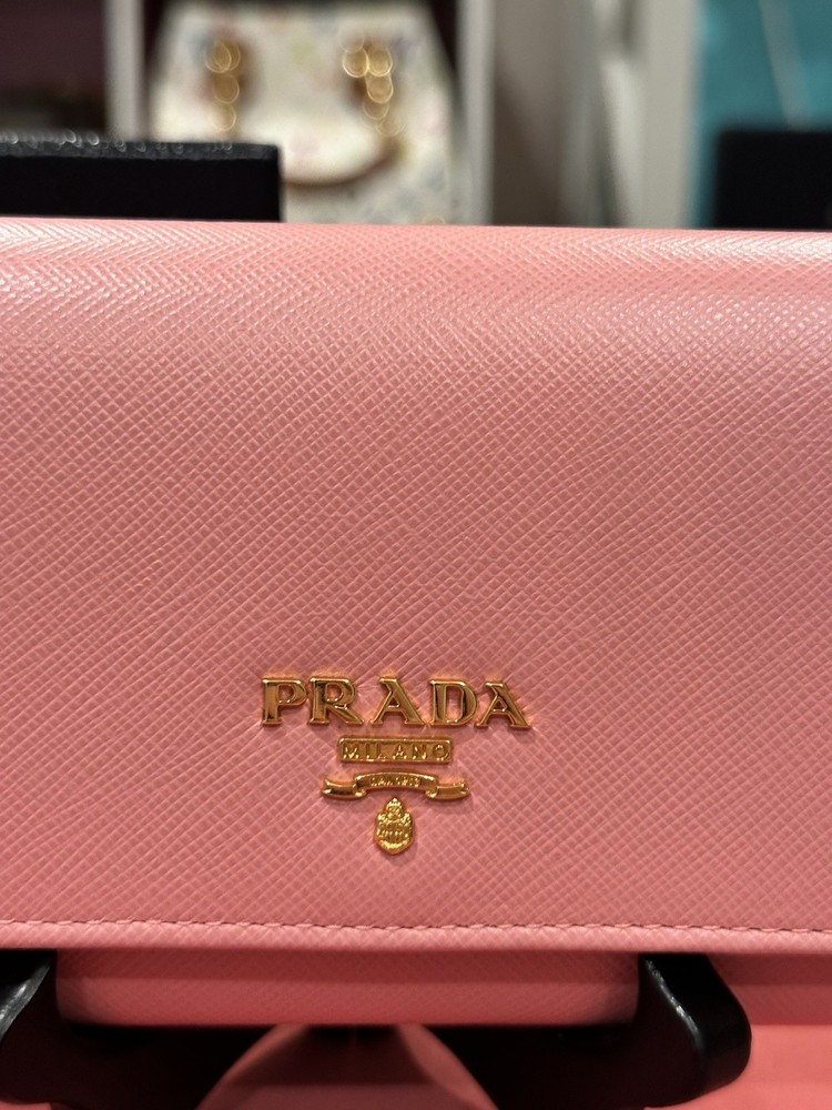 Absolutely love this Prada wallet! The pink Saffiano leather is gorgeous and durable, with a sleek gold-tone hardware that adds elegance. Plenty of card slots and pockets keep everything organized, and the snap closure feels secure. Even with minor signs of use, it looks almost new—great value for a luxury piece! Comes with box and papers, making it perfect for gifting or treating yourself. Highly recommend!