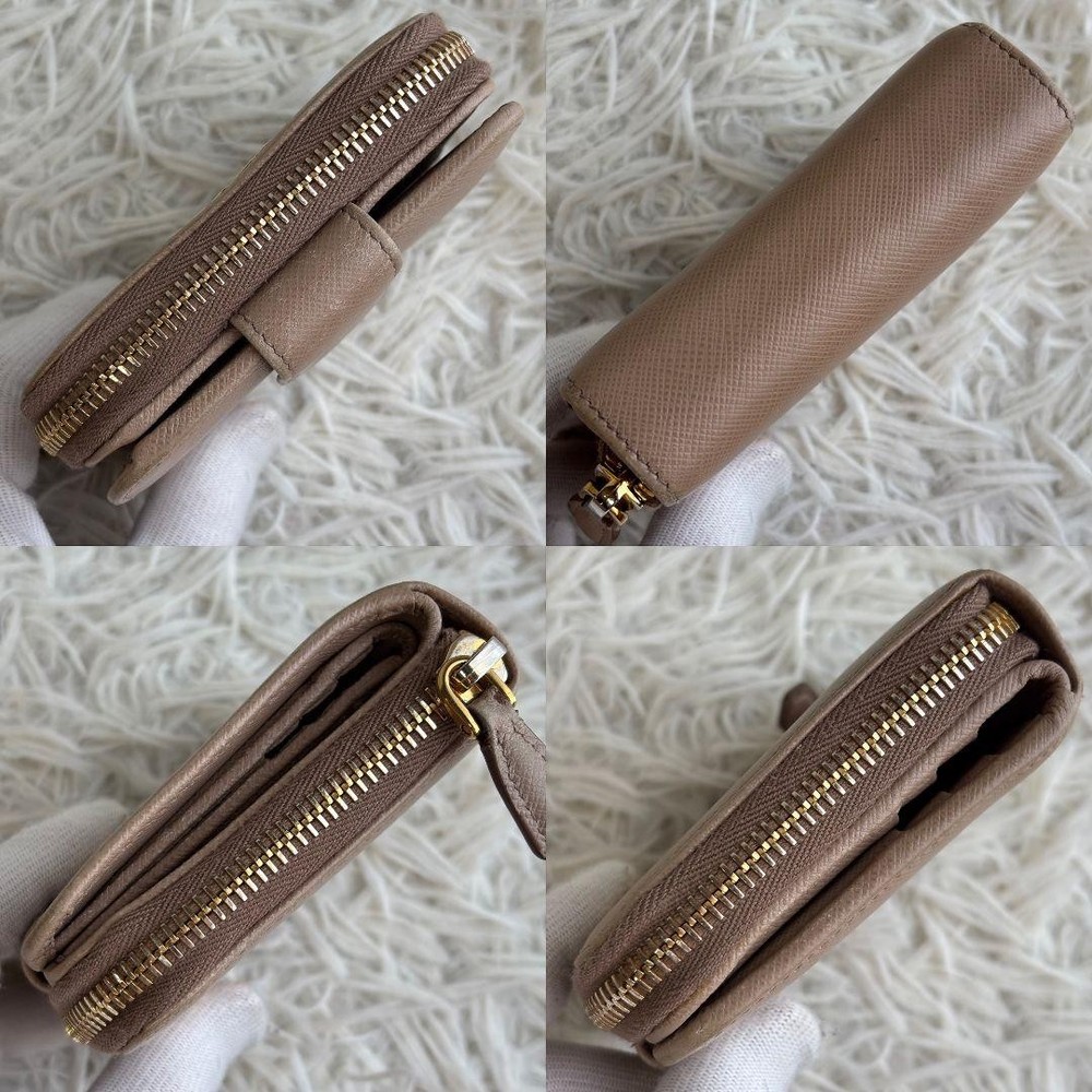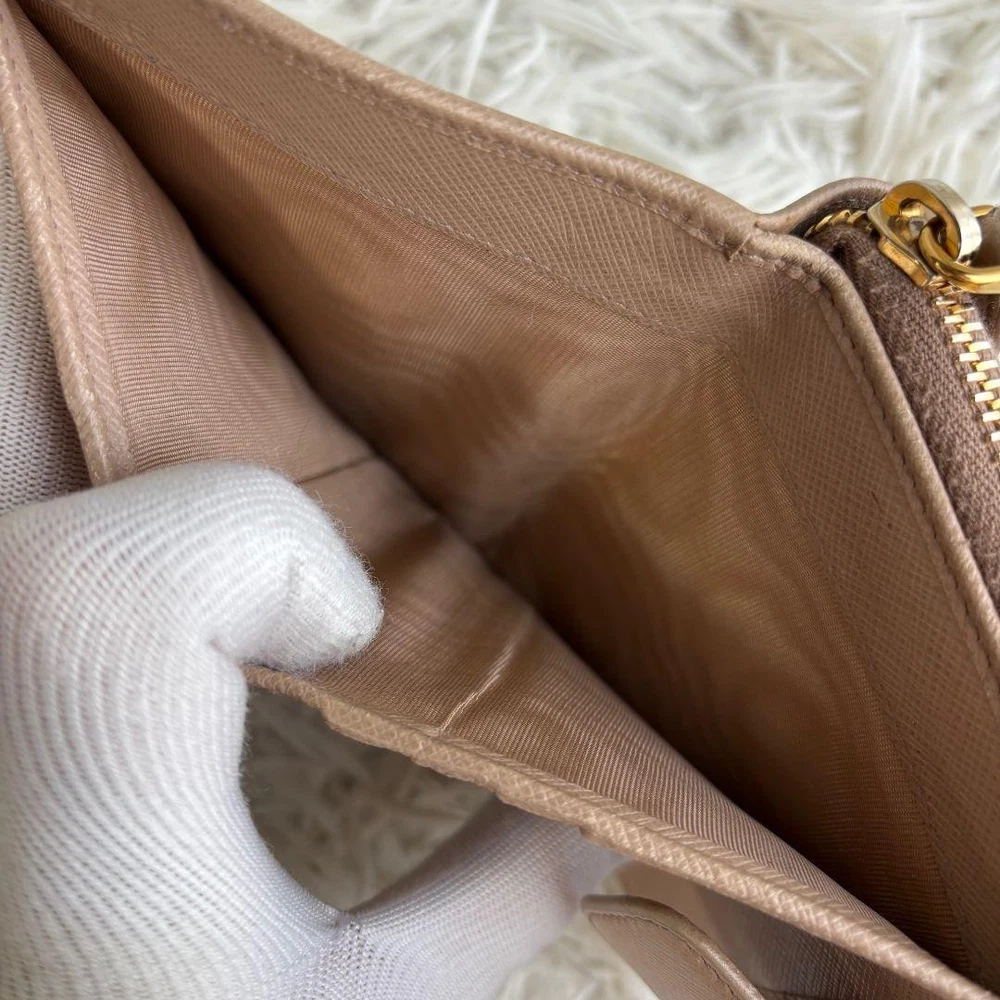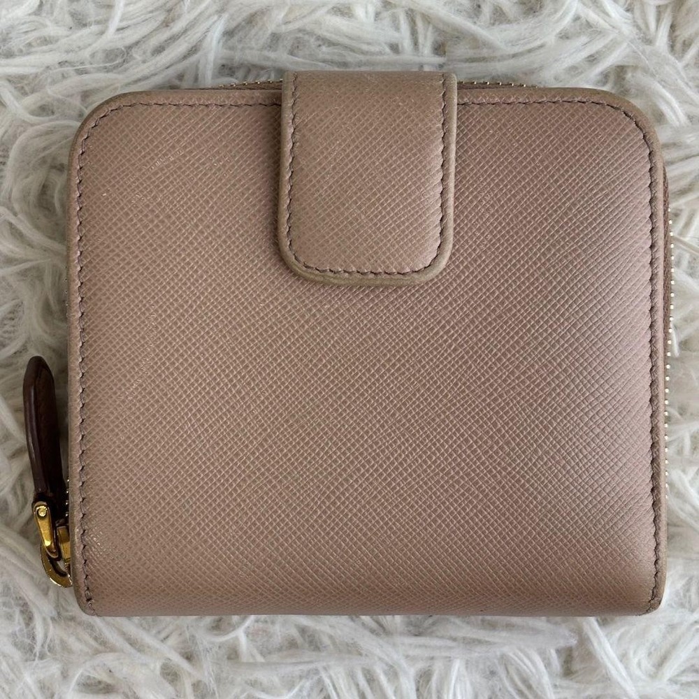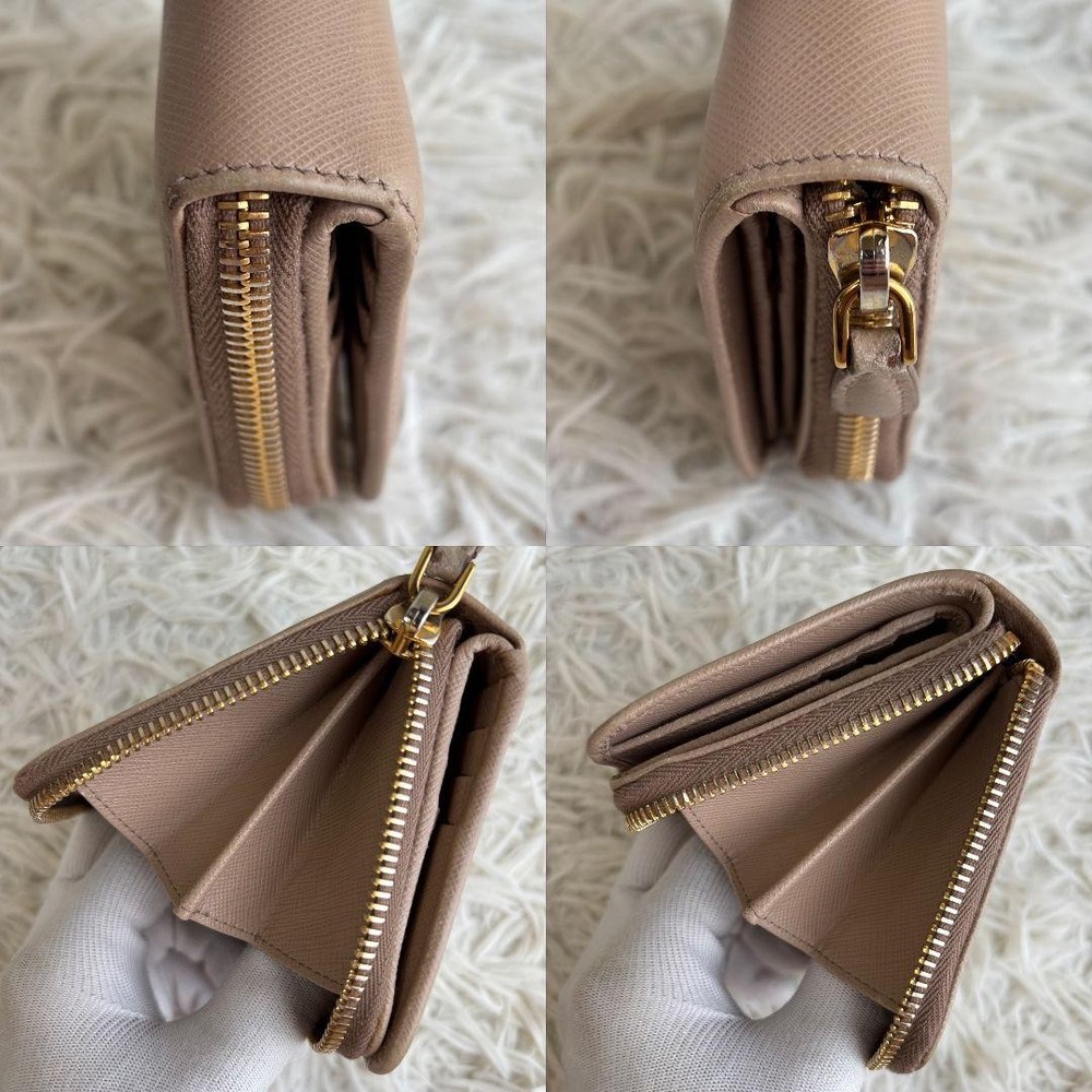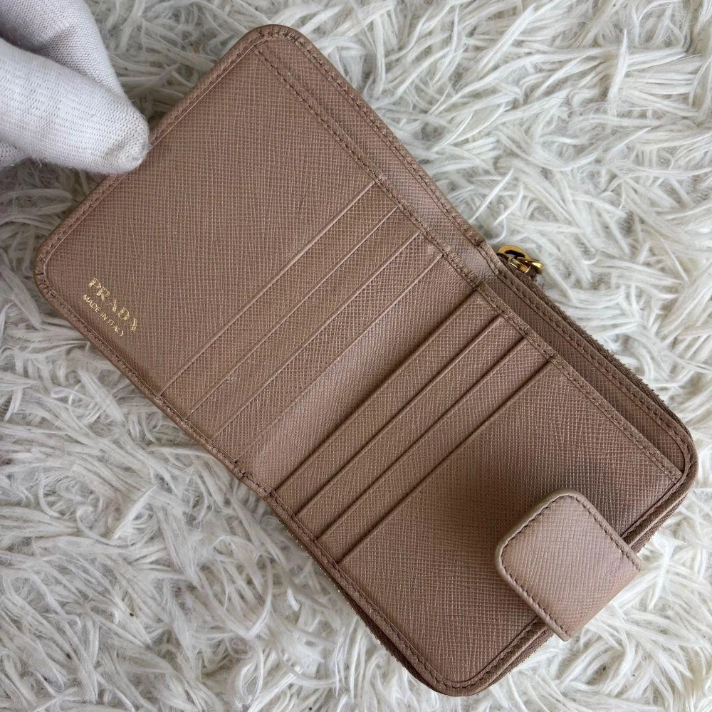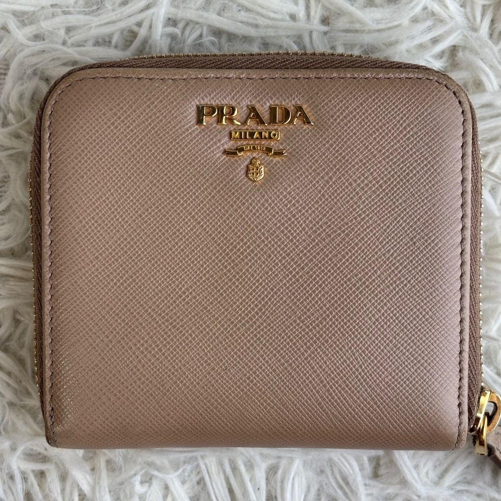 Prada Saffiano Bifold Wallet Cameo Beige Logo Hardware Used Key Features - Brand: Prada - Product: Compact Bi-fold Wallet - Model: CAMMEO - Features: Saffiano leather in beige, round logo hardware, zipper closure - Condition: Used, coin pocket repaired with a patch (see photo 8). No significant scratches or stains. Overall very clean and well-maintained. - Size: Approximately 11 x 10 x 3 cm (4.3 x 3.9 x 1.2 inches). Open length about 19 cm (7.5 inches). - Note: Please allow slight measurement variations due to manual measurement. No accessories are included unless noted in the title or product description. If you have any questions, please ask before purchasing. - Packaging: Simple packaging, shipped within 1-2 days. May be compressed during shipping. Specifications Brand Prada Country Japan Color Beige Accents Logo Pattern Logo Product Description Item Title Prada Bifold Wallet Saffiano Logo Hardware Cameo Beige Payment Supports managed payments Please pay within 5 days after auction is finished. About Us We are located in Japan. It's our pleasure to make you happy by proposing our recommend item. If you have any questions or request about items, please feel free to ask us. International Buyers - Please Note: -Import duties, taxes, and charges are not included in the item price or shipping charges. These charges are the buyer's responsibility. -Please check with your country's customs office to determine what these additional costs will be prior to bidding/buying. -These charges are normally collected by the delivering freight (shipping) company or when you pick the item up - do not confuse them for additional shipping charges. -We do not mark merchandise values below value or mark items as - gifts - The US and International government regulations prohibit such behavior. Thank you for your understanding.