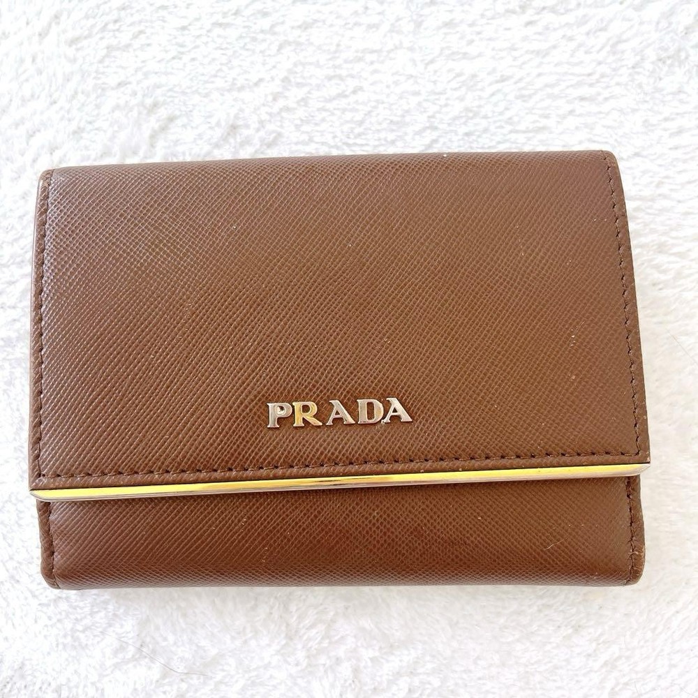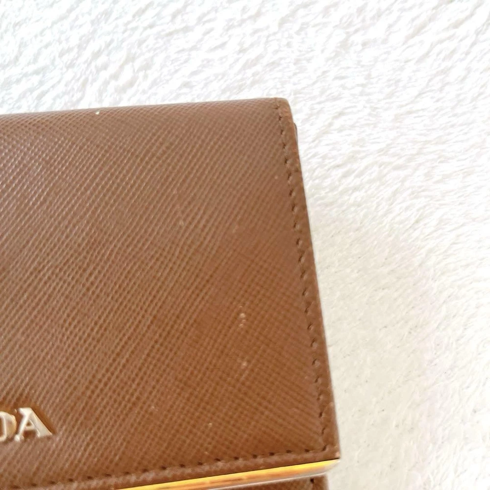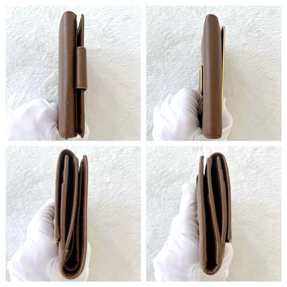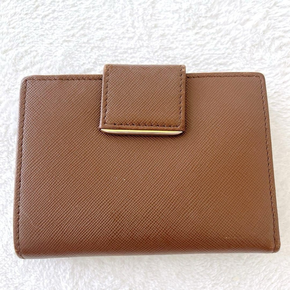 Prada Saffiano Bifold Wallet Brown Gold Leather Unisex Used Key Features - Brand: Prada - Product: Saffiano Leather Bifold Wallet - Color: Brown with Gold accents - Material: Genuine leather - Size: approximately 4.84 inches (12.3 cm) wide x 3.54 inches (9 cm) high x 0.59 inches (1.5 cm) deep - Features: Button closure, 1 coin pocket, 1 bill compartment, 7 card slots - Condition: Used, with minor scratches and tarnishing on logo hardware; overall good condition with signs of use - Notes: Please understand this is a pre-owned item. No accessories are included unless noted. If you have any questions, please ask before purchasing. Specifications Brand Prada Country Japan Color Brown Material Leather Product Description Item Title Prada Saffiano Bifold Wallet Brown Gold Dual Unisex Payment Supports managed payments Please pay within 5 days after auction is finished. About Us We are located in Japan. It's our pleasure to make you happy by proposing our recommend item. If you have any questions or request about items, please feel free to ask us. International Buyers - Please Note: -Import duties, taxes, and charges are not included in the item price or shipping charges. These charges are the buyer's responsibility. -Please check with your country's customs office to determine what these additional costs will be prior to bidding/buying. -These charges are normally collected by the delivering freight (shipping) company or when you pick the item up - do not confuse them for additional shipping charges. -We do not mark merchandise values below value or mark items as - gifts - The US and International government regulations prohibit such behavior. Thank you for your understanding.