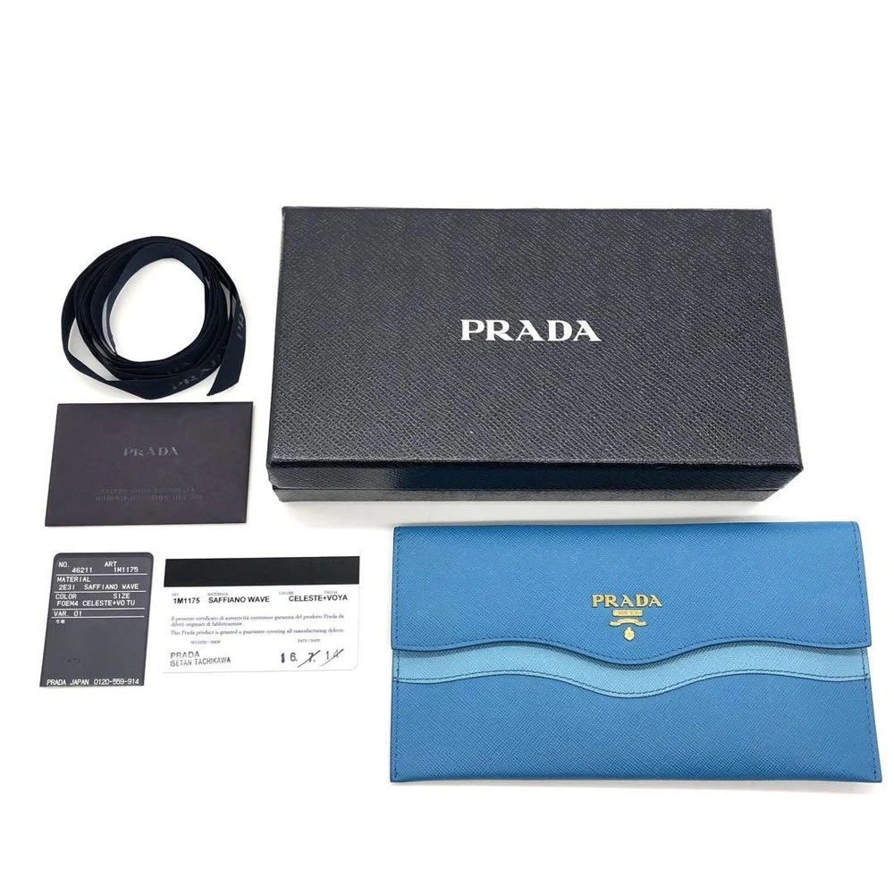 Prada Saffiano Envelope Wallet with Metal Logo Used Key Features - Brand: Prada - Product: Bifold Long Wallet - Model: Envelope Style, Bicolor, Saffiano Wave Leather - Size: approximately 4.13 inches (10.5 cm) high x 7.87 inches (20 cm) wide x 0.39 inches (1 cm) thick - Features: Card slots (3), bill compartment (1), coin pocket (1) - Condition: Light signs of use, well-maintained, minimal wear - Color: Blue tone - Material: Genuine leather - Notes: No accessories are included unless noted in the title or product description. If you have any questions, please ask before purchasing. Items are shipped in simple packaging within 1-2 days; delays may occur due to work. Please understand that minor creases or wrinkles from storage may be present. This is a verified product from a trusted resale and appraisal store. Specifications Brand Prada Country Japan Theme Metal Accents Logo Pattern Logo Product Description Item Title Grade/Accessories Included Prada Envelope Wallet Saffiano Metal Logo Payment Supports managed payments Please pay within 5 days after auction is finished. About Us We are located in Japan. It's our pleasure to make you happy by proposing our recommend item. If you have any questions or request about items, please feel free to ask us. International Buyers - Please Note: -Import duties, taxes, and charges are not included in the item price or shipping charges. These charges are the buyer's responsibility. -Please check with your country's customs office to determine what these additional costs will be prior to bidding/buying. -These charges are normally collected by the delivering freight (shipping) company or when you pick the item up - do not confuse them for additional shipping charges. -We do not mark merchandise values below value or mark items as - gifts - The US and International government regulations prohibit such behavior. Thank you for your understanding.