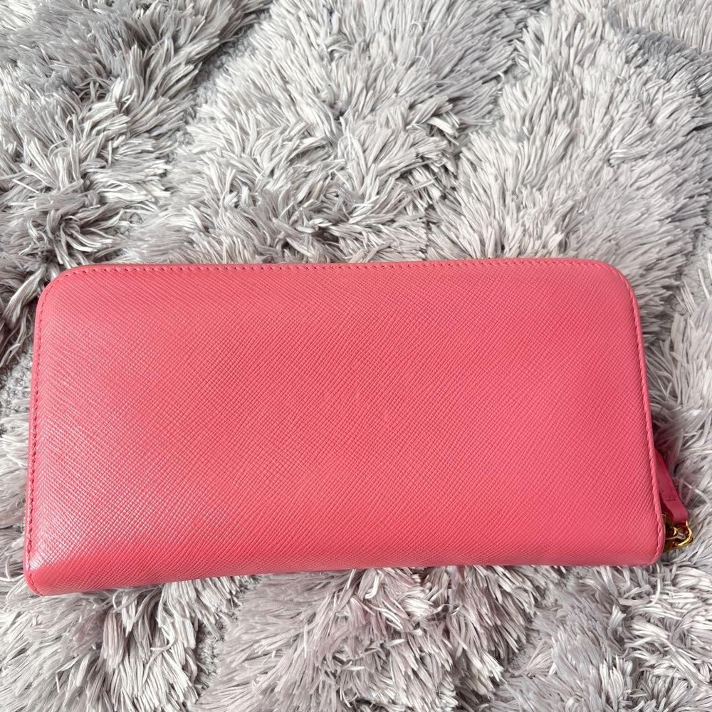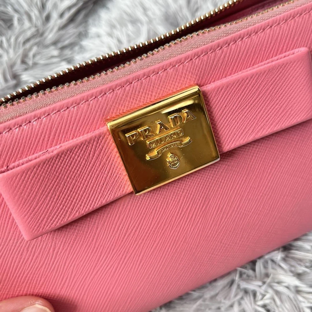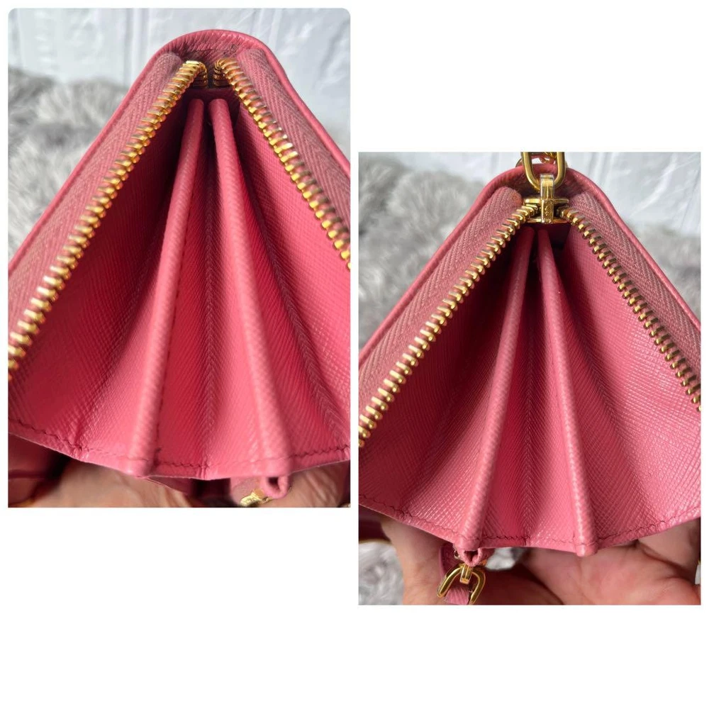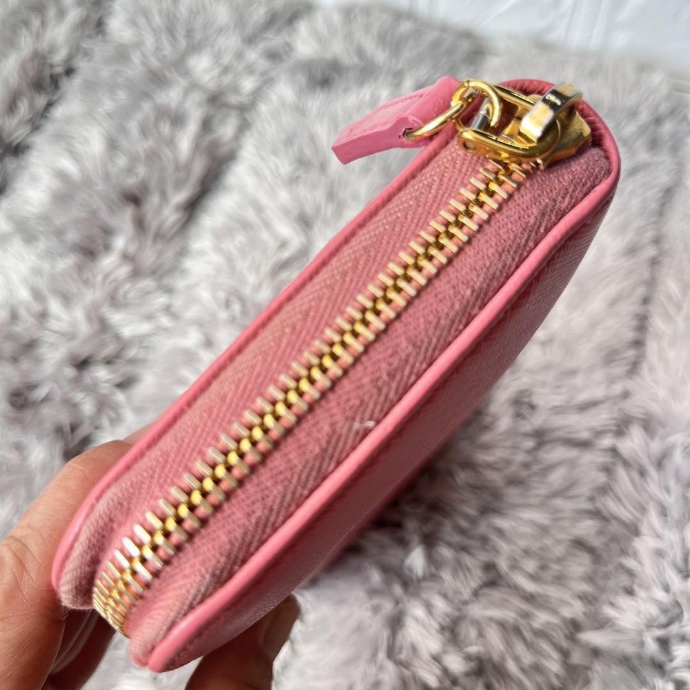 Prada Saffiano Round Zip Wallet Peach Pink Metal Logo Used Key Features - Brand: Prada - Product: Round zipper wallet with metal logo, saffiano leather line - Color: Pink tones - Size: approximately 4.33 inches (11 cm) high x 7.87 inches (20 cm) wide x 0.79 inches (2 cm) depth - Condition: Used, cleaned, repaired, with color coating and water-repellent treatment - Features: Thick, sturdy, weighty, with minor signs of use such as zipper and interior stains; external flap replaced with non-original part matching original color; logo hardware has minor scratches but is in good condition - Additional info: No accessories are included unless noted in the title or product description. If you have any questions, please ask before purchasing. Specifications Brand Prada Country Japan Theme Metal Accents Logo Pattern Logo Product Description Item Title Prada Metal Plate Ribbon Saffiano Round Zip Peach Pink Payment Supports managed payments Please pay within 5 days after auction is finished. About Us We are located in Japan. It's our pleasure to make you happy by proposing our recommend item. If you have any questions or request about items, please feel free to ask us. International Buyers - Please Note: -Import duties, taxes, and charges are not included in the item price or shipping charges. These charges are the buyer's responsibility. -Please check with your country's customs office to determine what these additional costs will be prior to bidding/buying. -These charges are normally collected by the delivering freight (shipping) company or when you pick the item up - do not confuse them for additional shipping charges. -We do not mark merchandise values below value or mark items as - gifts - The US and International government regulations prohibit such behavior. Thank you for your understanding.