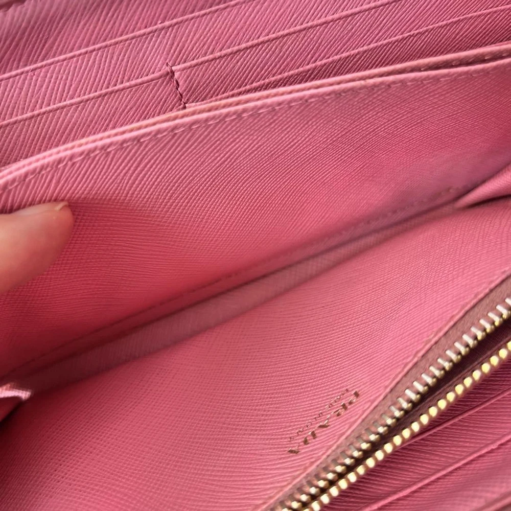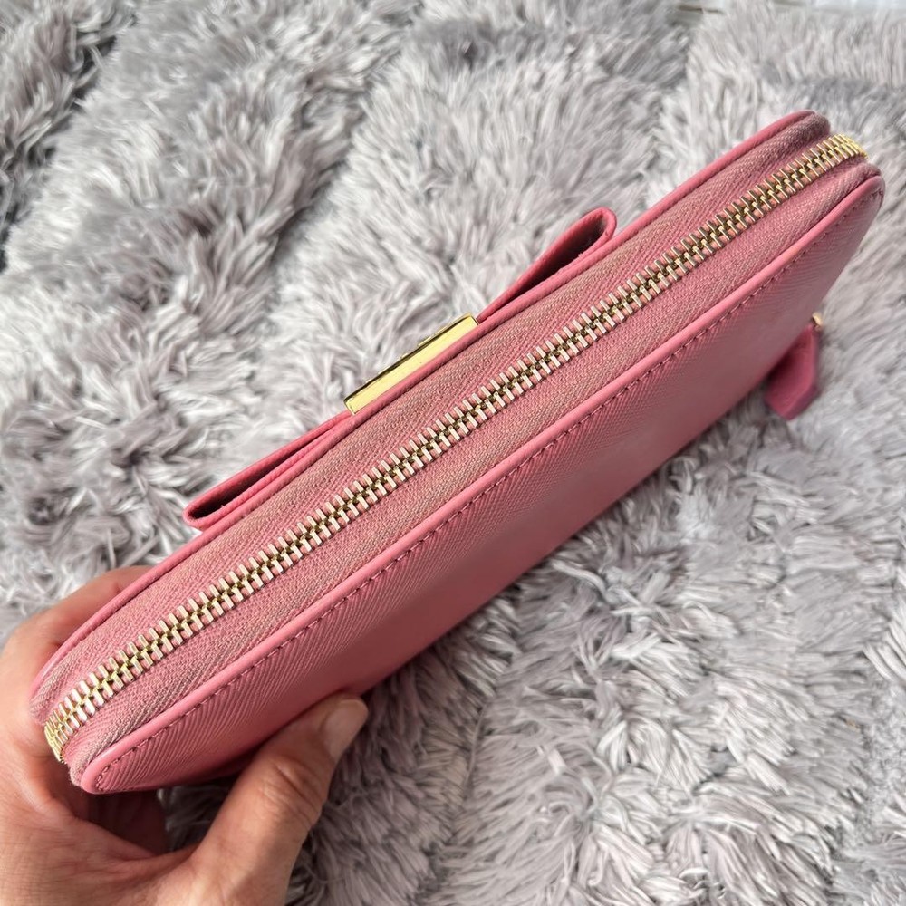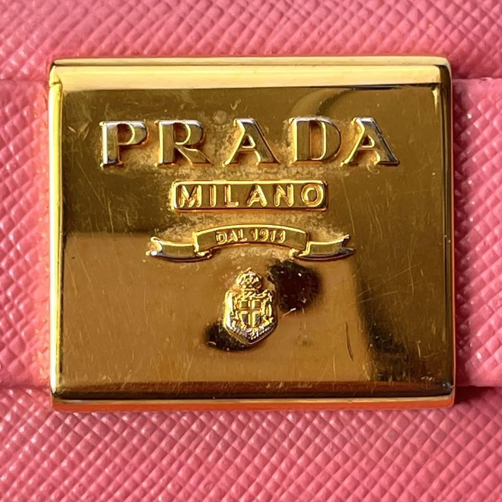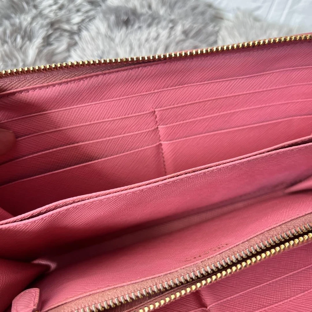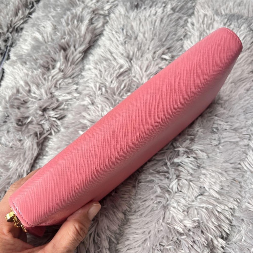 Prada Saffiano Round Zip Wallet Peach Pink Metal Logo Used Key Features - Brand: Prada - Product: Round zipper wallet with metal logo, saffiano leather line - Color: Pink tones - Size: approximately 4.33 inches (11 cm) high x 7.87 inches (20 cm) wide x 0.79 inches (2 cm) depth - Condition: Used, cleaned, repaired, with color coating and water-repellent treatment - Features: Thick, sturdy, weighty, with minor signs of use such as zipper and interior stains; external flap replaced with non-original part matching original color; logo hardware has minor scratches but is in good condition - Additional info: No accessories are included unless noted in the title or product description. If you have any questions, please ask before purchasing. Specifications Brand Prada Country Japan Theme Metal Accents Logo Pattern Logo Product Description Item Title Prada Metal Plate Ribbon Saffiano Round Zip Peach Pink Payment Supports managed payments Please pay within 5 days after auction is finished. About Us We are located in Japan. It's our pleasure to make you happy by proposing our recommend item. If you have any questions or request about items, please feel free to ask us. International Buyers - Please Note: -Import duties, taxes, and charges are not included in the item price or shipping charges. These charges are the buyer's responsibility. -Please check with your country's customs office to determine what these additional costs will be prior to bidding/buying. -These charges are normally collected by the delivering freight (shipping) company or when you pick the item up - do not confuse them for additional shipping charges. -We do not mark merchandise values below value or mark items as - gifts - The US and International government regulations prohibit such behavior. Thank you for your understanding.