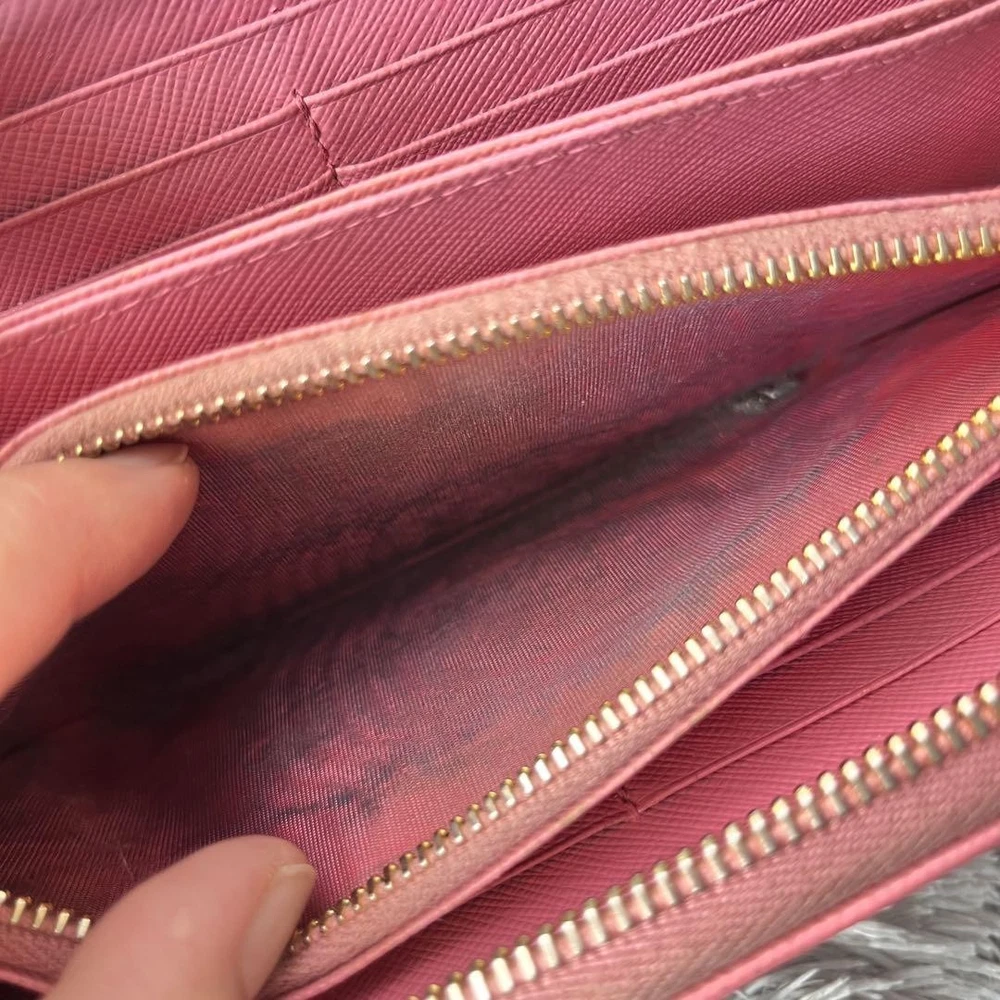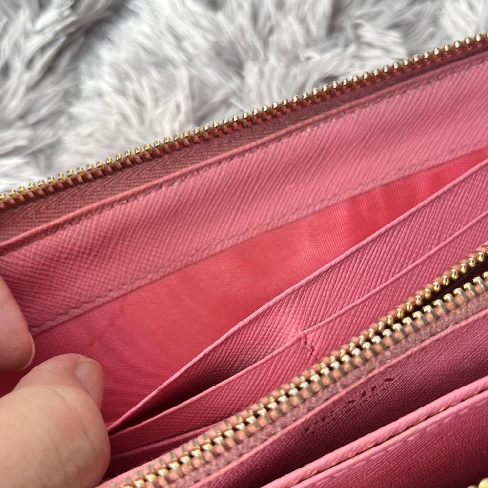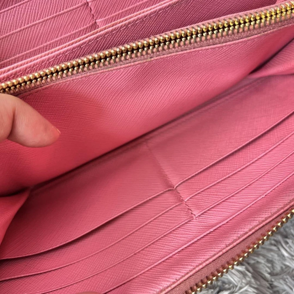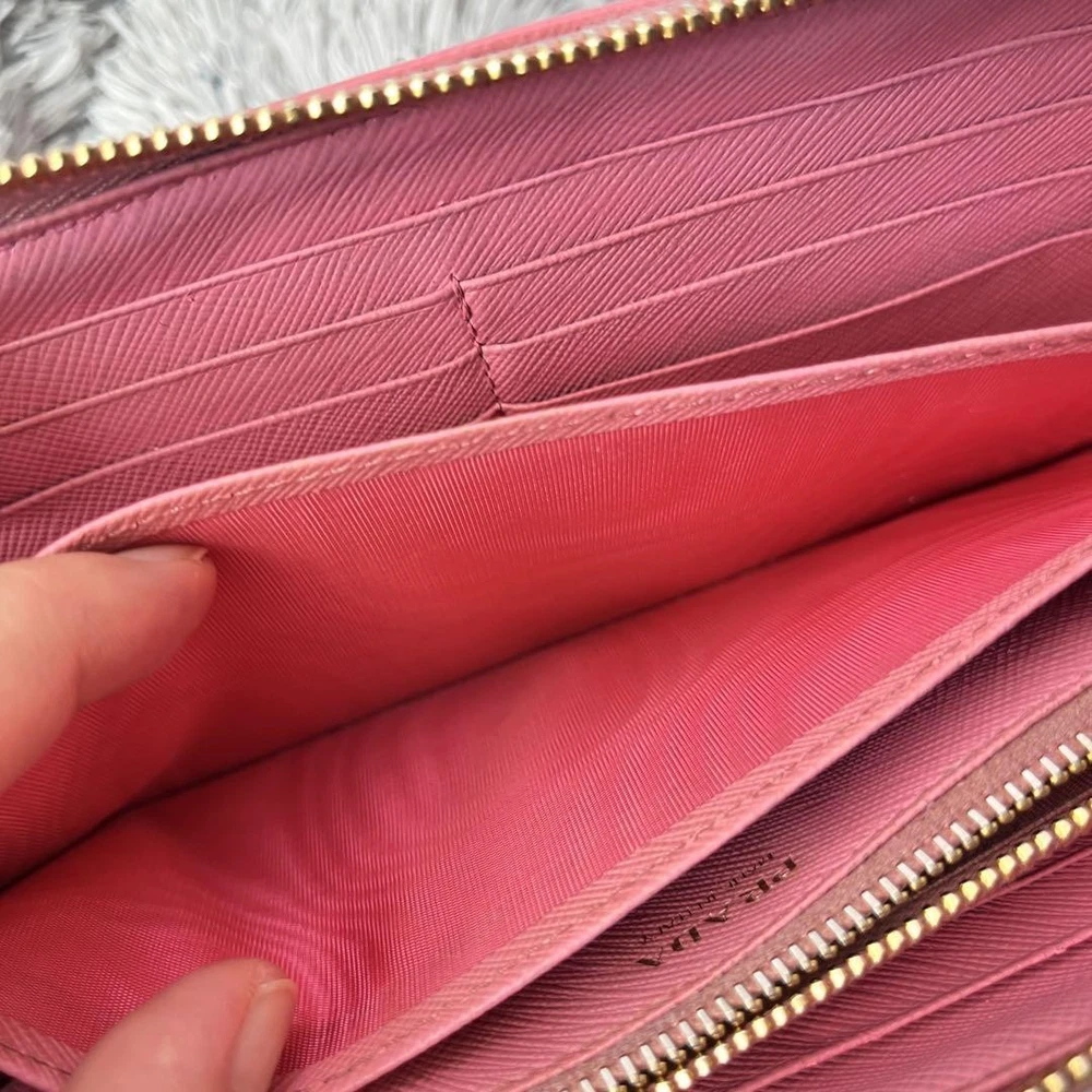 Prada Saffiano Round Zip Wallet Peach Pink Metal Logo Used Key Features - Brand: Prada - Product: Round zipper wallet with metal logo, saffiano leather line - Color: Pink tones - Size: approximately 4.33 inches (11 cm) high x 7.87 inches (20 cm) wide x 0.79 inches (2 cm) depth - Condition: Used, cleaned, repaired, with color coating and water-repellent treatment - Features: Thick, sturdy, weighty, with minor signs of use such as zipper and interior stains; external flap replaced with non-original part matching original color; logo hardware has minor scratches but is in good condition - Additional info: No accessories are included unless noted in the title or product description. If you have any questions, please ask before purchasing. Specifications Brand Prada Country Japan Theme Metal Accents Logo Pattern Logo Product Description Item Title Prada Metal Plate Ribbon Saffiano Round Zip Peach Pink Payment Supports managed payments Please pay within 5 days after auction is finished. About Us We are located in Japan. It's our pleasure to make you happy by proposing our recommend item. If you have any questions or request about items, please feel free to ask us. International Buyers - Please Note: -Import duties, taxes, and charges are not included in the item price or shipping charges. These charges are the buyer's responsibility. -Please check with your country's customs office to determine what these additional costs will be prior to bidding/buying. -These charges are normally collected by the delivering freight (shipping) company or when you pick the item up - do not confuse them for additional shipping charges. -We do not mark merchandise values below value or mark items as - gifts - The US and International government regulations prohibit such behavior. Thank you for your understanding.