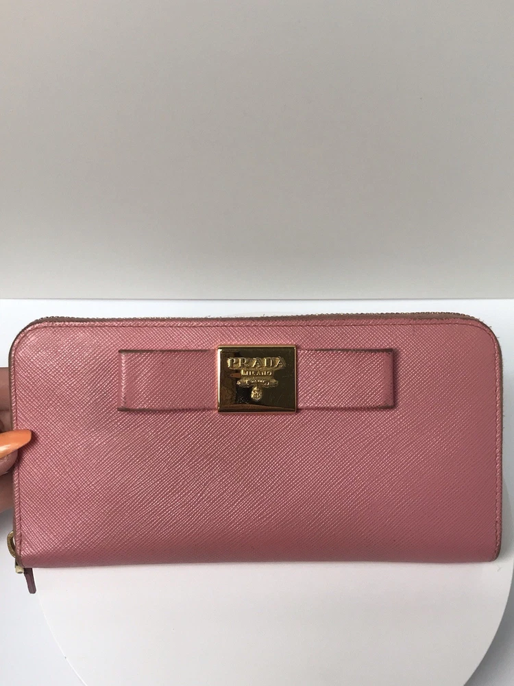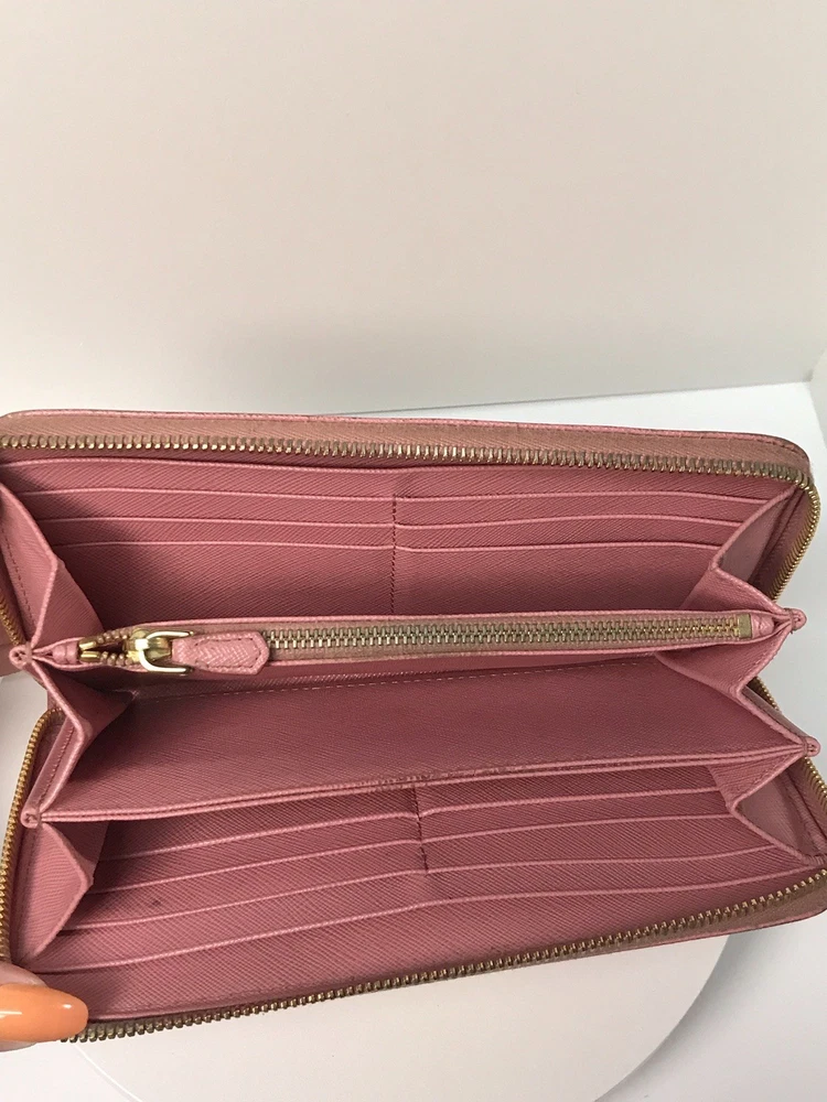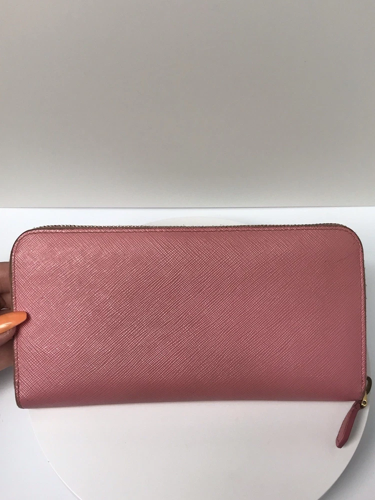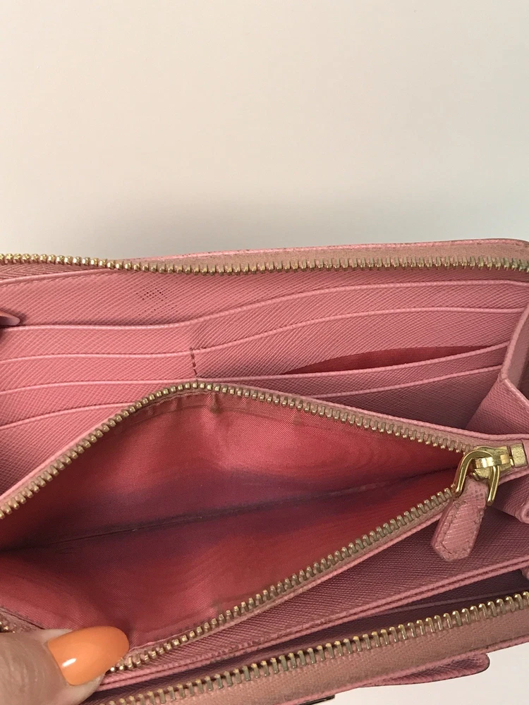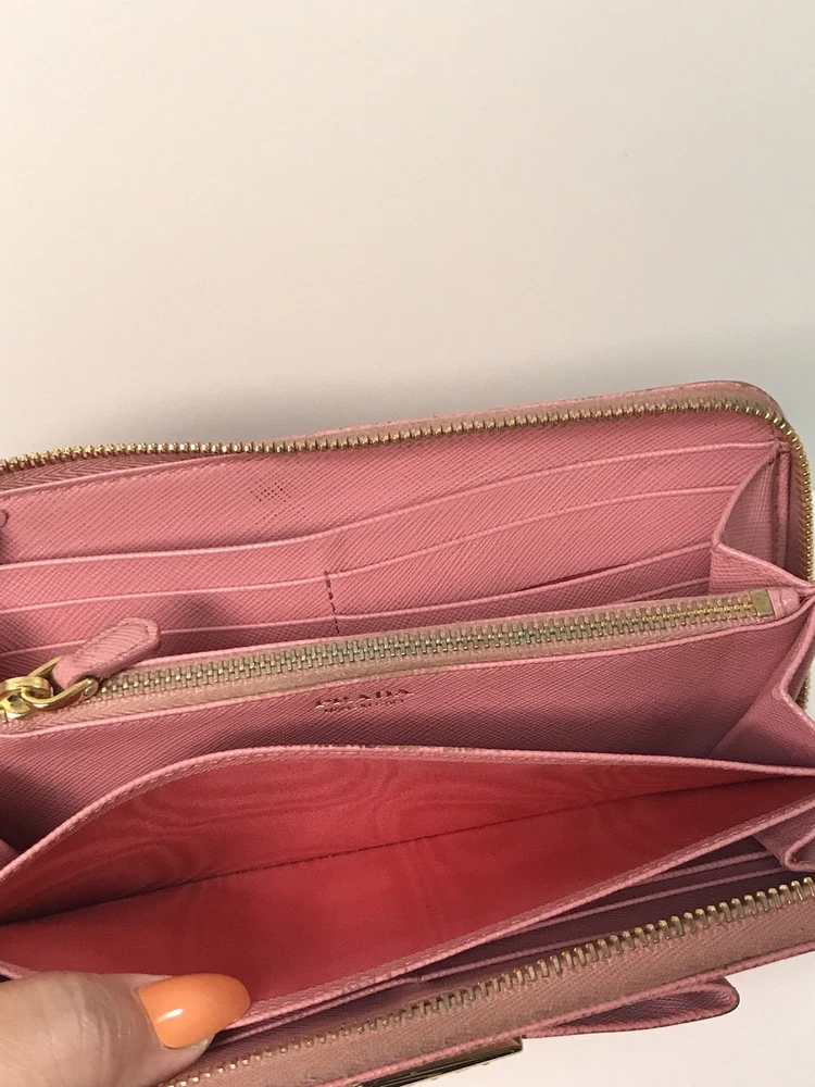 -Condition: Pre-owned ✅ ; in good condition -Comes with box ❤️ -Wear on corners/edges & zipper pull/ribbon; light coin residue/interior small marks -Color: Pink 💕 -Material: Saffiano Leather -PRADA 😍🔥 -Credit card slots -Separated Compartments -Gold Hardware -She’s simply a stunner!!! 🤩❤️🔥✨ -Reasonable offers are welcome 🤗