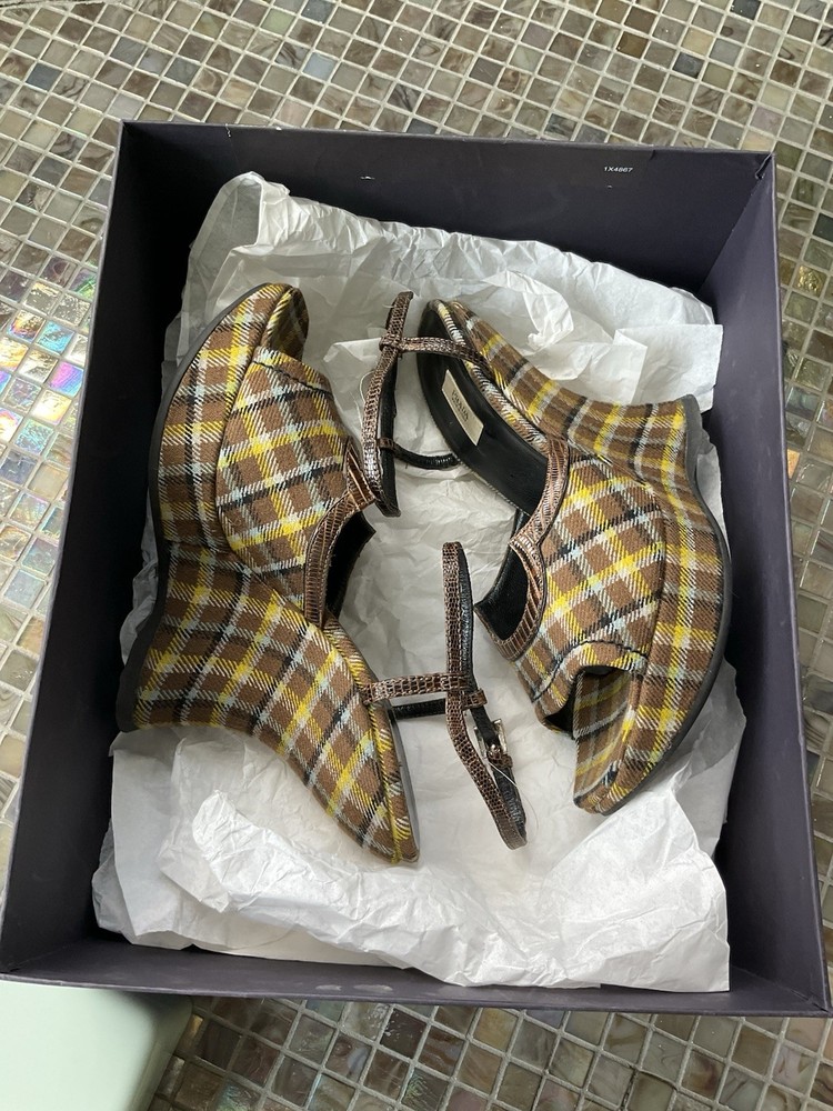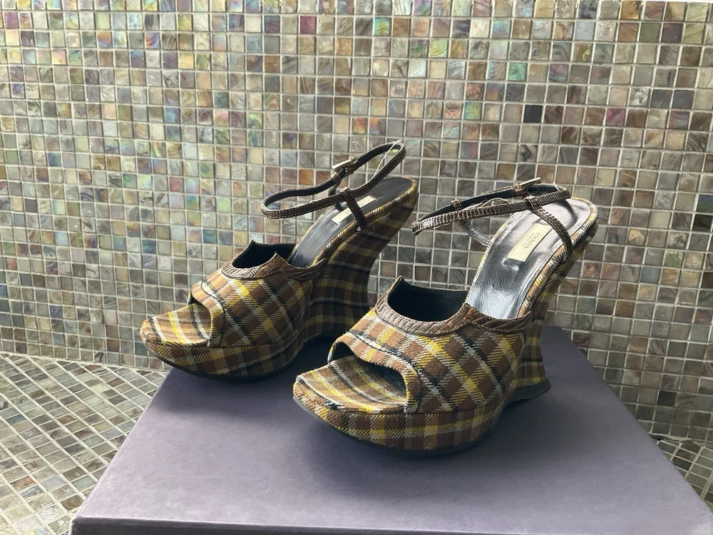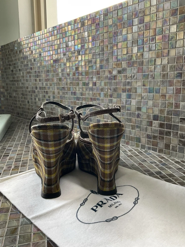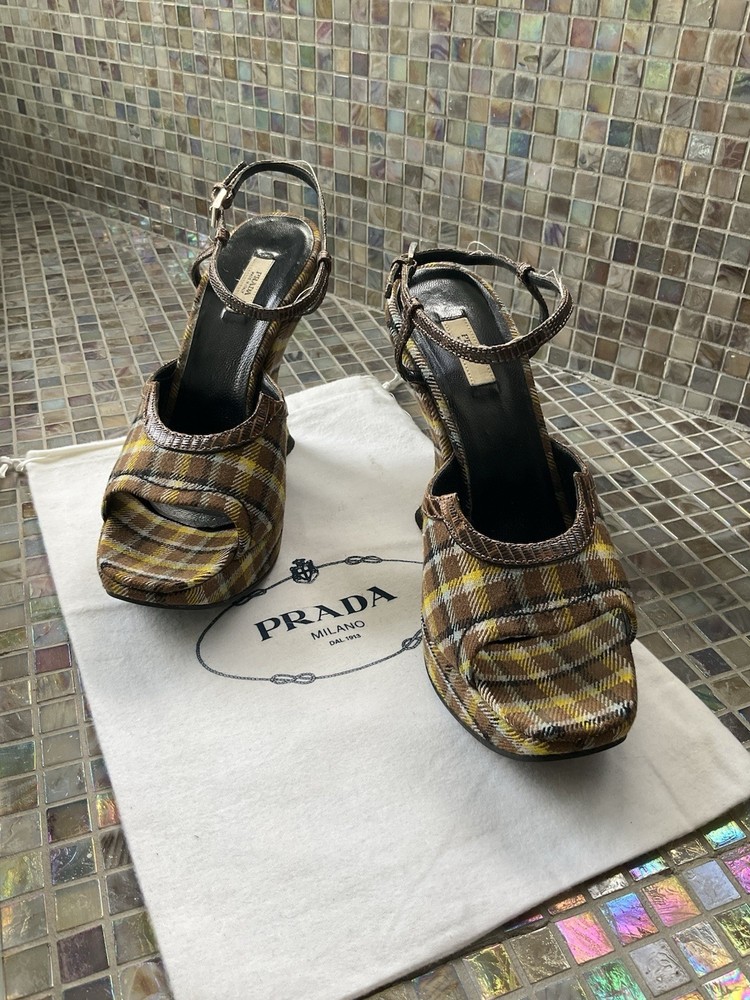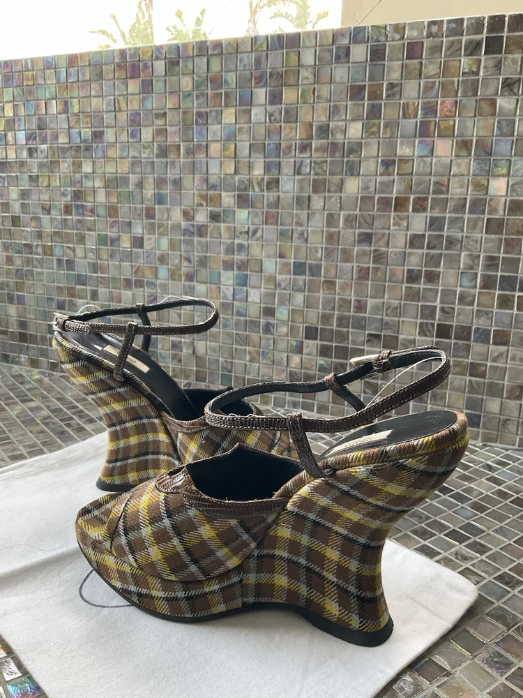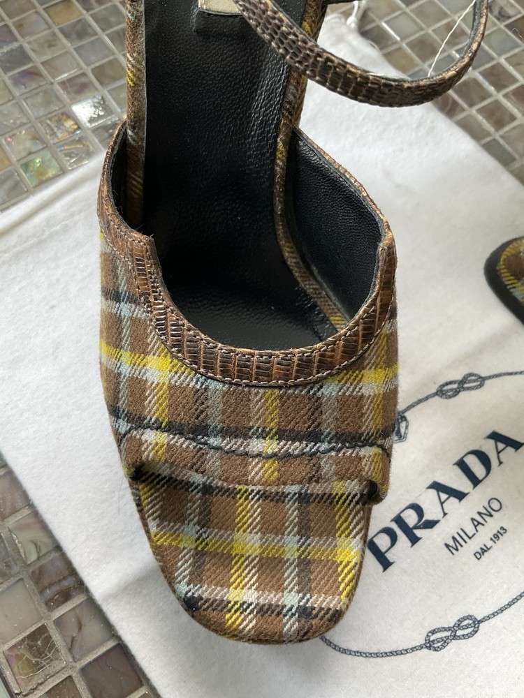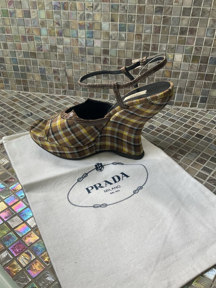 These authentic Prada runway platforms come with their original box. They are New . This was purchased @ the Prada store in Rome Italy- Retail value $1k+. I recently had foot surgery and can no longer wear high heels, so I’m letting go of my designer shoes that no longer fit my current lifestyle. Please check out all other designer items in my store! This beautiful platform style is made with 100% Vichy plaid, featuring a rich textured fabric in shades of brown, blue, yellow, and black, along with a curved heel design approximately 5 inch high. The shoes are in almost perfect condition. They are a size 37 Italian, which translates to a size 7 U.S. These heels are perfect for women who want to add a touch of luxury to their wardrobe. Prada is known for its high-quality products and attention to detail, making these shoes a great investment piece. If you have any questions about this item, including the size or any other details, feel free to contact me.