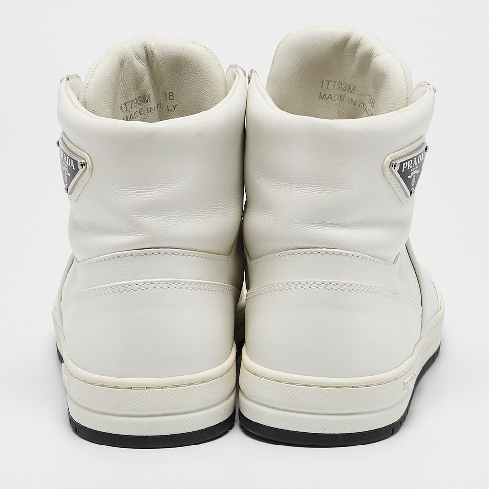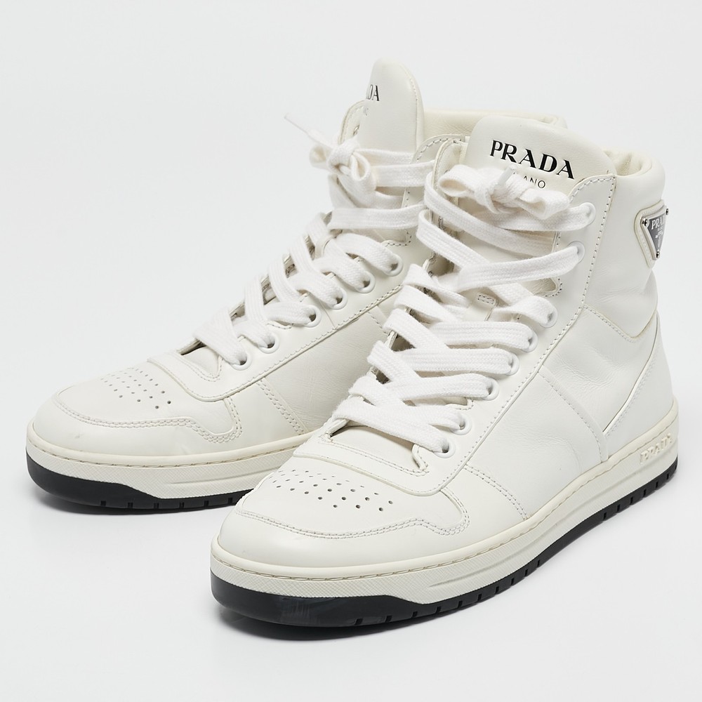 Coming in a classic silhouette, these designer sneakers are a seamless combination of luxury, comfort, and style. These sneakers are finished with signature details and comfortable insoles.Certified by The Luxury Closet - This item has gone through a detailed authentication process overseen by our experts. We offer a lifetime guarantee of authenticity on all our items. Import duties, taxes and charges are not included in the item price. These charges are the buyers responsibility. Please check with your country’s customs office to determine what these additional cost will be prior to buying. Our eBay Store About Us Contact Us Add to Favorite Sellers Prada White Leather New Avenue High Top Sneakers Size 38 $810.7 Coming in a classic silhouette, these designer sneakers are a seamless combination of luxury, comfort, and style. These sneakers are finished with signature details and comfortable insoles. Product Details Brand Color White Dimensions Material Leather Size 38 Outsole Width 10 cm Outsole Length 27 cm Heel Height Includes The Luxury Closet Packaging Certified by The Luxury Closet This item has gone through a detailed authentication process overseen by our experts. We offer a lifetime guarantee of authenticity on all our items. How We Check The in-house team of experts at The Luxury Closet is highly trained to verify the authenticity and the condition of the luxury products. They ensure that only 100% authentic items are put on sale.The evaluation process is unique with its own mix of assessment criteria and differs according to the category. Each item is evaluated based on the following combination of hallmarks, hardware, stitching, symmetry, material, craftsmanship, stamping, codes, hologram stickers, and packaging. Our authenticators also check if the items have been modified or amended (e.g., aftermarket diamonds, replaced batteries, repaired bags, etc.) International Buyers Import duties, taxes and charges are not included in the item price. These charges are the buyers responsibility. Please check with your country’s customs office to determine what these additional cost will be prior to buying.