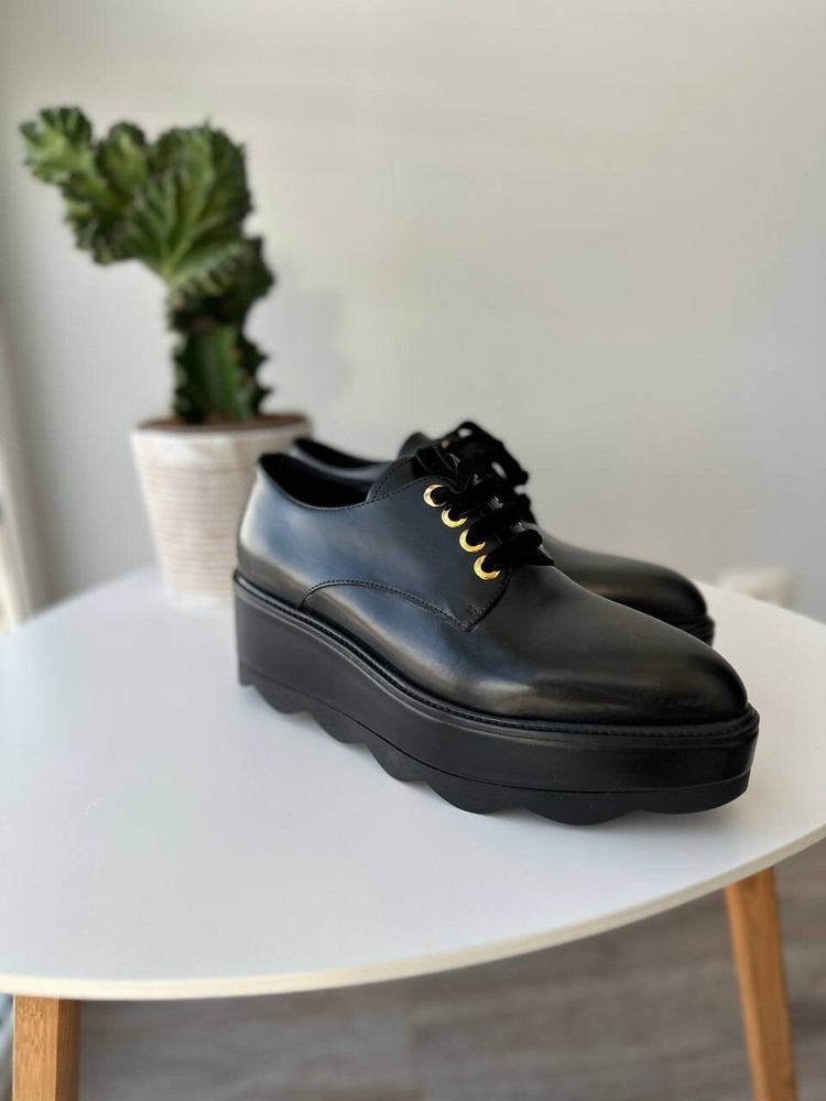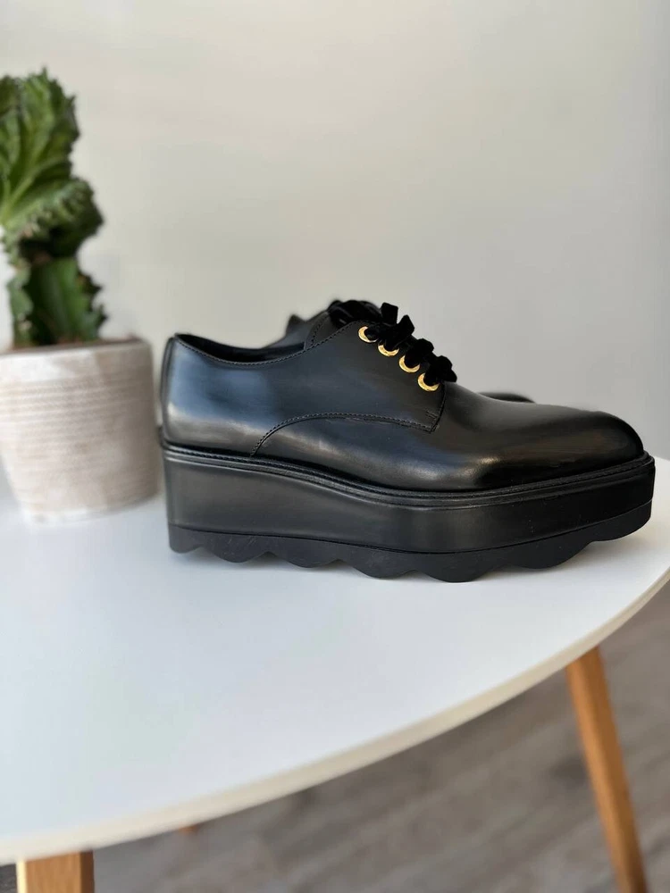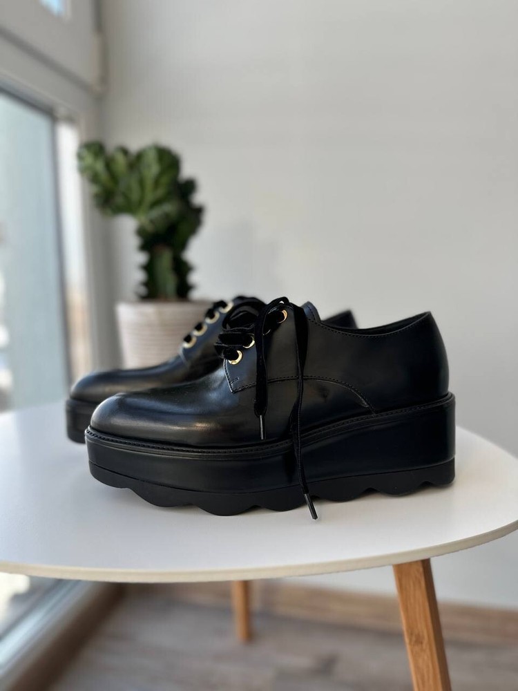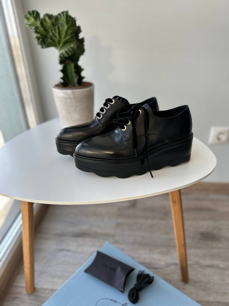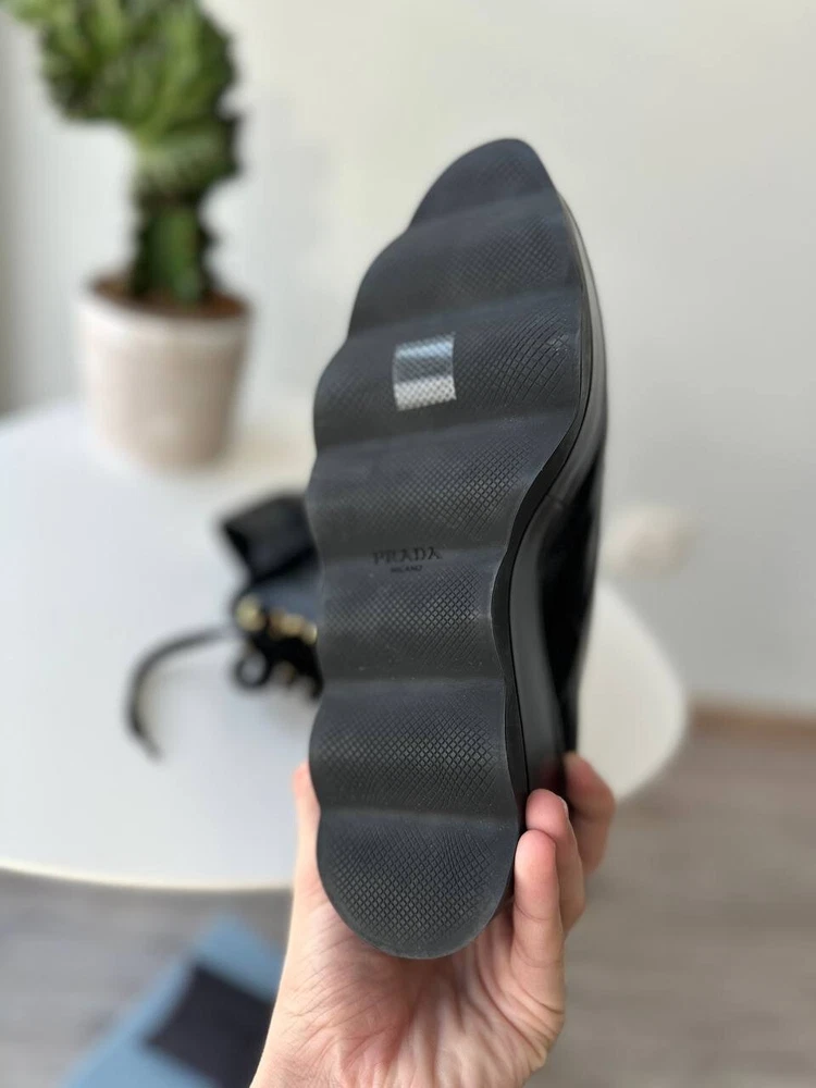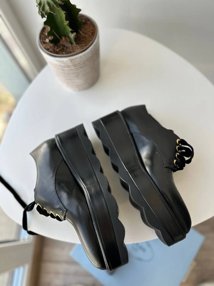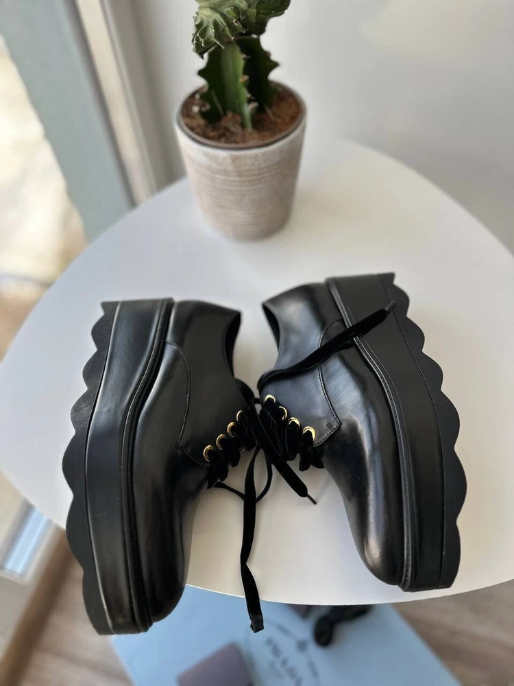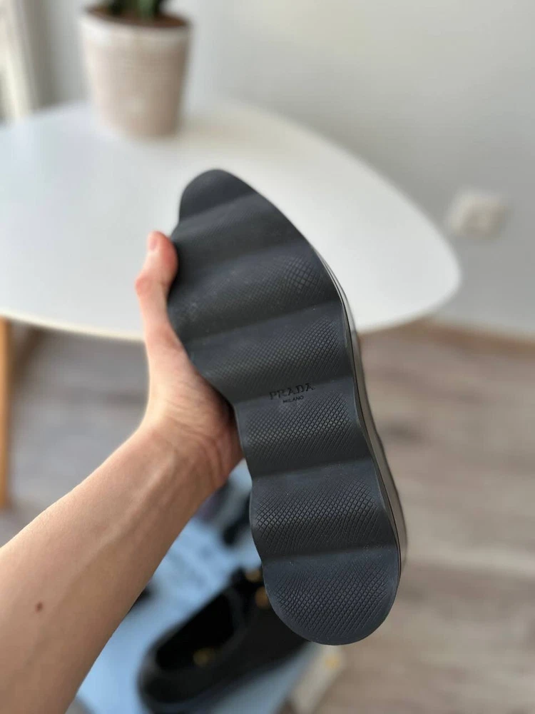 These are Prada women's black platform formal loafers in size 37.5. They are new with box and feature a rare design. Made in Italy, the shoes have a leather upper, lining, and insole. The outsole is also leather. Suitable for activewear, casual or workwear occasions, they are themed around cars, art, Christmas, and more. Perfect for all seasons.