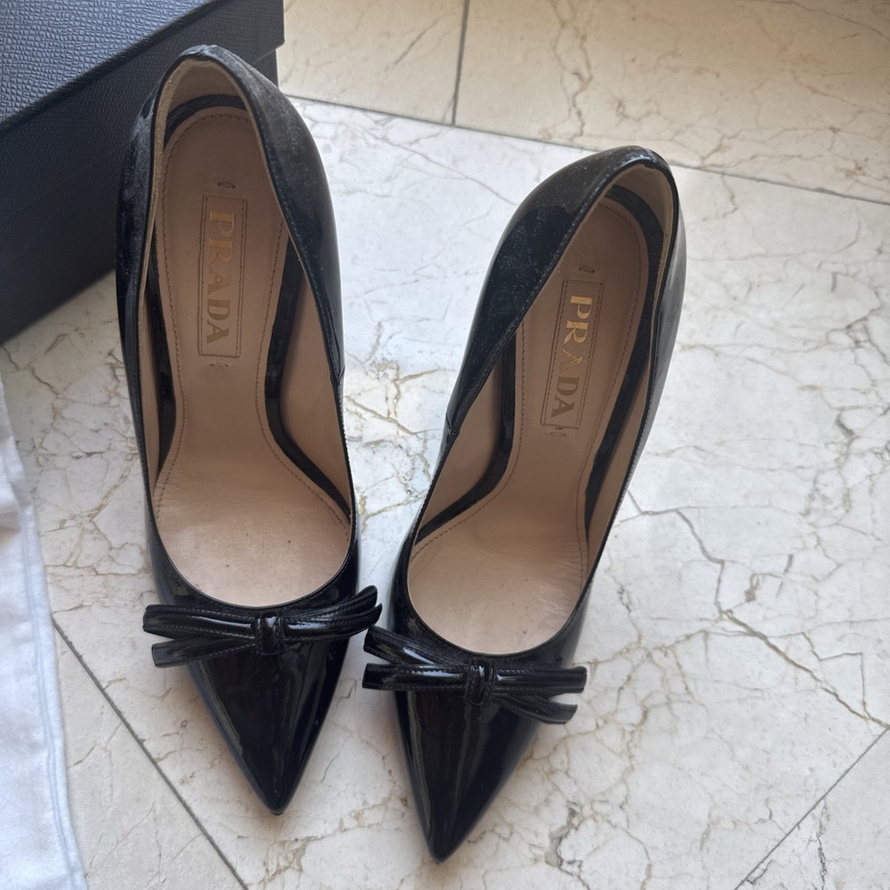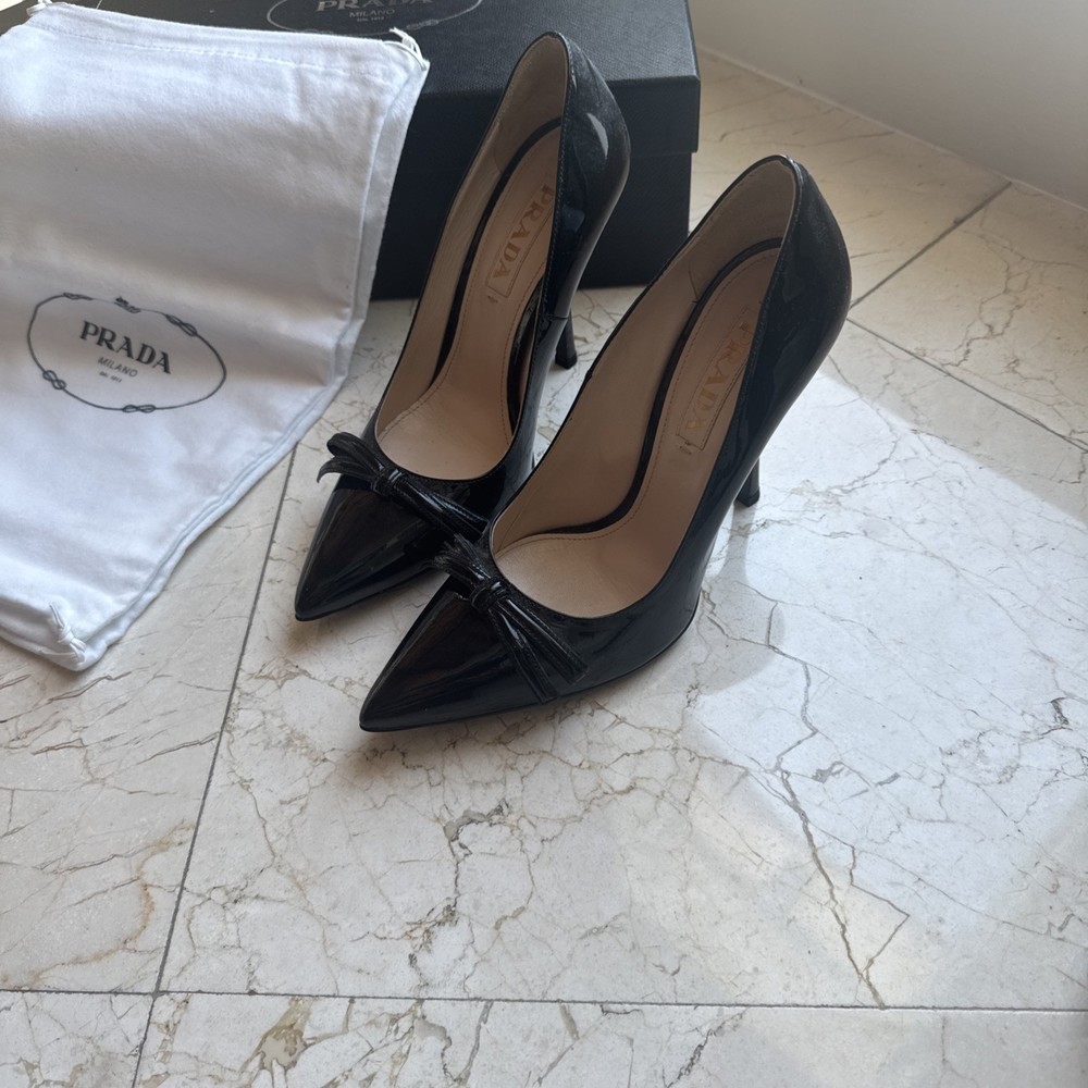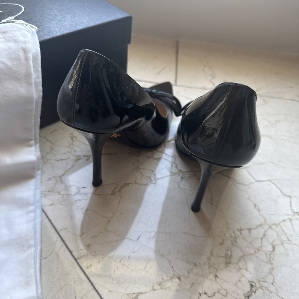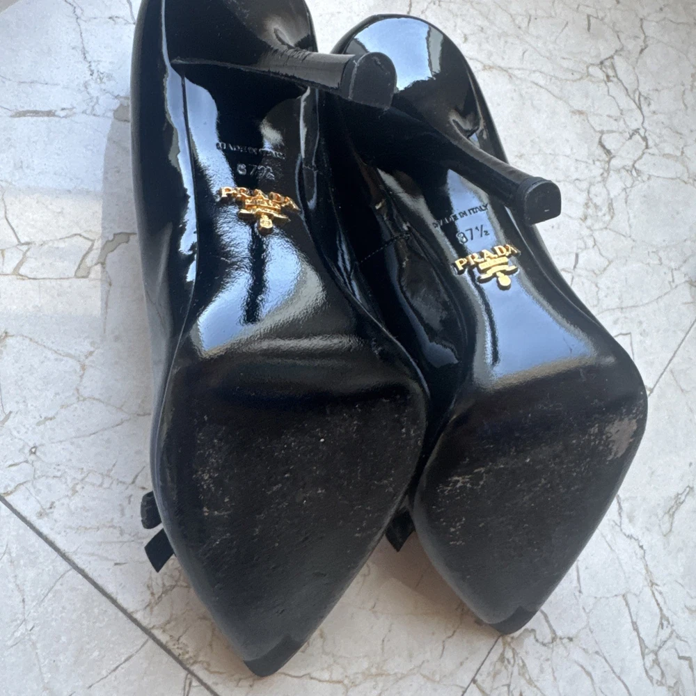 Prada Black Patent Leather Point Toe w/ Small Center Bow & Stiletto Heel Shoes size 37.5 in great condition one worn once or twice