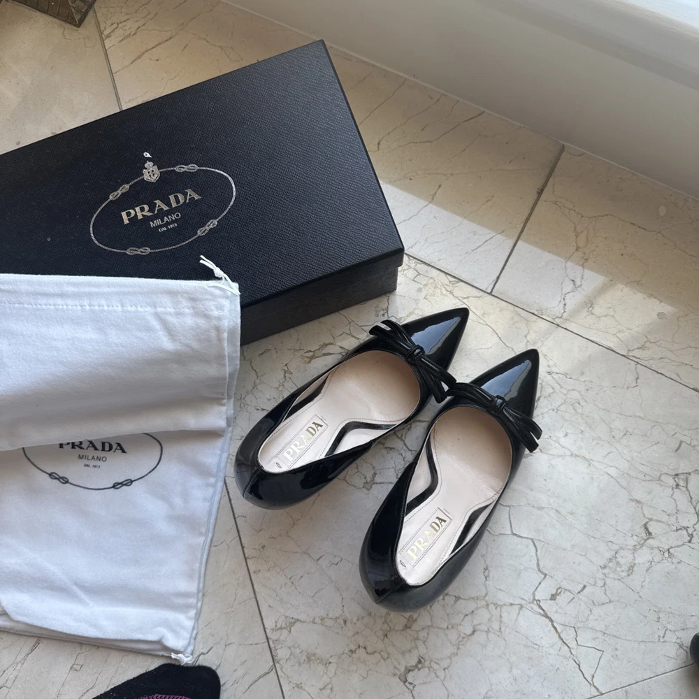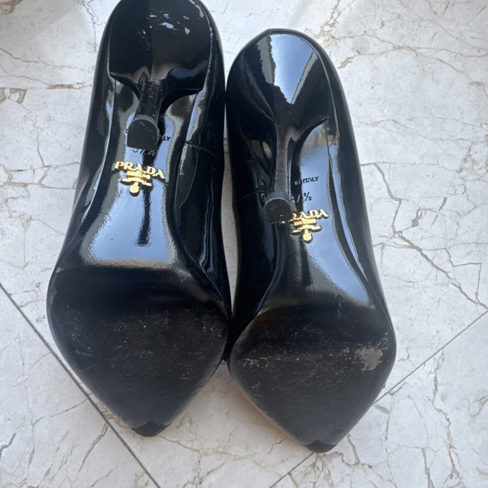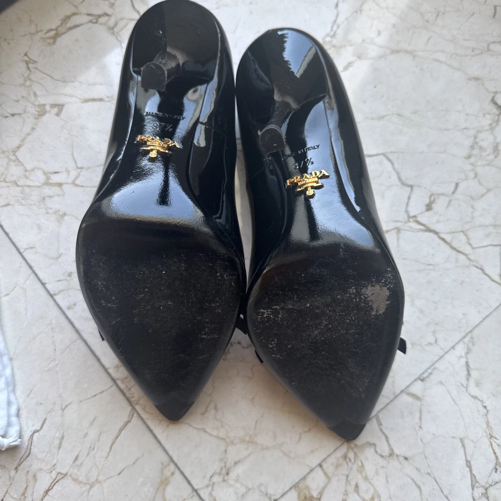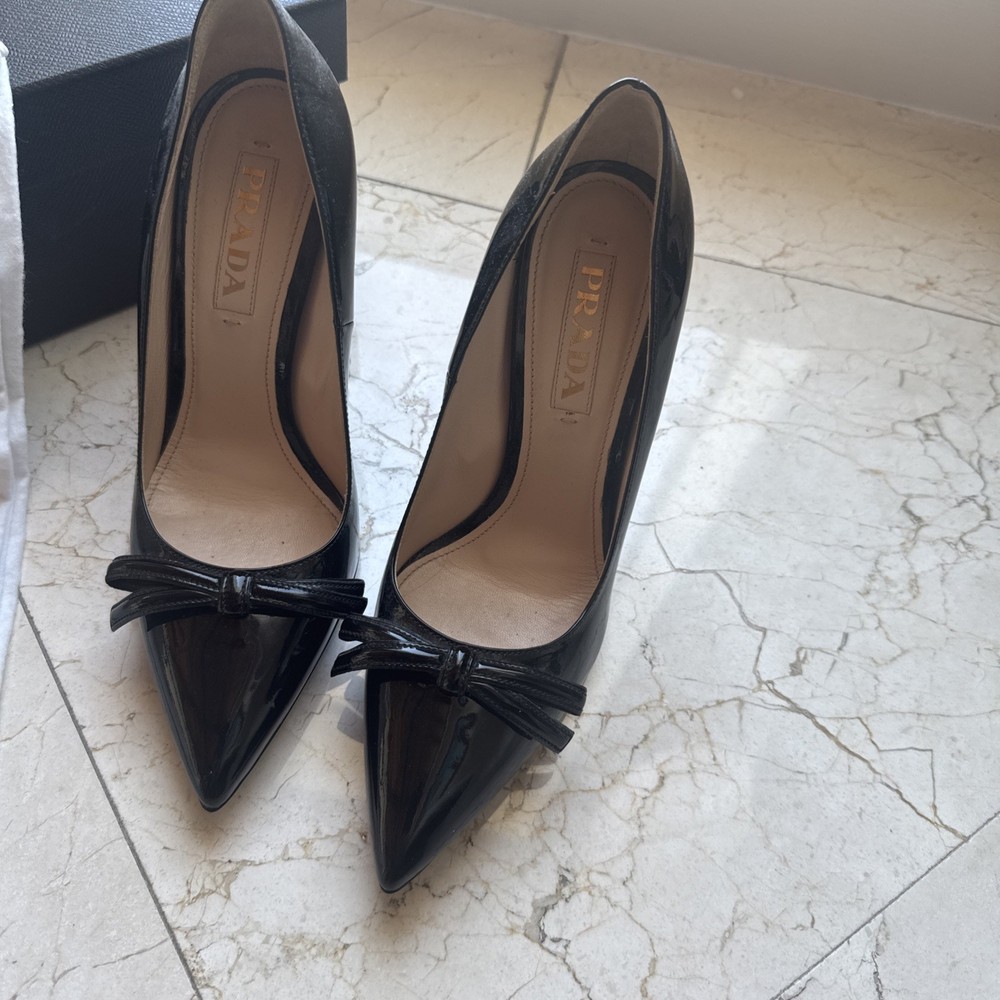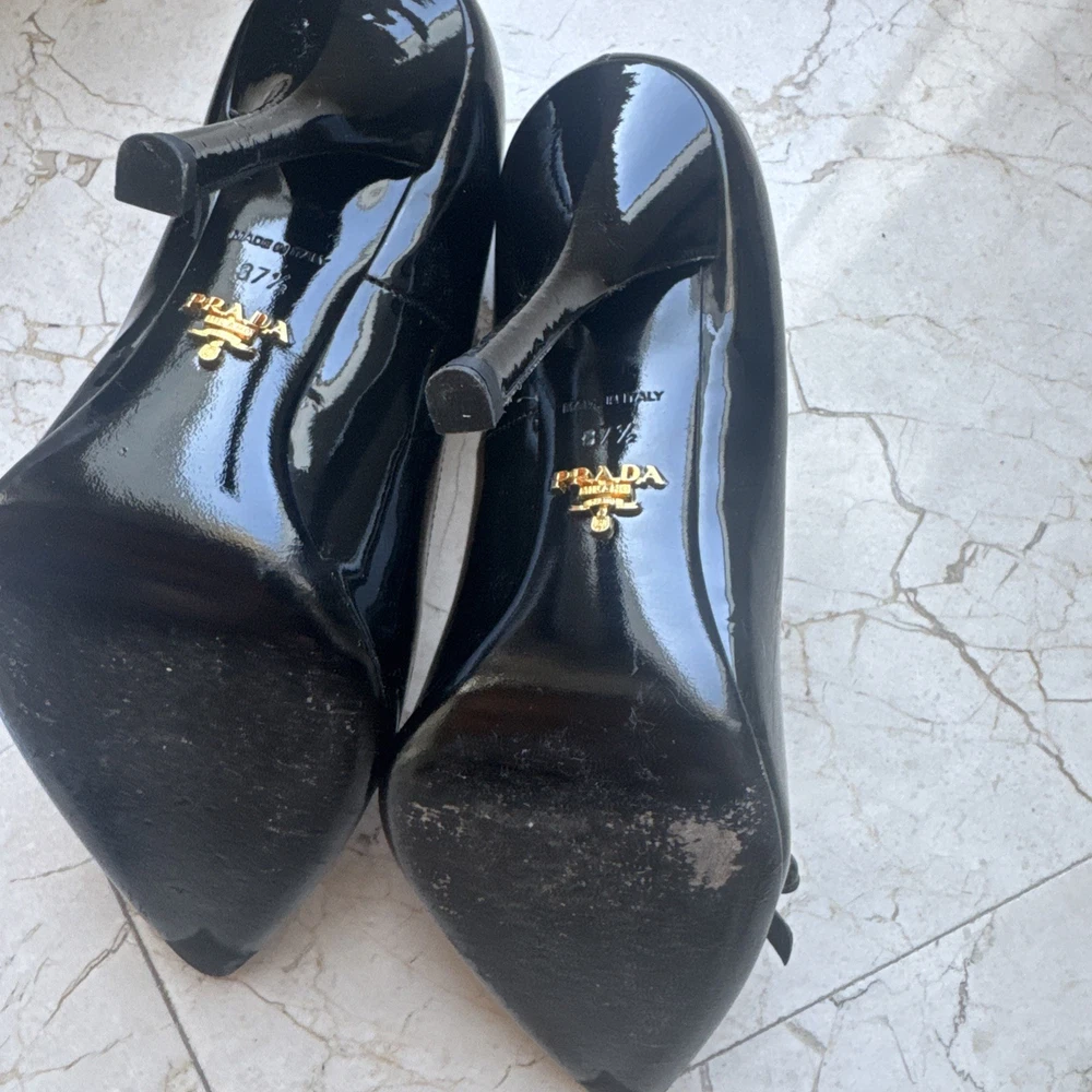 Prada Black Patent Leather Point Toe w/ Small Center Bow & Stiletto Heel Shoes size 37.5 in great condition one worn once or twice