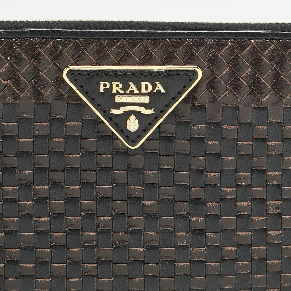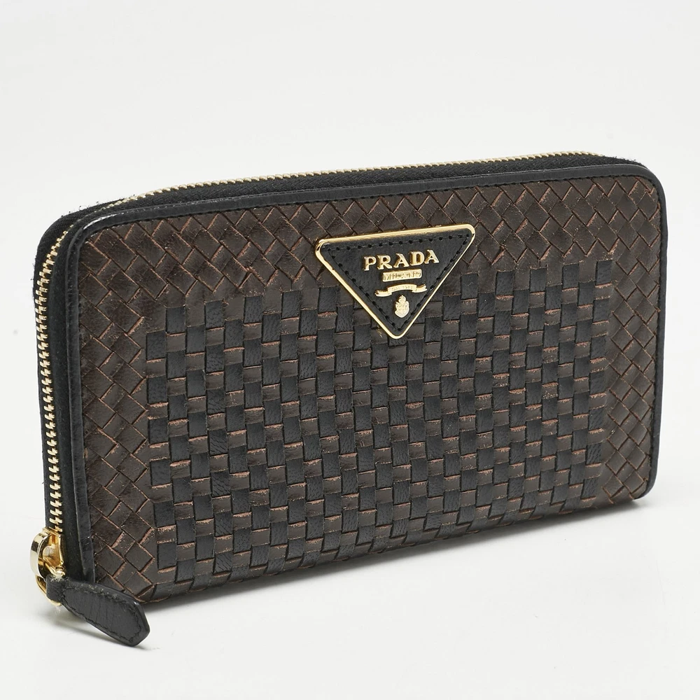 Crafted with intricate precision, this Prada wallet features a sophisticated woven design, seamlessly blending brown and black leather. The luxurious leather exterior complements its durable nylon interior, making it a timeless accessory for the discerning woman. Its sleek zip around closure ensures your essentials are secure while exuding an effortless chic vibe.Certified by The Luxury Closet - This item has gone through a detailed authentication process overseen by our experts. We offer a lifetime guarantee of authenticity on all our items. Import duties, taxes and charges are not included in the item price. These charges are the buyers responsibility. Please check with your country’s customs office to determine what these additional cost will be prior to buying. Our eBay Store About Us Contact Us Add to Favorite Sellers Prada Brown/Black Woven Madras Leather Zip Around Wallet $374 Crafted with intricate precision, this Prada wallet features a sophisticated woven design, seamlessly blending brown and black leather. The luxurious leather exterior complements its durable nylon interior, making it a timeless accessory for the discerning woman. Its sleek zip around closure ensures your essentials are secure while exuding an effortless chic vibe. Product Details Brand Color Brown Dimensions Material Leather Size Outsole Width Outsole Length Heel Height Includes Certified by The Luxury Closet This item has gone through a detailed authentication process overseen by our experts. We offer a lifetime guarantee of authenticity on all our items. How We Check The in-house team of experts at The Luxury Closet is highly trained to verify the authenticity and the condition of the luxury products. They ensure that only 100% authentic items are put on sale.The evaluation process is unique with its own mix of assessment criteria and differs according to the category. Each item is evaluated based on the following combination of hallmarks, hardware, stitching, symmetry, material, craftsmanship, stamping, codes, hologram stickers, and packaging. Our authenticators also check if the items have been modified or amended (e.g., aftermarket diamonds, replaced batteries, repaired bags, etc.) International Buyers Import duties, taxes and charges are not included in the item price. These charges are the buyers responsibility. Please check with your country’s customs office to determine what these additional cost will be prior to buying.