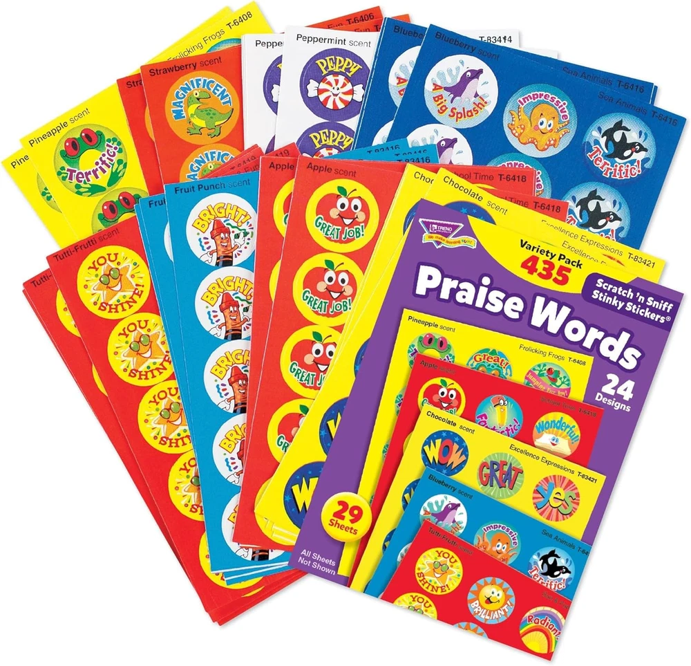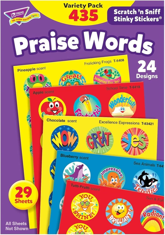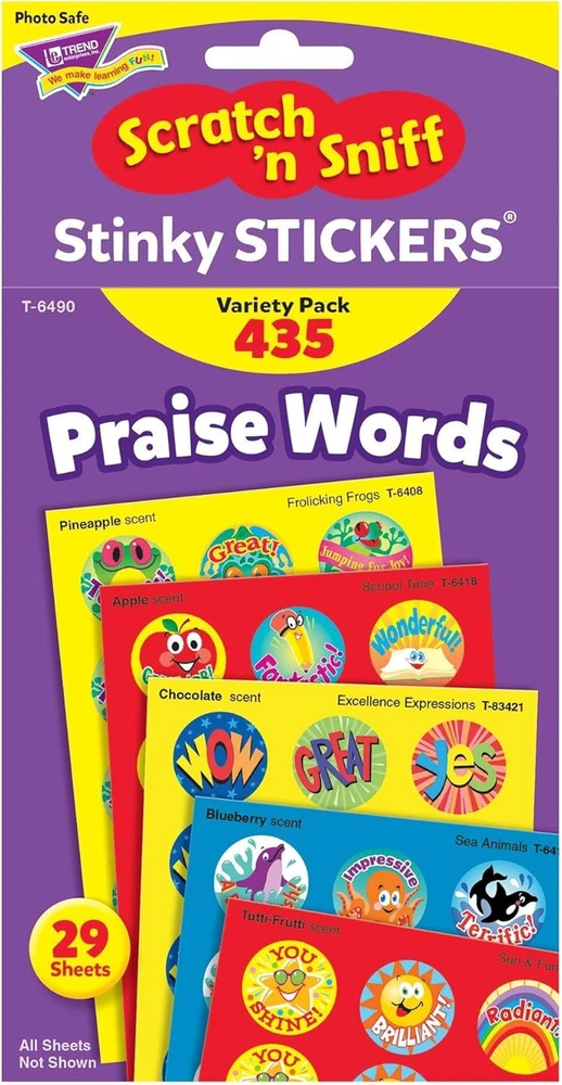 Store New Arrivals Add to Favorite View Feedback Contact : Praise Words, Scented Scratch 'N Sniff Stinky Stickers, Fun for Rewards, Incentives, Crafts and as Collectibles, 24 Different Designs, 29 Sheets Included, for Ages 3 and Up Description Item model number TEPT6490 Product Dimensions 8 x 4.13 x 0.25 inches Country of Origin USA Item Weight 2.4 ounces Manufacturer recommended age 3 years and up Department Pens & Desk Supplies Is Discontinued By Manufacturer No Release date April 4, 2023 Each large, round sticker has a burst of fragrance to be scratched and sniffed Praise words offer a fun way to give out rewards, incentives and collectibles Stickers are acid-free, nontoxic and safe for use on photos We create educational classroom supplies for teachers, parents, and students. Whether in a grade school, a youth group, a day care, homeschooling, or anything in between, our educational supplies bring fun, colorful themes into your learning space. MADE IN USA – All TREND Skill Drill Flash Cards are quality-tested to meet product safety standards and are all proudly made in the USA. Product Description Scratch ’em and sniff ’em for a burst of fragrance! Everyone's favorite Stickers, Stinky Stickers are fun to collect or use to motivate and reward. Designs include excellence expressions, crayons, Dino FUN, peppermints, frogs, sea animals, school time, and sun & fun. Designs may vary. Acid free, nontoxic, and safe for use on photos. 24 designs, 435 Stickers, 8 scents. From the Manufacturer Variety pack of Stinky Stickers with praise words offers a fun way to give out rewards, incentives, and collectibles. Each large round sticker has a burst of fragrance waiting to be scratched and sniffed. Stickers are acid-free, nontoxic, and safe for use on photos. Each sheet has 15 stickers. Actual sticker sheets may vary from photo. Stickers are ideal for kindergarten to third-grade (ages 5 to 8). ABOUT US We offer the best prices around on high quality products. Our E-store includes media such as books, movies, music and games while offering electronics, toys, sporting apparel, clothing, tools, general home, garden items and more. SHIPPING We are always working hard to ensure your package arrives as soon as possible. Please understand that some factors like weather, high postal traffic, and the performance of shipping companies are outside of our control. We offer free shipping to the lower 48 states and ship within 2 business days of payment, usually sooner. We do not accept P.O. Boxes. Please provide a physical address. For shipping outside of the continental USA, we only use eBay's Global Shipping Program.The item is shipped to KY and then sent to the rest of the world. International customers are responsible for all duties and taxes. Continue to check out in order to calculate costs for shipping the item to your country. Messages regarding eBay's Global Shipping Program MUST be directed at eBay EXCLUSIVELY. RETURNS We offer a 30-Day Return Policy on items which you are not completely satisfied with. You have the option for a full-refund or an exchange of the item. No returns are available on items shipped outside of the USA. PAYMENT We accept PayPal. CONTACT US This page content is yet to come Please ad us to your favorite seller and visit again later Thank You CUSTOMER SATISFACTION We try our very best to make sure every customer is completely satisfied. If there's a problem, message us! We're happy to help. WE ACCEPT Copyright © 2021 AutoDS. | All Rights Reserved