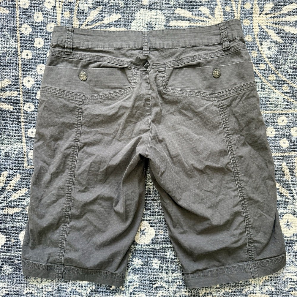 The Prana Cargo Bermuda Hiking Shorts in Charcoal Grey are a versatile and stylish option for outdoor activities. Made from a blend of cotton and spandex, these shorts offer a comfortable fit with a mid-rise and flat front design. The zip closure, slash pockets, and cargo style make them functional for hiking and other outdoor adventures. The dark fabric wash and solid gray color give them a classic and timeless look, perfect for casual or travel occasions in the summer and spring seasons.