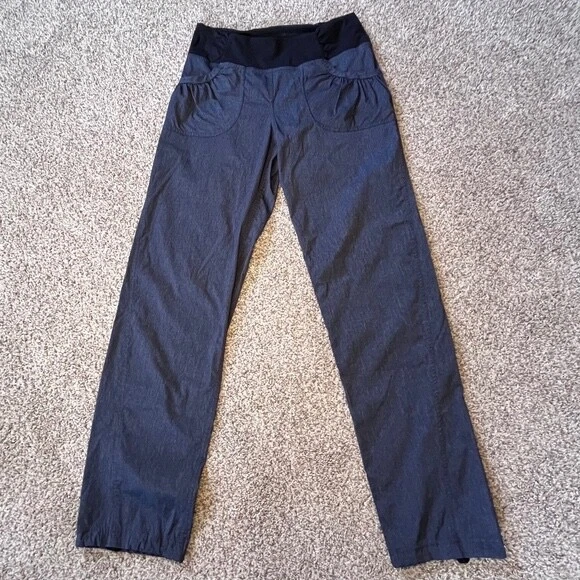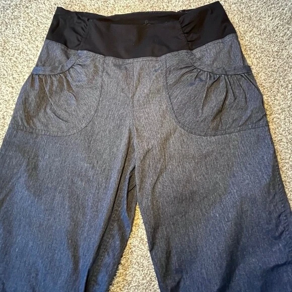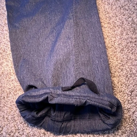 medium Performance Summit Pants by PrAna Features: Straight Leg with Adjustable Strap at the Hem Mid Rise Gray Color Called Charcoal Heather Solid Print 4 Pocket Style Pull On Closure Stretch Soft Shell Fabric A