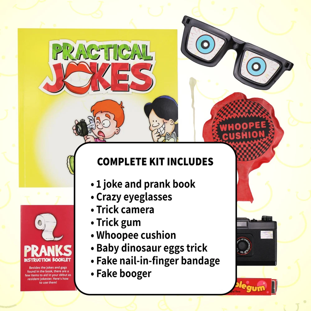 Looking for a hilarious way to brighten up someone's day? Make and Play Practical Jokes is the perfect solution! The shocking pranks kit is packed with an array of gag toys. From fake bugs to whoopee cushions, this kit has everything you need to play the ultimate trick on your friends and family. This prankster kit is sure to keep you entertained for hours. Unleash your inner prankster and create funny pranks with this amazing kit. These gag gifts for kids are perfect for birthday parties, sleepovers, or just a fun night in with friends. With a variety of tricks and pranks to choose from, this kit will keep you laughing for hours on end. PRANKING KIT PACKED WITH FUN SUPPLIES - Have fun with pranks for kids including the classic whoopee cushion, trick camera, crazy eyeglasses, and more. Help turn any practical joker into a pro trickster! MAKE PEOPLE LAUGH - With 32 fun gags and pranks, there’s no need to wait for April Fool’s Day… Every day Is the right day for a good joke with our prank kits for kids! STURDY PACKAGING - The large-format box with magnetic flap closure makes our prank sets for kids perfect for storing and organizing your pranking games, allowing for continued use and play! STEP-BY-STEP INSTRUCTIONS - With the prank set for boys and girls you can follow along with the colorfully illustrated guide to learn how to pull off the best pranks. COMPLETE KIDS PRACTICAL JOKE KIT INCLUDES - 1 joke and prank book, crazy eyeglasses, trick camera, trick gum, whoopee cushion, baby dinosaur eggs trick, fake nail-in-finger bandage, fake booger.