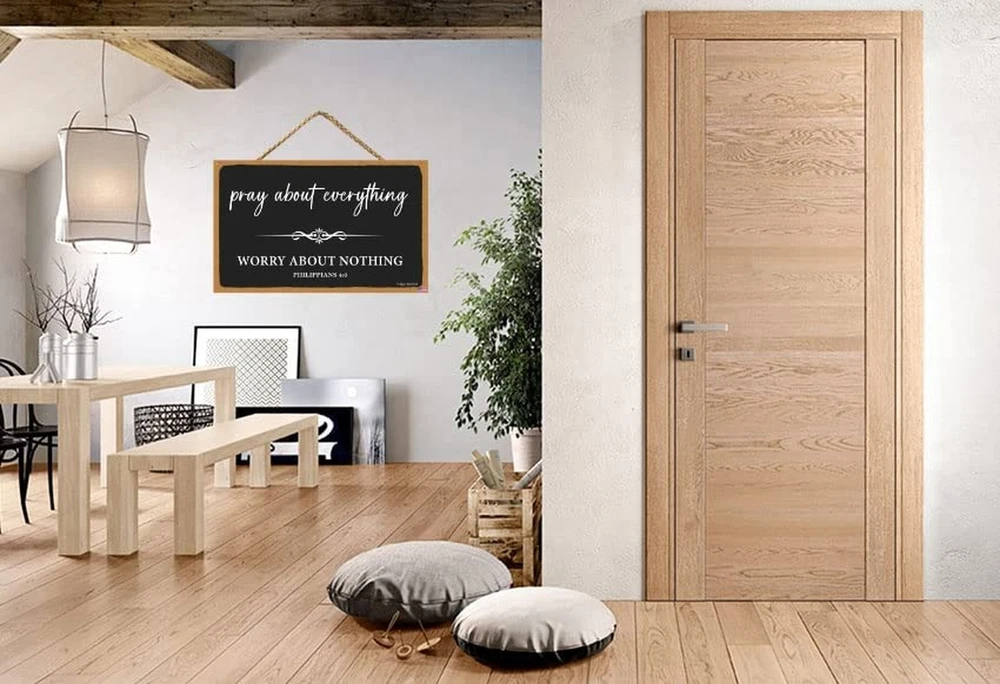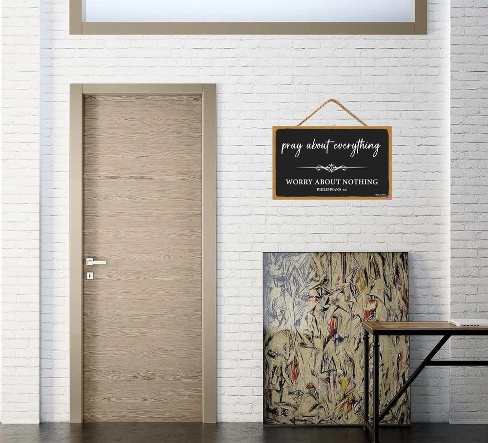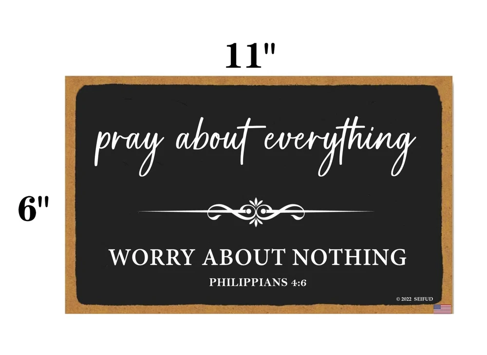 Pray About Everything Sign Farmhouse Style Bible Verse Wall Decor Wooden Sign 11 x 6 inch Wooden Home Decoration Church Decoration (Black-4) Product Details Color: Black-4 Brand: SEIFUD MPN: Does not apply UPC: Does not apply EAN: Does not apply Color: Black-4 Brand: SEIFUD Material: Wood Theme: Love Recommended Uses For Product: Home decoration, gifting, religious or motivational decoration Mounting Type: Wall Mount Product Dimensions: 11"L x 6"W Shape: Oblong Item Weight: 0.15 Kilograms Style: Art Deco Pre-printed: Pray About Everything, Bible Verse Included Components: Jute Rope Item Weight: 5.3 ounces Batteries required: No High-precision printing: achieve vivid colors, realistic patterns and waterproof effect. Perfect signage for indoor and outdoor hanging. Golden ratio: 11x6 inches (28cm x 15.2cm) Configuration:Comes with a 42cm long jute rope, ready to hang on the wall. Ideal Gift: The wooden material is light weight, easy to see and beautiful in appearance. It will be a great gift for friends or family. Suitable for decoration in many places: hang in the center of doors, door and drawer handles and bathrooms, wall hooks, flower and ornament displays, table center pieces and chairs, etc. It looks wonderful and embellishes the most perfect home.