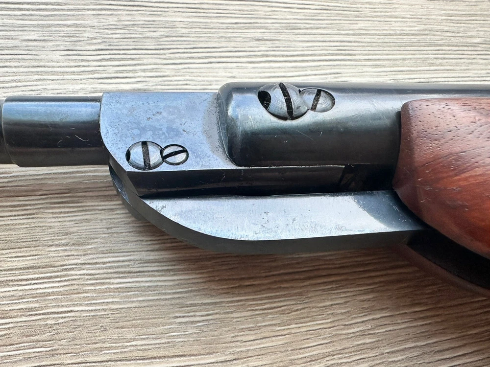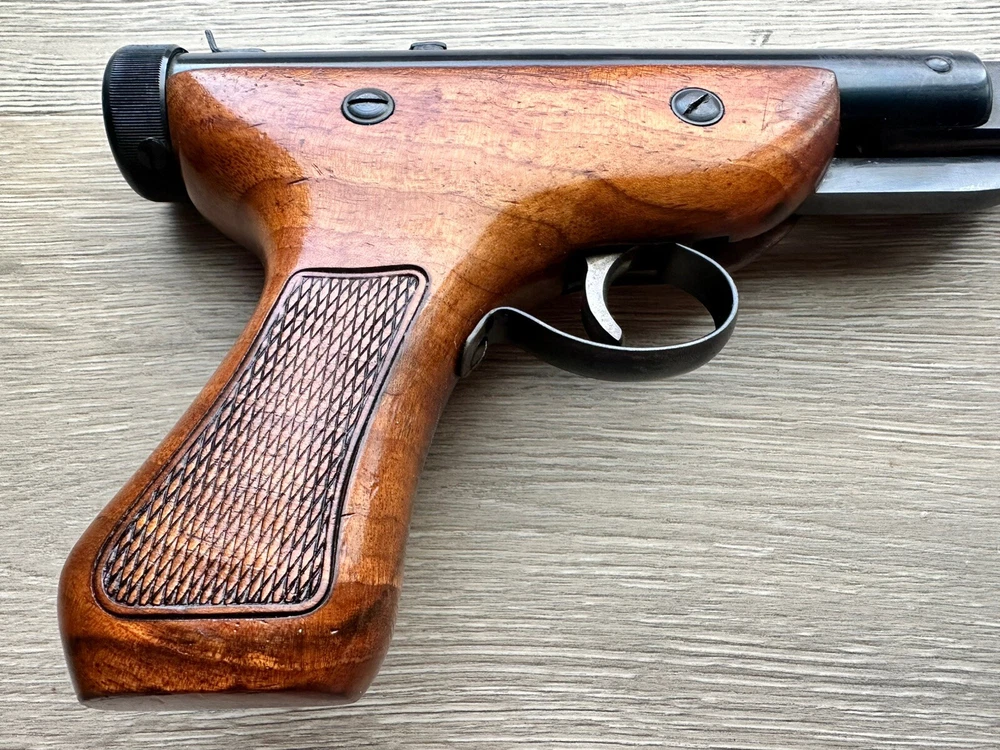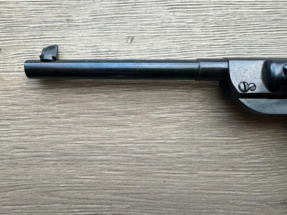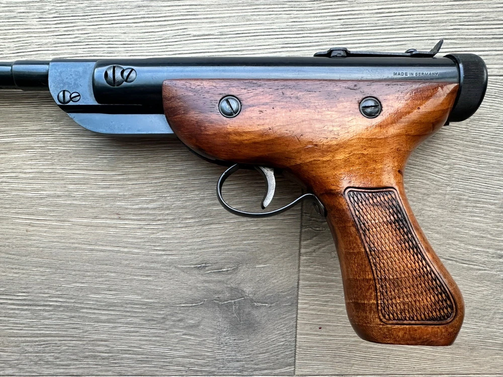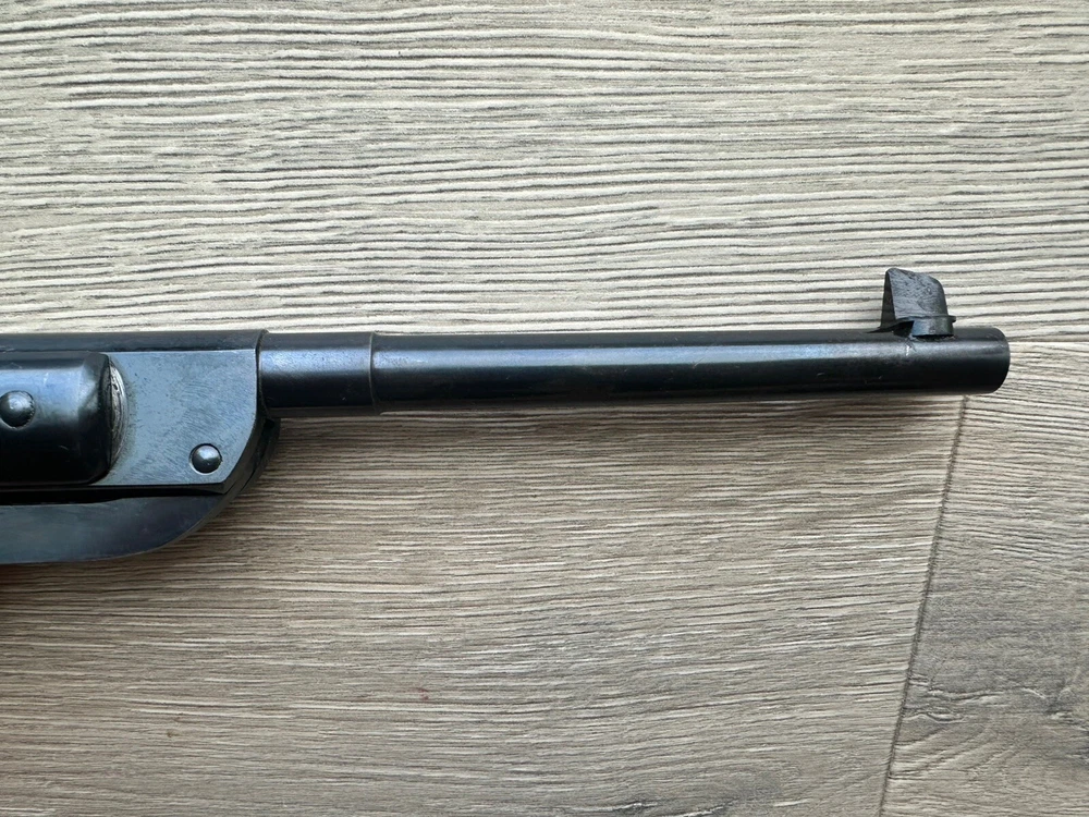 Great Condition! A MGR Diana Model No 5 .177 Calibre Air Pistol manufactured by Mayer and Grammelspacher, Rastatt, Germany Circa 1931 -1940. A good example of this Pre WWII German manufactured Air Pistol. The blueing on the barrel and action is in good order retaining most of its original finish fading on the barrel where it has been subject to more usage. The markings on the cylinder detail ‘DIANA’ with the ‘ringed ‘D’ with the arrow through it’ lenghtwise with ‘MADE IN GERMANY’ on the left side of the air chamber. The barrel is stamped to the underside ‘CAL 4.5 M/M’ The walnut stock is in good condition with no splits it does have mark from usage but nothing serious. The pistol is fitted with its correct adjustable rear sight and post front sight. It cocks and fires with no issues. A good example of this classic Pre WWII manufactured German Air Pistol. This listing complies with eBay’s air gun guidelines found here and I will only sell and ship air guns to buyers in jurisdictions where permitted by applicable laws http://pages.ebay.com/help/policies/firearms-weapons-knives.html