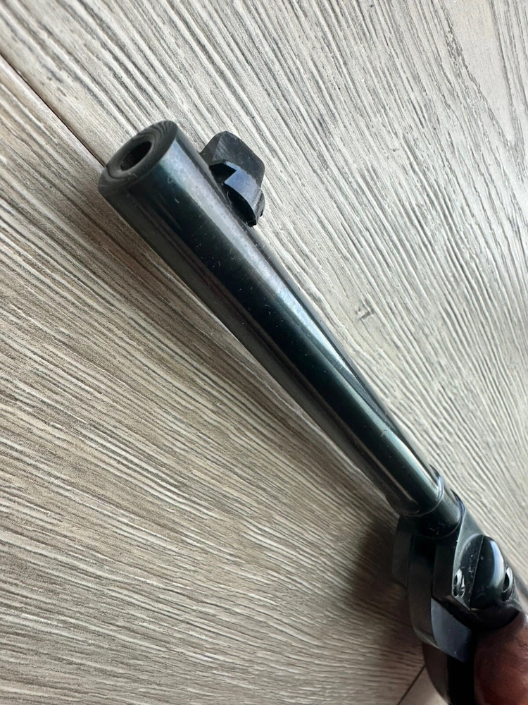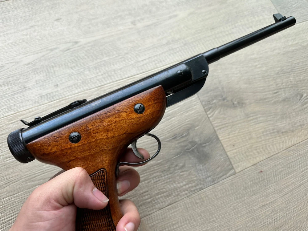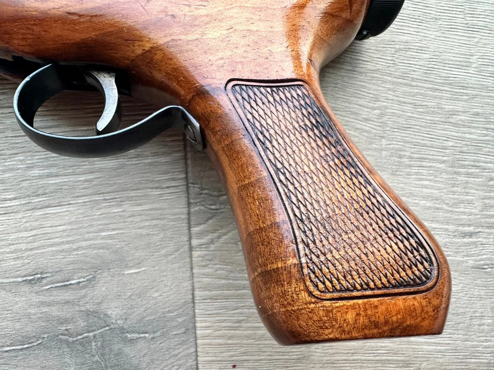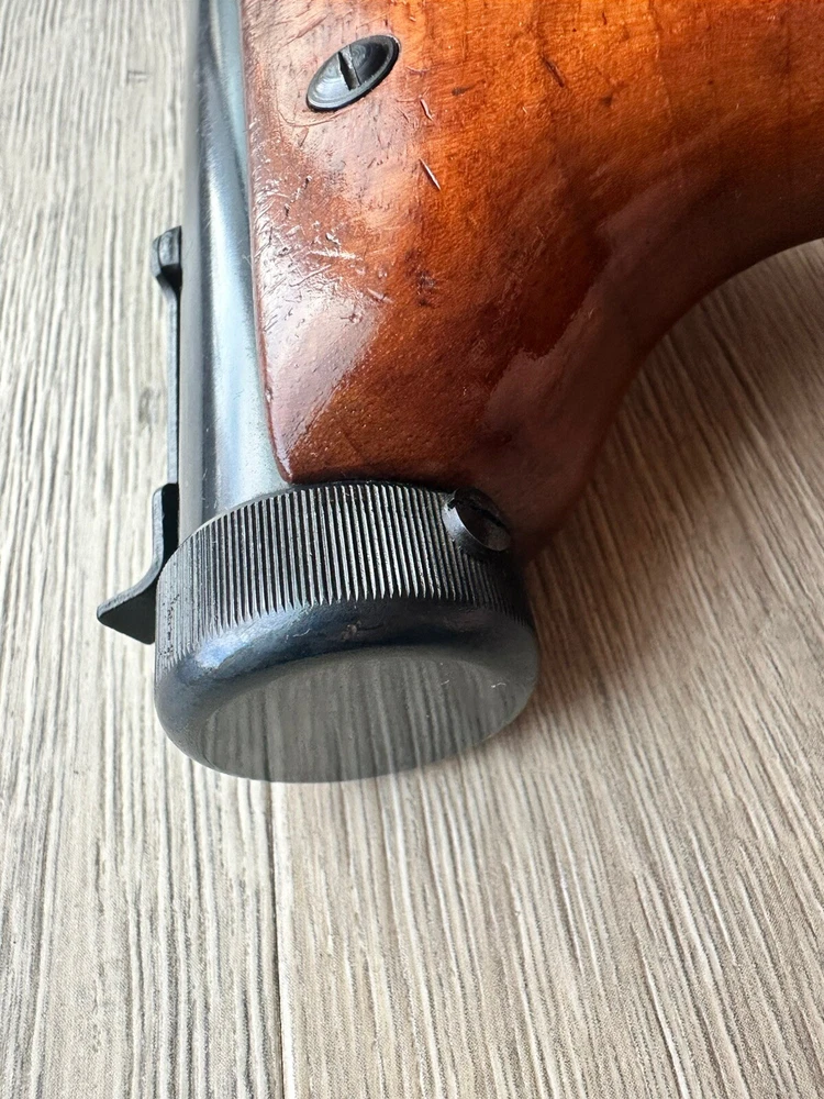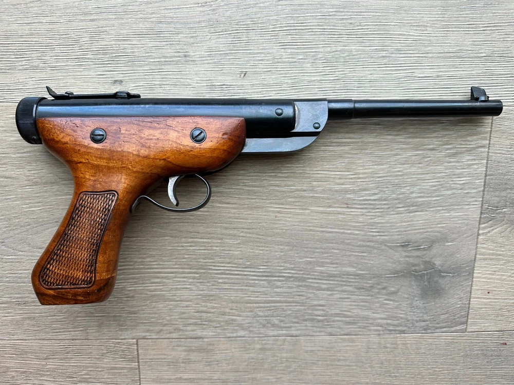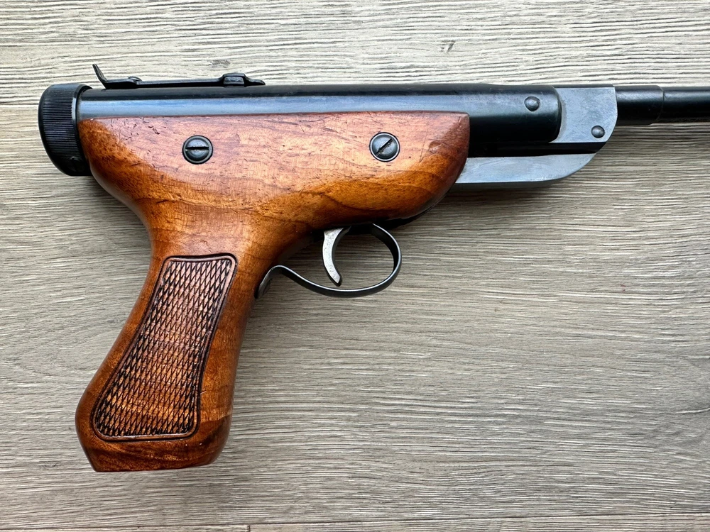 Great Condition! A MGR Diana Model No 5 .177 Calibre Air Pistol manufactured by Mayer and Grammelspacher, Rastatt, Germany Circa 1931 -1940. A good example of this Pre WWII German manufactured Air Pistol. The blueing on the barrel and action is in good order retaining most of its original finish fading on the barrel where it has been subject to more usage. The markings on the cylinder detail ‘DIANA’ with the ‘ringed ‘D’ with the arrow through it’ lenghtwise with ‘MADE IN GERMANY’ on the left side of the air chamber. The barrel is stamped to the underside ‘CAL 4.5 M/M’ The walnut stock is in good condition with no splits it does have mark from usage but nothing serious. The pistol is fitted with its correct adjustable rear sight and post front sight. It cocks and fires with no issues. A good example of this classic Pre WWII manufactured German Air Pistol. This listing complies with eBay’s air gun guidelines found here and I will only sell and ship air guns to buyers in jurisdictions where permitted by applicable laws http://pages.ebay.com/help/policies/firearms-weapons-knives.html