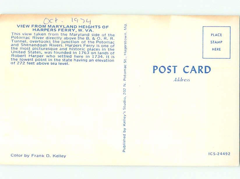 Country/Region of Manufacture: United States Signed: No Era: see features for era Country: USA Postage Condition: n/a Size: Standard (5.5 x 3.5 in) Original/Licensed Reprint: Original Material: Paper Region: West Virginia Unit of Sale: Single Unit Features: Chrome City: Harpers Ferry Continent: North America Type: Printed (Lithograph)
