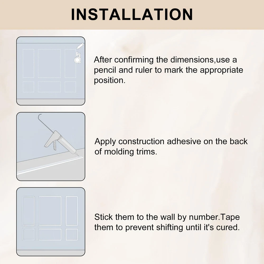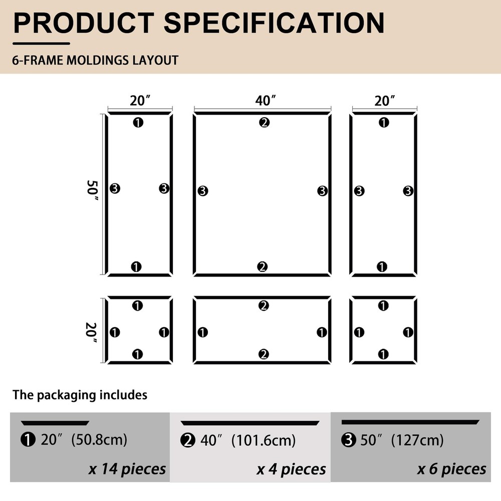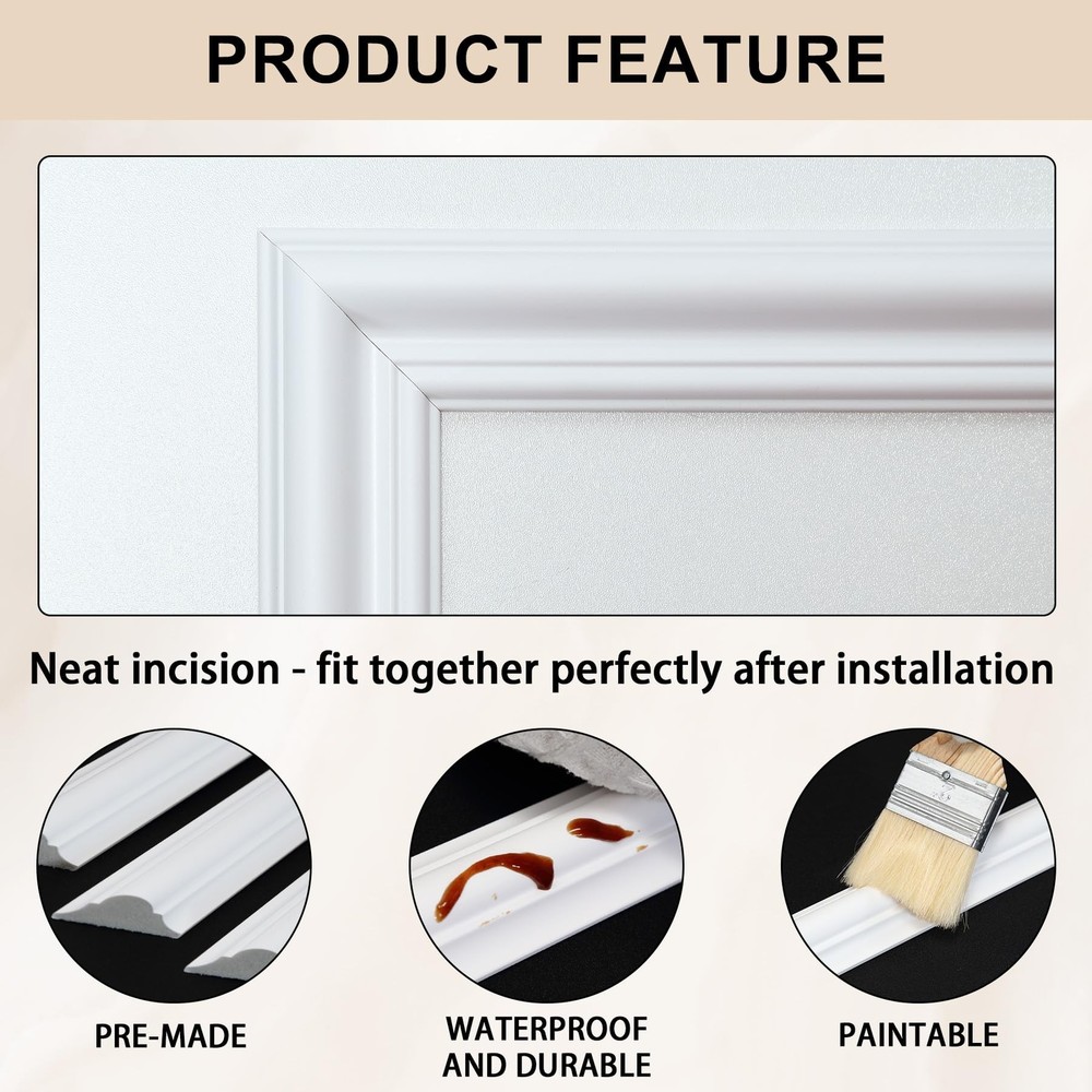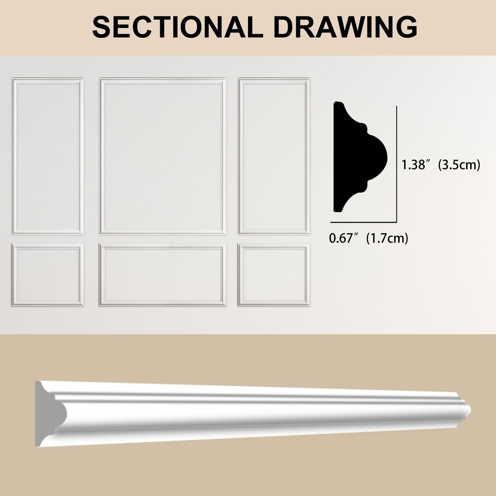 Pre-Cut Accent Wall Molding Trim Kit, 6 Frames Premade Wainscoting Panels for Interior Decoration, Ready to Assemble Chair Rail Moulding Product Details Size Name: 6-Frame, Section width: 1.4“ Color: White Brand: Hungbak MPN: PS-4 UPC: Does not apply EAN: Does not apply Manufacturer: ‎Hungbak Part Number: ‎PS-4 Item Weight: ‎7.19 pounds Package Dimensions: ‎52.3 x 6.5 x 4 inches Country of Origin: ‎China Size: ‎6-Frame, Section width: 1.4“ Color: ‎White Finish: ‎Finished Material: ‎Polymer Batteries Included?: ‎No Batteries Required?: ‎No Date First Available: November 6, 2024 Kit Contents: You'll receive pre-cut wall molding kits, with the 3-frame combo including 18 pieces or the 6-frame combo featuring 24 pieces Durable Material: Our molding kits are crafted from high-quality polystyrene, offering superior strength and durability. This material is superior to traditional wood, makes the panels resistant to scratches, cracks, and moisture, ensuring long-lasting beauty Effortless Assembly: Our DIY molding kits simplify your decor project, with pre-cut pieces that are easy to install, regardless of your skill level. No cutting or aligning is required, just apply structural glue Versatile Design: Add depth and sophistication to any room with our prefabricated wall molding kit. Customize the look by adjusting spacing and mixing sizes to create a personalized interior design Universal Use: Our trim enhances the elegance of various rooms, from bedrooms to hallways. It simplifies the decoration process, enabling you to achieve a stylish and refined home ambiance