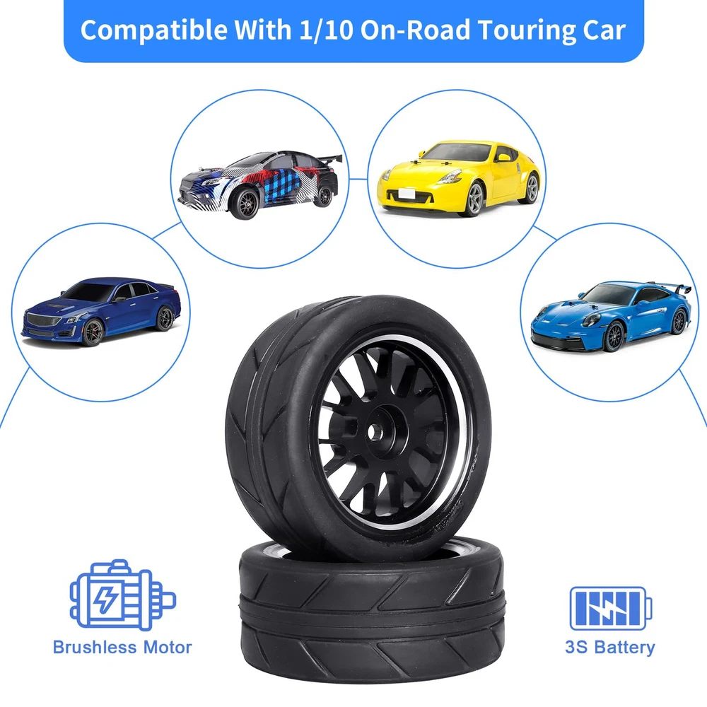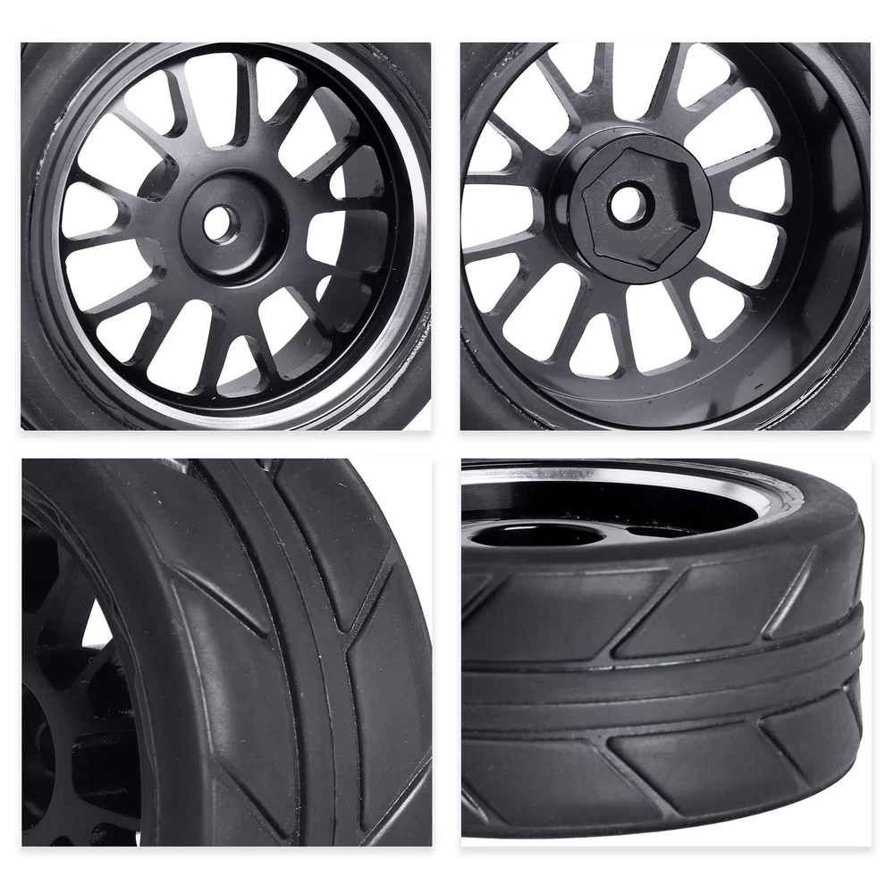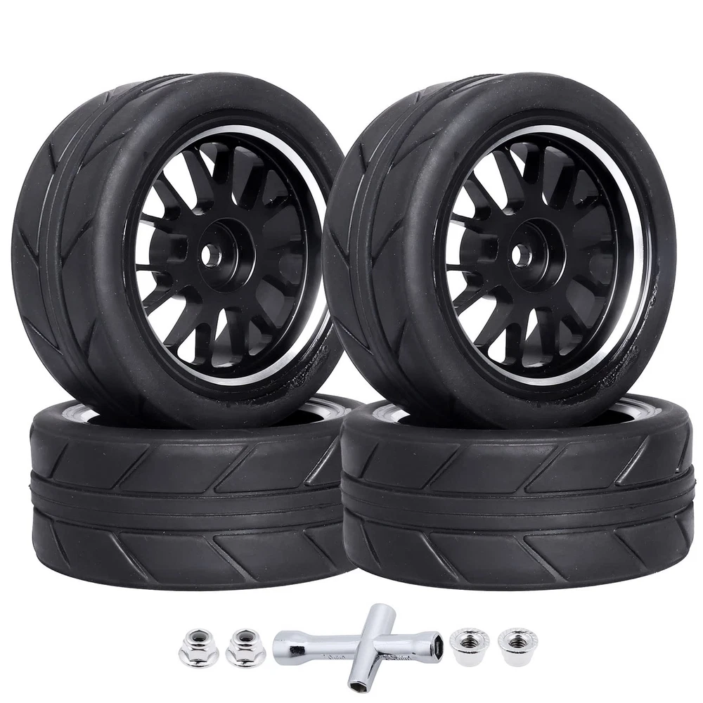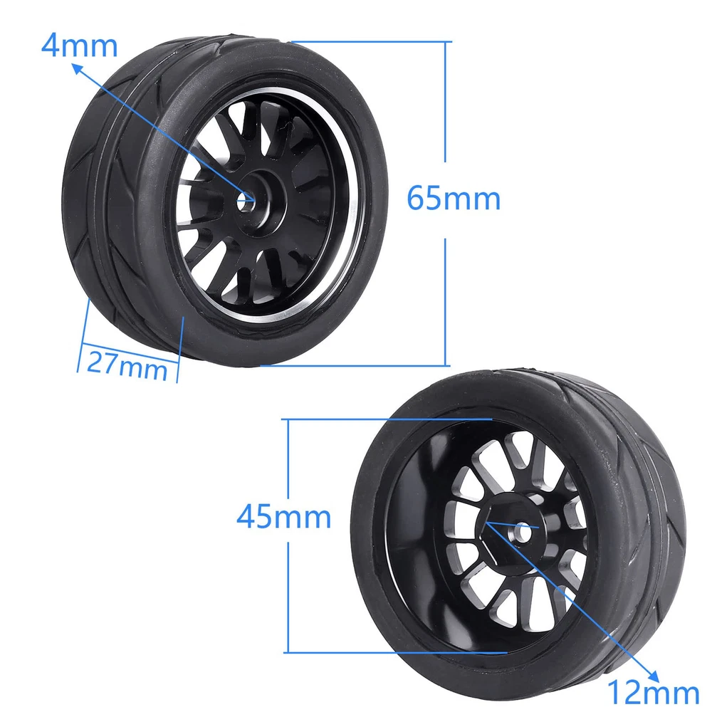 Quality Products 1/10 RC Drift Tires Outer Diameter(Height): 2.56" (65mm) | Width: 1.06" (27mm) | Wheel Inner Diameter: 1.77" (45mm) | Wheel Hex: 12mm| Axle Hole: 4mm. Fit 1/10 Scale On-Road Racing Car / RC Drift Car ONLY, NOT FIT other 1/10 Models. with Traxxas 4tec 2.0 3.0, Tamiya TT02 TT01, HPI RS4, HSP Flying Fish, Wltoys 144001, Kyosho Fazer, and other 1/10 on road Touring Car / RC Drift Car, which have 12mm Hubs. PreGlued Assembled, Aluminum Wheel Rims,Excellent durability. Quality Rubber, with foam inserts. Package include: Set of 4, come with 4x Lock Nuts & 1X Wheel Wrench.