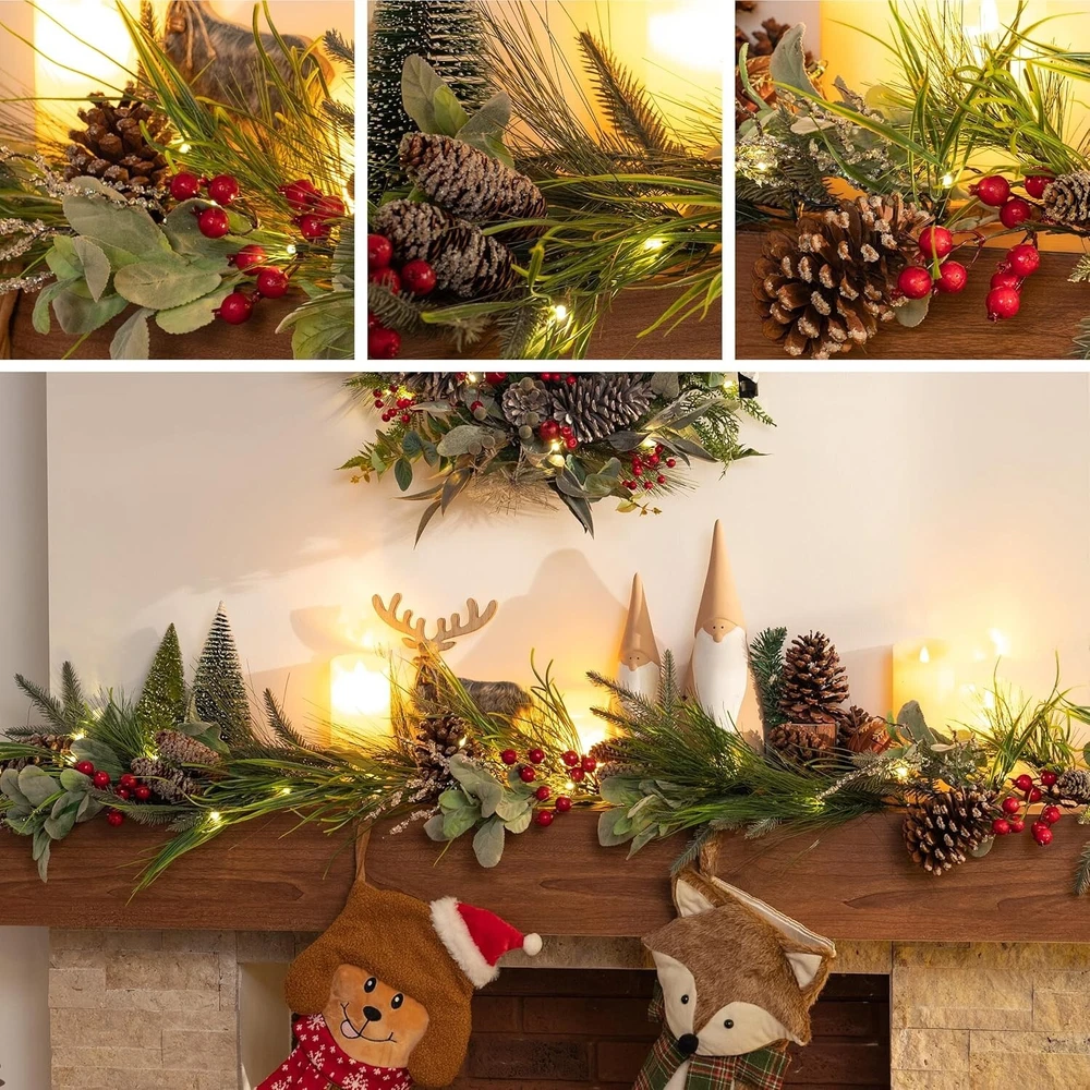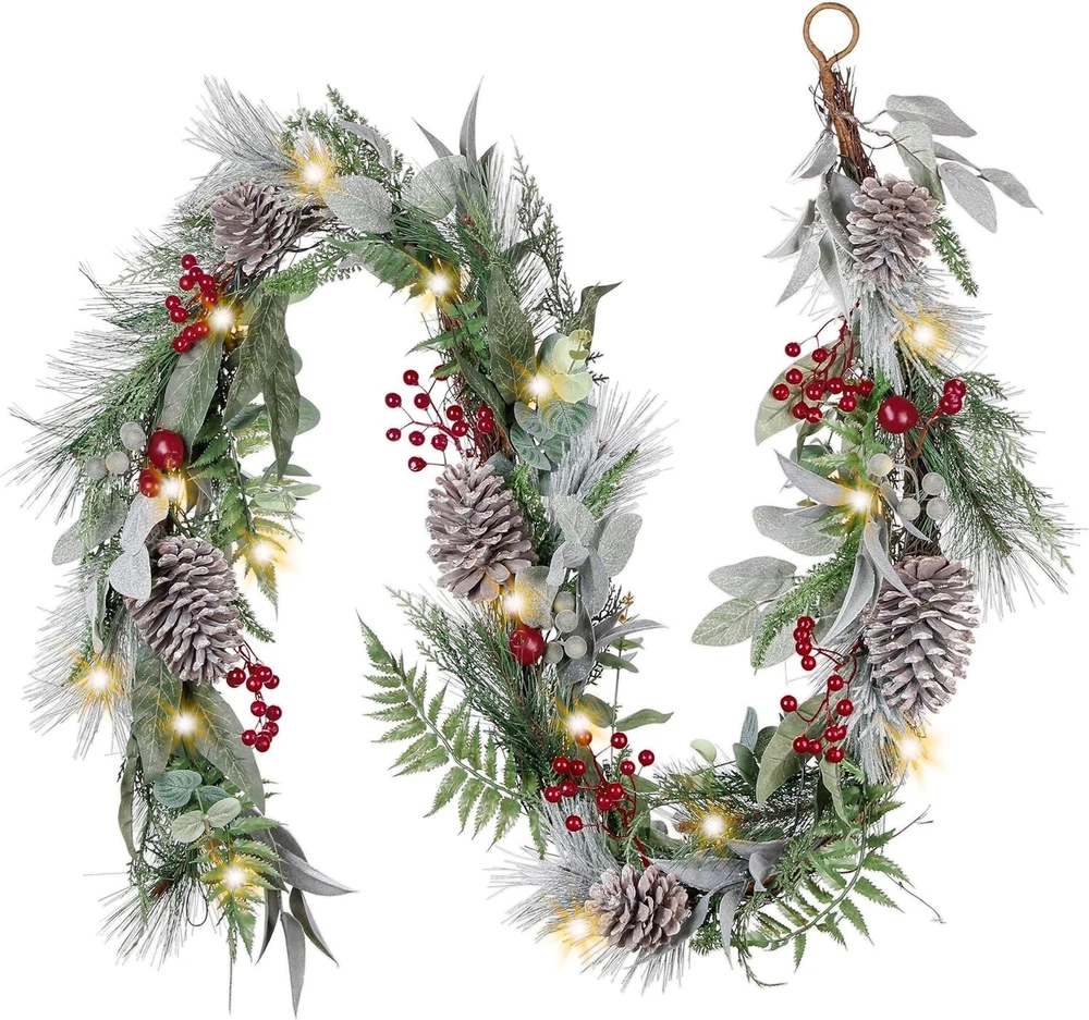 Here's a more polished and professional version of your eBay product description: 6ft Christmas Garland with LED Lights – Featuring Pine Cones, Red Berries, and Waterproof Design – Perfect for Holiday Décor Enhance your holiday season with this beautifully crafted 6ft Christmas garland from Valery Madelyn , a brand known for its original, nature-inspired designs. Designed to bring the magic of the forest into your home, this garland features a harmonious blend of rich red and brown tones, pine cones, red berries, and more, creating a festive, woodland-inspired atmosphere that radiates Christmas cheer. Key Features: Elegant & Original Design: Featuring a lush base of artificial crestwood fir branches, this garland is adorned with seasonal elements such as pine cones, red berries, and other natural accents, creating a sophisticated yet cozy holiday look. Automatic Timer Function: Enjoy convenience with the built-in automatic timer. Simply switch the garland to the "ON" position, and the lights will illuminate for 6 hours before automatically turning off for 18 hours. The lights will light up at the same time each day when initially activated, offering effortless operation. Versatile Lighting Effects: With 20 warm yellow LED lights and a control button offering 8 different lighting modes, this garland allows you to customize the ambiance to suit your holiday mood—whether you want a soft glow or a more vibrant lighting display. Indoor & Outdoor Use: Designed for both indoor and outdoor spaces, this garland can be draped over mantels, stair railings, windows, or even used as a centerpiece for your table. It also makes a perfect addition to your front entrance, welcoming guests with festive warmth. Waterproof & Durable: The garland's battery pack is rated with an IP44 waterproof standard, ensuring reliable performance in both indoor and outdoor settings, even during wet weather conditions. Perfect for Holiday Décor & Gifting: This elegant garland is the ideal addition to any Christmas display. It pairs beautifully with other Valery Madelyn products such as wreaths, stockings, tree skirts, and ornaments, allowing you to create a cohesive holiday theme throughout your home. It also makes a thoughtful gift for anyone looking to elevate their seasonal décor. Package Includes: 1 x 6ft Christmas garland 20 LED warm yellow lights with 8 lighting effects Battery pack with automatic timer (IP44 waterproof) Note: To display the garland at its best, remove it from the box and carefully fluff and arrange the branches for a fuller, more natural look.