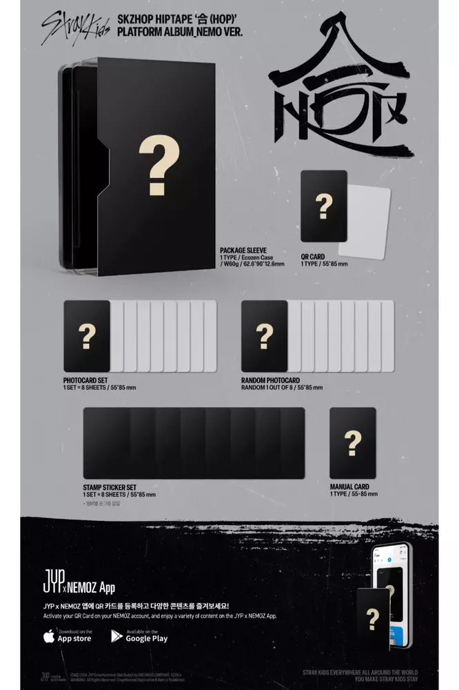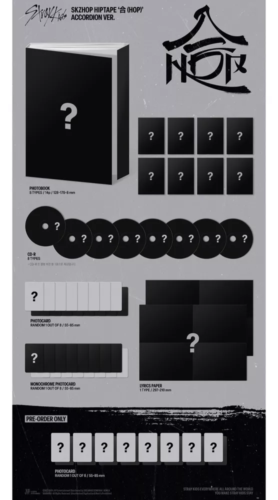[Pre-Order] Stray Kids SKZ SKZHOP HIPTAPE 合 (HOP) Official POB Photocard + Tracking Number/Free gift This is 100% authentic, official item. NEW + Official Release date: December 13th~ (It is a pre-order , so you cannot cancel your order after you purchase it.) [SEALED ALBUM] HIPTAPE VER. (Limited Edition) Contents: 1 Outbox + 1 Photobook + 1 CD Book + 1 CD-R + 1 Random Photocard out of 8 types + 1 Random Unit Photocard out of 4 types + 1 Sticker + 1 Mini Poster + 1 Random Trading Card Set out of 4 types (1 SET = 4 SHEETS) + 1 4-Cut Photo - Pre-order Benefits: 1) 1 Folded Poster 2) 1 Graphic Sticker SKZHOP VER. (Standard Edition) Contents: 1 Outbox + 1 Photobook + 1 CD Book + 1 CD-R + 1 Random Photocard out of 8 types + 1 Random Unit Photocard out of 4 types + 1 Sticker + 1 Mini Poster - Pre-order Benefits: 1) 1 Folded Poster 2) 1 Graphic Sticker ACCORDION VER. Contents: Photobook + 8 CD-Rs + 1 Random Photocard out of 8 + 1 Random Black and White Photocard out of 8 + 1 Lyric Paper - Pre-order Benefit: 1) 1 Random Photocard out of 8 NEMO VER. Contents: 1 Out Sleeve + 1 QR Card + 1 Manual Card + 1 Photo Card Set (1 SET = 8 SHEETS) + 1 Random Photo Card out of 8 Types + 1 Stamp Sticker Set (1 SET = 8 SHEETS) 📦 Shipping & Handling 📦 We ship your order within 1~3 business days after your payments. Standard shipping : Tracking number provide (7-25 Business Days) - US, Canada, Europe ( France, Germany, Spain, United Kingdom ) , Asia ( China, Hong Ko ng, Indonesia, Japan, Korea, South, Malaysia, Philippines, Russian Federation, Singapore, Taiwan, Thailand, Vietnam) , Australia, New Zealand , Brazil Economy shipping : Tracking number provide, Sign is required when receiving the package ! (10-40 Business Days) - Asia : Armenia, Azerbaijan Republic, Bahrain, Bangladesh, Bhutan, Cambodia, Georgia, India, Jordan, Kazakhstan, Maldives, Mongolia, Nepal, Pakistan Qatar, Saudi Arabia, Sri Lanka, United Arab Emirates, Uzbekistan - Southeast Asia : Cambodia - North America : Mexico - South America : Argentina, Chile, Colombia, Ecuador, Peru - Europe : Austria, Belgium, Bulgaria, Croatia, Republic of, Czech Republic, Denmark, Finland, Greece, Hungary, Italy, Luxembourg, Moldova, Netherlands, Norway, Poland, Portugal, Romania, San Marino, Slovakia, Slovenia, Sweden, Switzerland, Ukraine - Middle East : Bahrain, Jordan, Qatar, Saudi Arabia, Turkey, United Arab Emirates Shipping to these countries requires your signature when you receive the package. You need to sign and receive it. We are not responsible for any delivery accidents caused by this. 📢 International Shipments We are not responsible for any custom duty or import tax. 📢 RETURN POLICY We do quality check before sending out items. Only if you received defective products, please return within 30 days from the date you received the item and we will replace them for you. Buyers are responsible for shipping and handling fees on return items under any circumstances. Please notify us before sending back items. We'll answer your inquiries within 24 hrs.