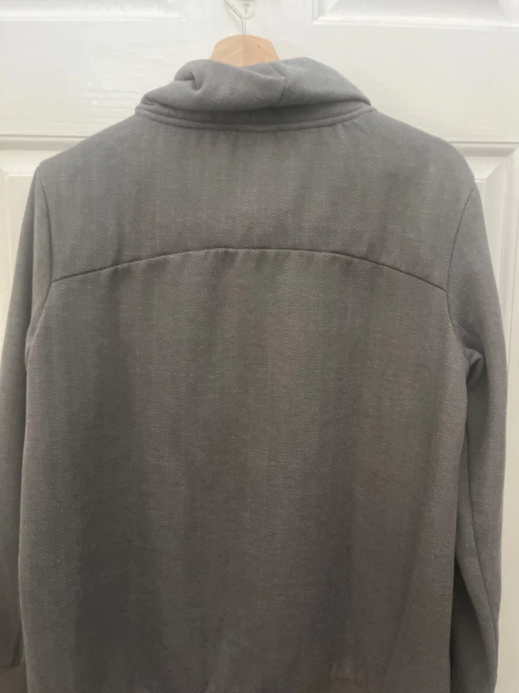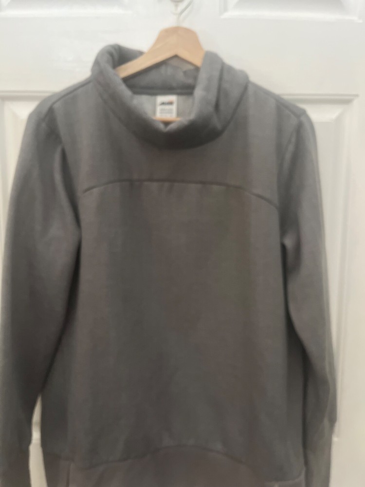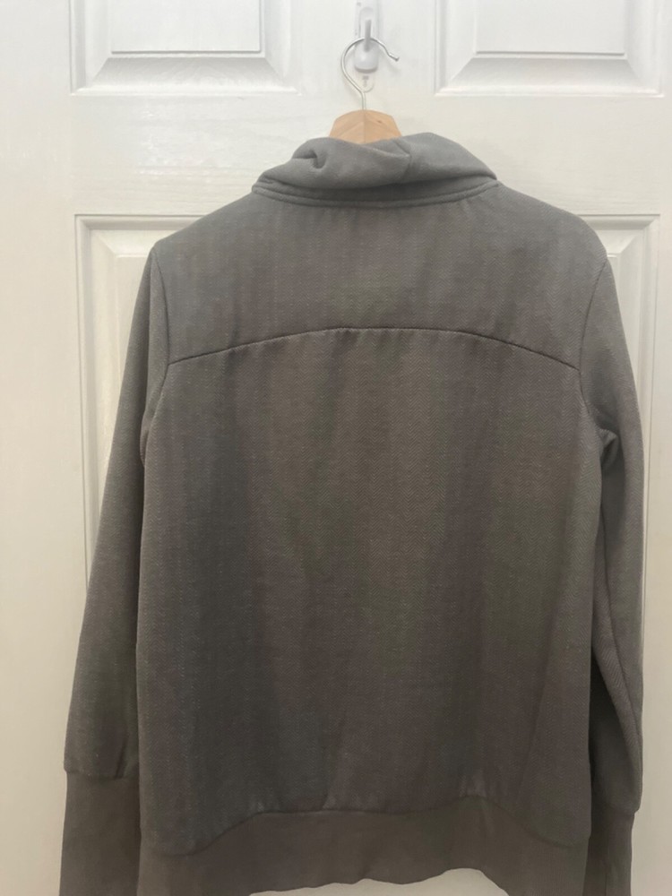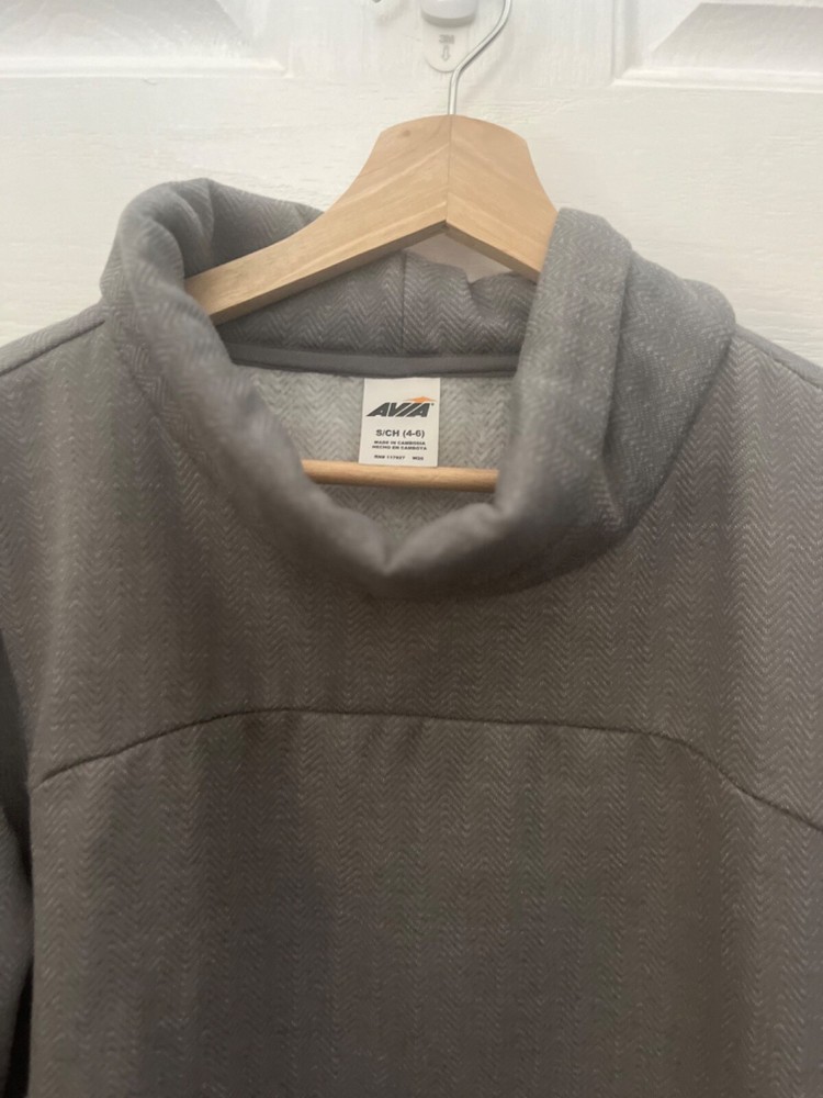 PRE-OWNED AVIA WOMEN'S COWL NECK SWEATSHIRT DETAILS: SMALL GRAY HERRINGBONE PRINT COWL NECK RIBBED CUFFS AND HEM THUMBHOLES ON CUFFS 100% POLYESTER MACHINE WASHABLE