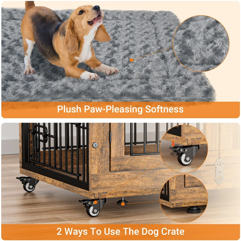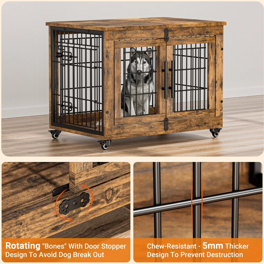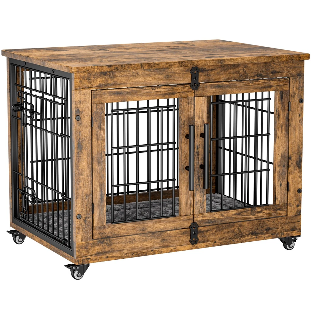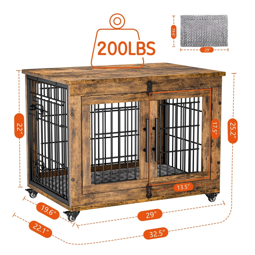 Tips: This is a Pre-Owned product. The product is in good condition. Features: 【Double Doors & Cushion】This indoor dog house is equipped with two entrances(front and side) and provides an anti-slip cushion which creates a safe and comfortable place for your dogs to rest. 【Durable & Secure Design】This dog crates for large dogs feature a 5mm fence, which is sturdy and chew-resistant. Rotating "Bones" With a door stopper design also increases firmness and prevents dogs break out of it. 【Multi-Purpose Dog Kennel】This dog crate is also perfect as a side table or nightstand for storage needs, which provides enough space for dogs to move around, play, and rest 【Easy to Assemble and Clean】Our package comes with a detailed installation manual to guide your DIY, which you can put together by one person in 15-20 minutes! Specifications: Material: Engineered Wood & Steel Color: Rustic Brown Internal dimensions: 29"L x 19.6"W x 22"H Overall dimensions: 32.5"L x 22.1"W x 25.2"H. Product Weight: 38 lb Package Dimensions: 34 x 26 x 6 in Package Weight: 43 lb Applicable Dog Weight: Up to 45 lbs The Maximum load capacity: 200 lbs Package includes: 1 x Dog Crate 1 x Assembly Tools 1 x Assembly Manual