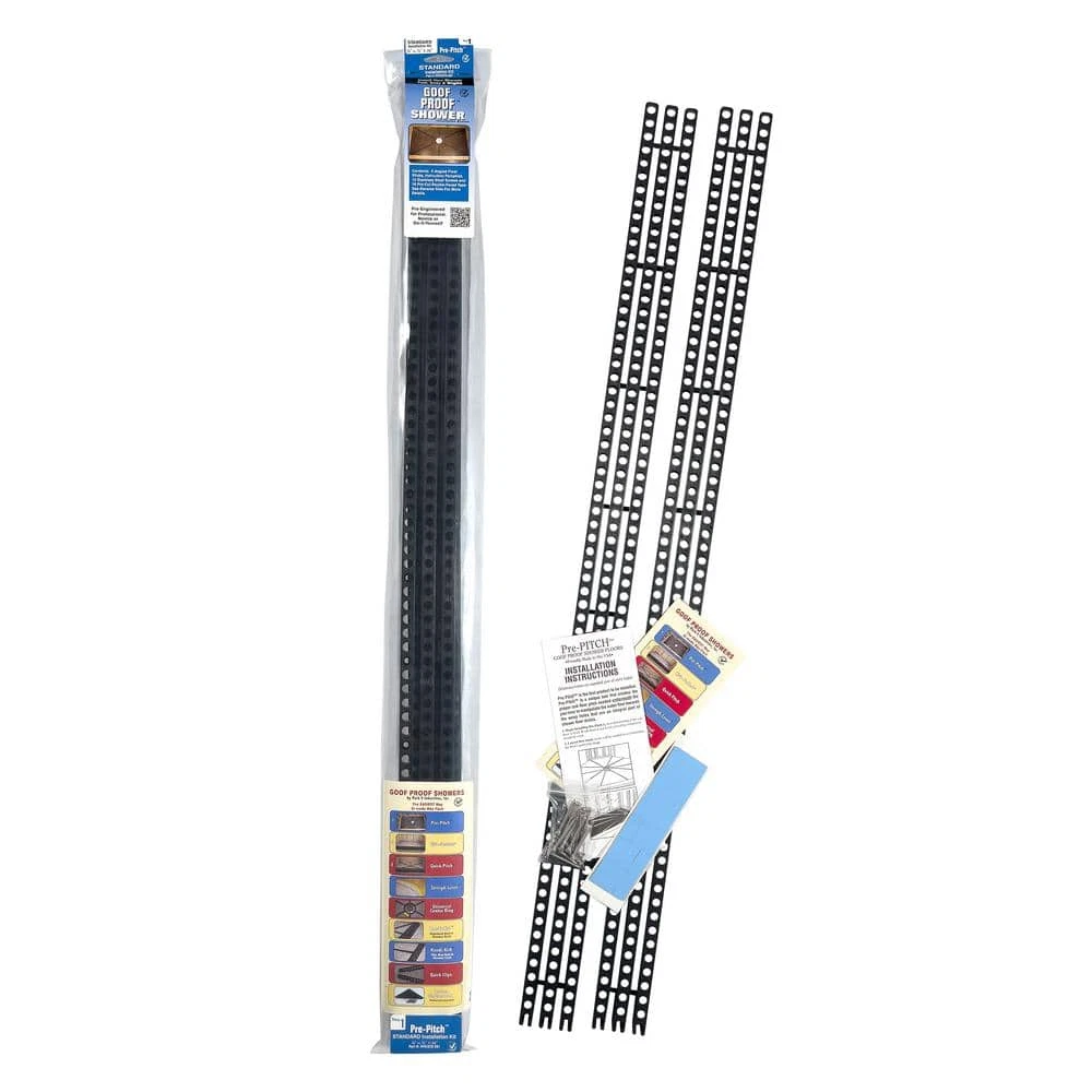 Use with any shower base pan liner system Built-in slope ensures proper drainage Includes hardware for installing on wood or concrete sub-floors Pre-Pitch is a sloping guide tool that creates a code compliant, sub floor pitched mudbed used underneath pan liner material to direct water towards weep holes that are an integral part of all shower floor drains. Pre-Pitch can also be used with roll-on liquid waterproofing and for creating thin-bed type foundations when using sheet membranes as water control. For standard shower sub floor areas with a centered drain or when the drain is within 36 in. of any wall. Each stick measures 1/8 in. to 7/8 in. tapered x 36 in. length. Sold 6 per package. Screws, 2-sided tape and complete instructions included. Creates the proper sub floor pitch insuring pan liner drainage Molded of high impact plastic with a reinforcing design that is lightweight and non-rotting; used on both wood and concrete subfloors Built-in pitch forms the perfect sub floor slope needed without possessing the necessary skills required Packaged with all the necessary hardware for quick and accurate installations