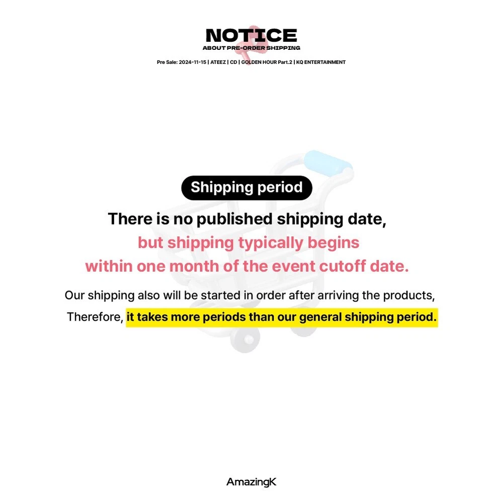 Pre Sale : 2024-11-15 | ATEEZ | CD | GOLDEN HOUR PT.2 | KQ Entertainment All Member stock and price will be changed after this period. NOTICE ABOUT PRE-ORDER SHIPPING This is a PRE-ORDER product. All PRE-ORDER product is NO cancellation, NO exchange, NO refund for any reason , so please refer to this when you purchase. In your order, please check carefully all delivery information such as shipping address, ship to name and phone number.