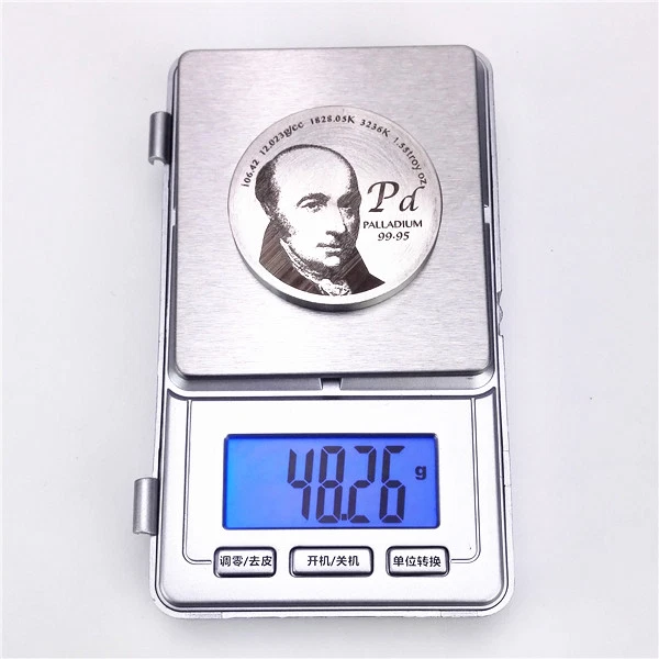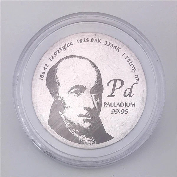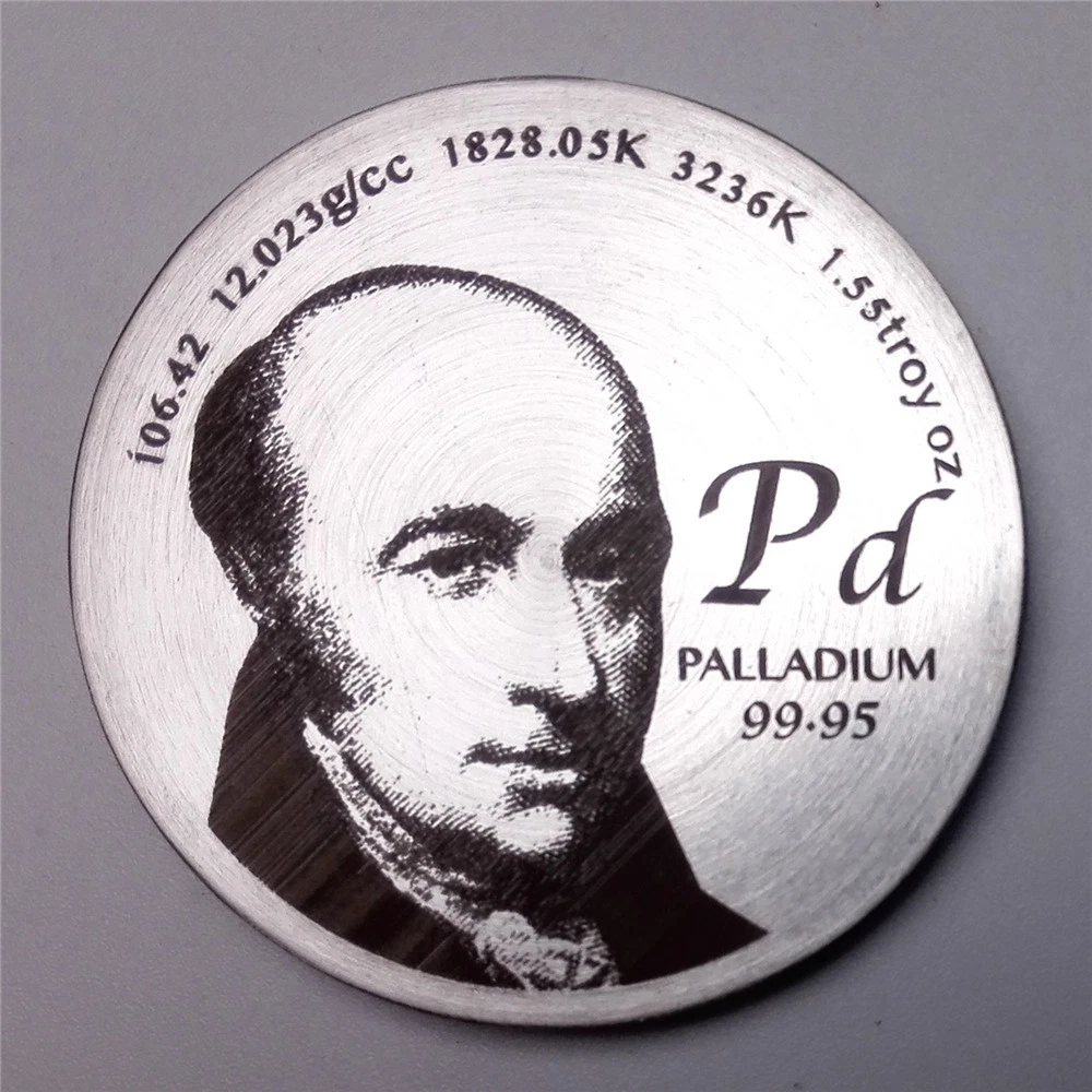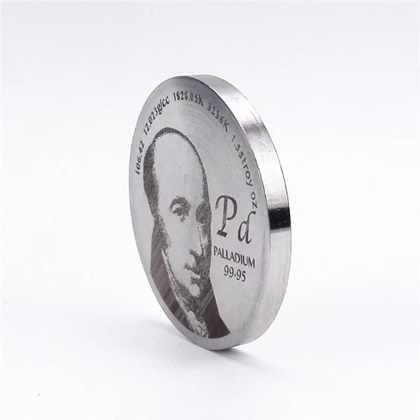 Material: Palladium; Purity:99.95%; Size: diameter1.5 inch× 3.5mm t hickness ; Surface quality: two sides and cylinder fine ground and light polished; Theoretic weight: 47.98grams. Actual weight: 48.26grams(1.55troy oz); On the front side: laser engraved William Hyde Wollaston, element discoverer's picture, atomic number, standard atomic weight, density, melting point, boiling point and net weight. On the back side: laser engraved electron configuration per shell, William Hyde Wollaston' s name and the year of discovery; Main uses: element collection, education, gift and so on. Please visit our store if you are interested in more element coins engraved discoverer's picture. Thank you. Lead Time: within 30 days On Dec-10-21 at 03:02:26 PST, seller added the following information: