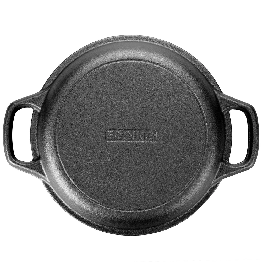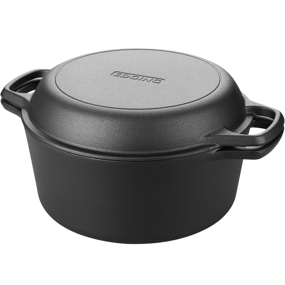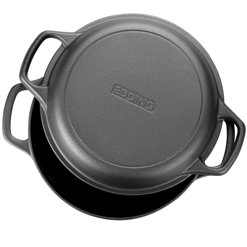 The induction bottom of the 2-In-1 Multi Cooker are suitable for all types of cooking; including electric and ceramic cook tops. Vegetable oil seasoned coating, Perfect natural easy-release seasoning that gets even better with time. Does not contain any chemical that can be harmful to your health. The 2 in 1 multifunctional cooker can meet all your cooking styles, not limited to frying, baking, grilling, broiling, braising. Allow cast iron skillet to cool completely before washing them in hot soapy water with a sponge using regular dishwashing liquid soap, it is not dishwasher safe. Pre-seasoned 2-in-1 cast iron dutch oven: The 2-In-1 cast iron dutch oven pot with skillet lid has been burned with vegetable oil. The shallow skillet that can be used as a lid Matching tools: Complete with a bread baking basket and essential cooking tools, this all-in-one set handles everything from artisan bread to seared steaks with professional results Many of cooking styles: Cast iron dutch oven with lid can meet all your cooking styles, from soups to stews; baking; roasting; frying; grilling; broiling; braising; sautéing meats; vegetables and more Easy to care: Clean by hand washing in warm water. Dried thoroughly on the stove at medium heat and seasoned with natural oils. A super-thin coat is all you need. Wipe off excess oil with a cloth or paper towel Heat transfer: Our dutch oven is made of cast iron. Good heat transfer and the special surface structure of cast iron allow heat to be stored and transferred efficiently