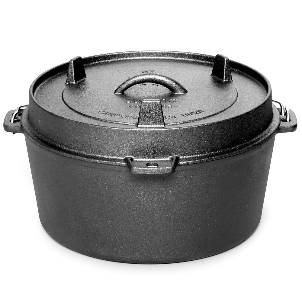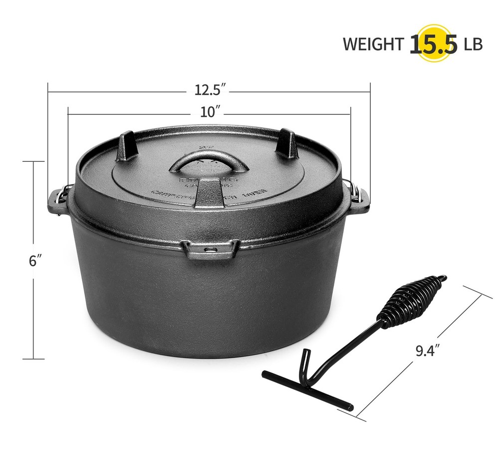 The cast iron material makes the pot heat up quickly and evenly, with a tight-fitting cover that keeps in all the flavor. The handle can be used to move the Oven from place to place, and also allows it to be hung over a campfire. After you're finished cooking, the Oven itself will remain heated as a result of the cast iron. Suitable for 5-6 People: This 6qt Dutch oven is perfect for family meals or small gatherings, offering ample capacity for hearty dishes Thick Cast Iron for Superior Heat Retention: The heavy-duty cast iron construction ensures even heat distribution, making it perfect for slow cooking, braising, and stewing Dual-Purpose Lid: The lid can hold hot coals for top heat or flip over to serve as a skillet, adding versatility to your cooking options Compatible with Various Heat Sources: Use it on stovetops, in ovens, over hot coals, or elevate it with a tripod for open-flame cooking Pre-Seasoned and Ready to Use: The pot comes pre-treated, but applying oil after receiving it enhances its non-stick surface and longevity