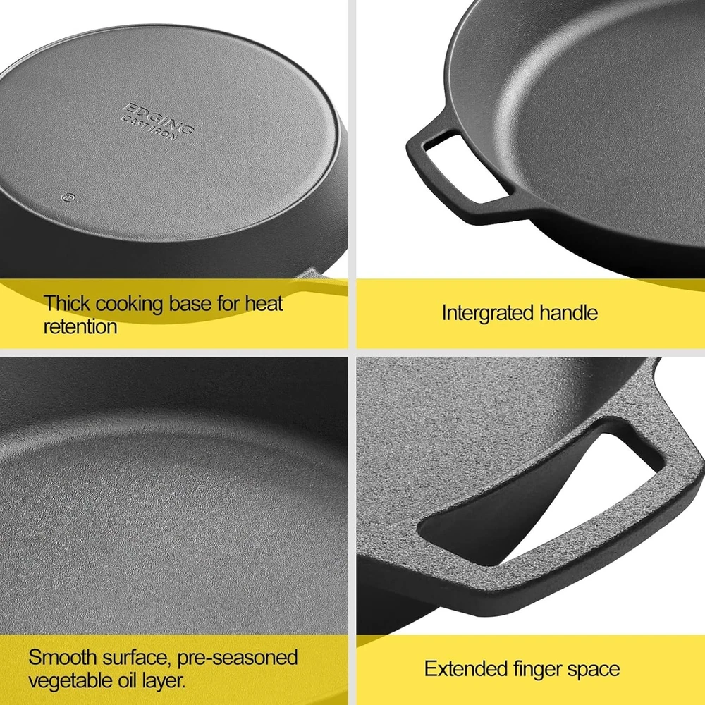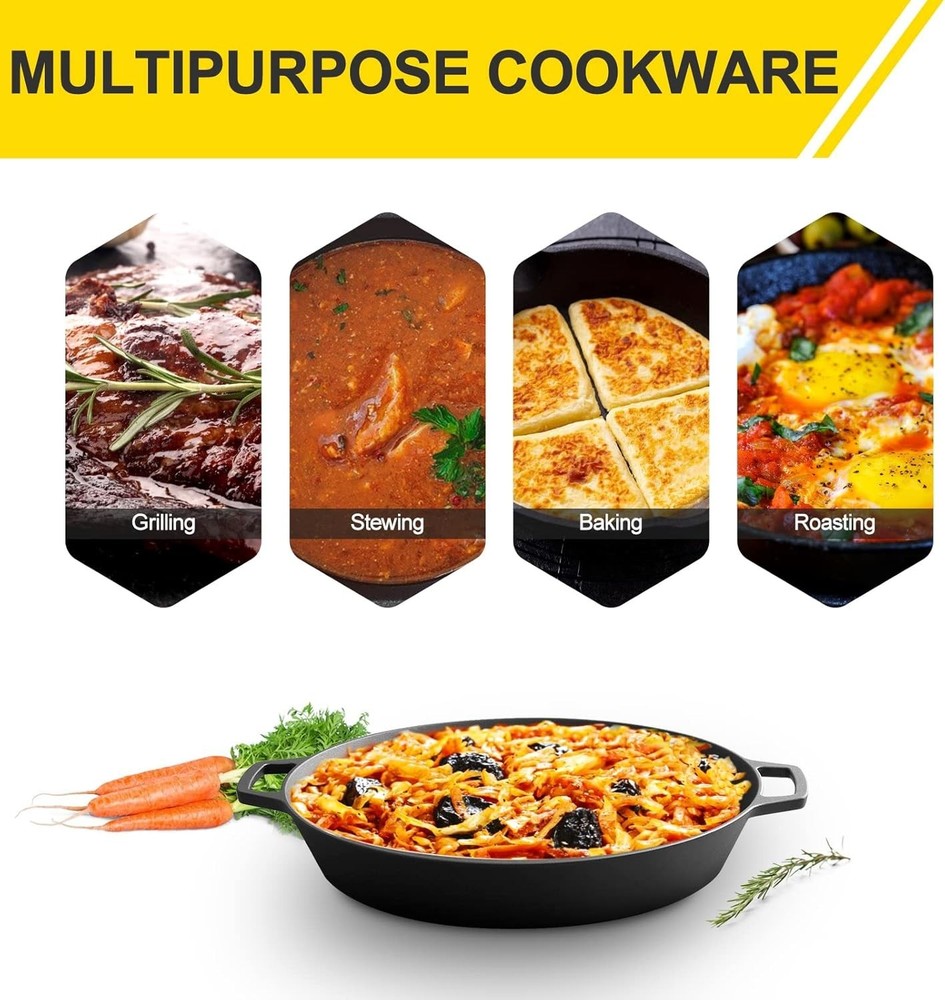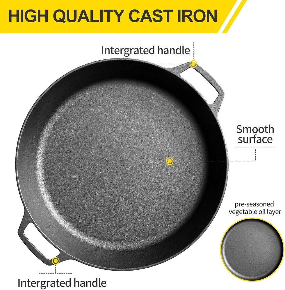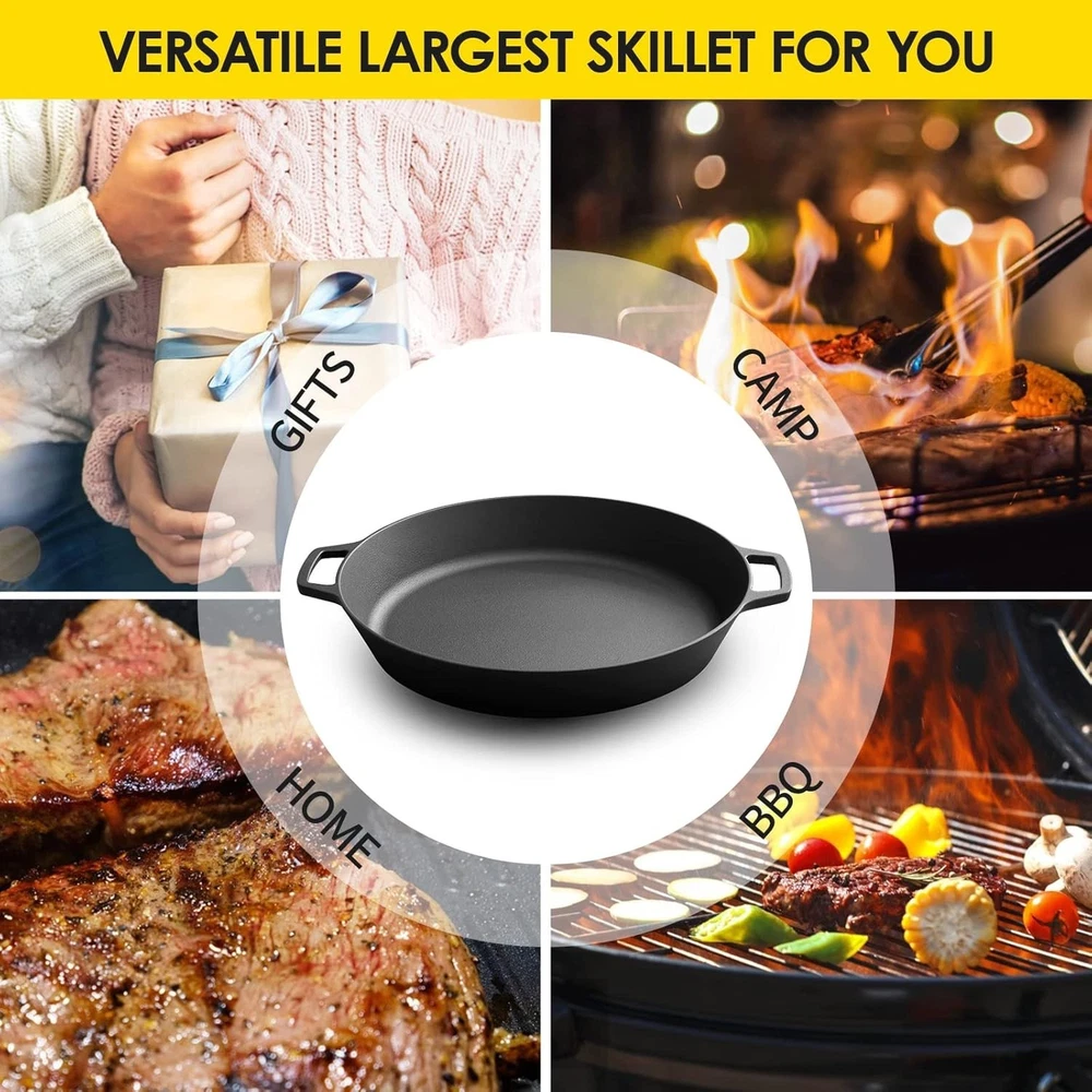About this item 🍳 Pre-Seasoned Cast Iron Skillet: 17-inch extra-large skillet crafted from premium heavy-duty cast iron. Pre-seasoned with natural vegetable oil—no synthetic coatings or harmful chemicals. 🔥 Excellent Heat Distribution & Retention: Provides even heating and superior heat retention. Compatible with gas, electric, induction, ceramic-glass stoves, ovens, and even campfires. 👐 Dual Loop Handles: Features two integrated smooth loop handles for a secure grip, making it easier and safer to lift, carry, and serve directly from stovetop to table. 🧼 Easy Care & Maintenance: Hand wash with warm water only, then dry thoroughly. Re-season with natural oils after each use. Avoid dishwashers and never air-dry to maintain its quality and longevity.