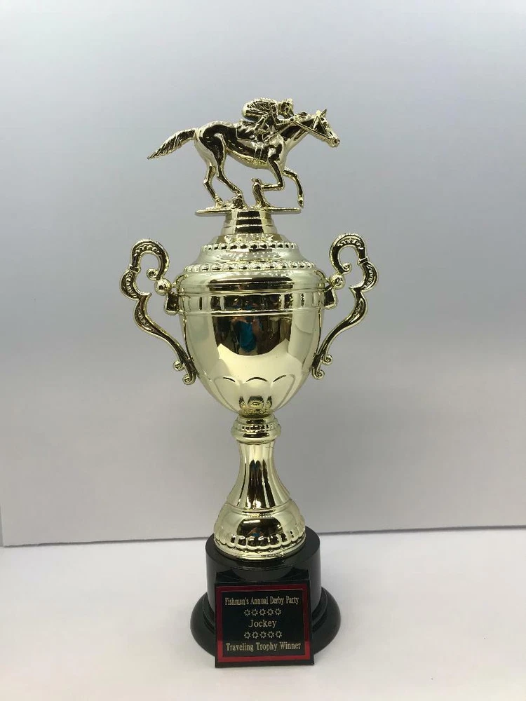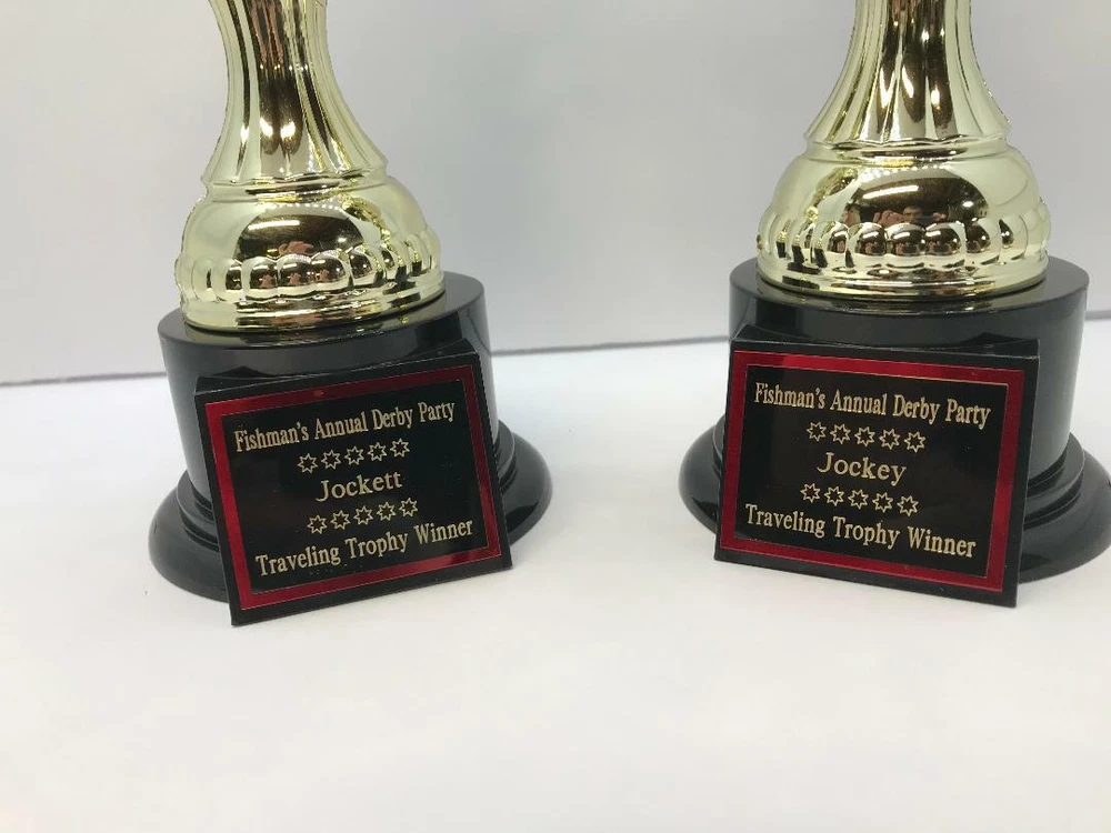 TROPHY FEATURES: PREAKNESSS STAKES / HORSE RACING PARTY AWARD!! BEST DRESSED LADY, GENT, COUPLE FIRST PLACE HORSE PICKER! TRAVELING TROPHY ETC.! TROPHY IS 14” “ TALL HEAVY RESIN *FREE CUSTOM ENGRAVING!* With felt bottom bump, foot pads to protect and prevent scratching furniture, table tops, etc. Custom Engraved 1.5"x 2.25" Black Brass Nameplate with Red Backing Plate! ATTENTION PLEASE! We do real diamond cutter engraving Not on plastic or laminate! This nameplate is black brass ! ALL ENGRAVING IS FREE! PLEASE VIEW MY FEEDBACK! During eBay checkout, on the view your purchase page, click on the message to seller area to add your personalization information you want engraved. PLEASE PUT the exact name/names And all text you want on each line of the engraved nameplate. (please double check the spelling) Thank You! Please # the lines! Here is a sample 1 st line THE MAGIC HATS 2 nd line 2011 3 rd line 8 BALL CHAMPIONS I am a Disabled American Veteran. I have been self employed and producing licensed sports plaques in New England since 1990. The quality of our product and workmanship are unsurpassed. If you would like a custom plaque made, or have any questions please email anytime. God Bless America, John For more sports plaques and memorabilia please view our other auctions. eBay - MRVITO34 eBay store Jva Sports Plaques Thank you and good luck! PLEASE DO NOT JUDGE TROPHIES BY SCAN. WE SHIP SEVEN DAYS A WEEK! ALL ORDERS RECIEVED BY NOON SHIP SAME DAY! WE SHIP 7 DAYS A WEEK! ALL ORDERS RECEIVED BY 12 NOON SHIP SAME DAY!