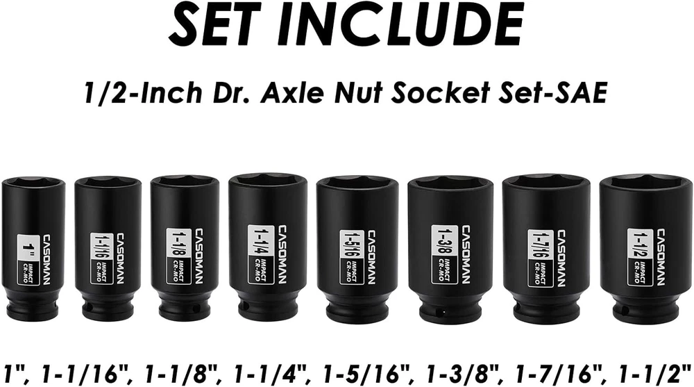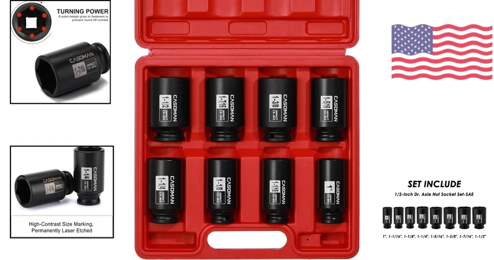 Precision 1/2-Inch Drive 6-Point Axle Nut Socket Set, SAE 1"-1-1/2", CR-MO Steel ‹ › ‹ › ‹ › ‹ › ‹ › ‹ › ‹ › ‹ › Precision 1/2-Inch Drive 6-Point Axle Nut Socket Set -SAE 1"-1-1/2", CR-MO Steel Features: Made of drop forged, heat treated chrome molybdenum steel with a corrosion-resistant black phosphate finish. 8PCS 1/2-Inch deep impact socket include: 1", 1-1/16", 1-1/8", 1-1/4", 1-5/16", 1-3/8", 1-7/16", 1-1/2" 6 Point install, Removal, Repair to remove, install, and repair hub or axle nuts on your vehicle. Fits axle nuts on most American domestic and import vehicles. High-contrast size marking is permanently laser and easy to read, even in low light. Come with a heavy duty blow molded storage case, easy to carry. Meets or exceeds ANSI performance standards. Comes with 1 year quality warranty. Benefits: Durable and high-quality construction for long-lasting use. Wide range of socket sizes for various axle nuts. 6-point design for secure installation and removal of nuts. Easy to read size markings for quick identification. Convenient storage case for organization and portability. Meets industry performance standards for reliable use. Backed by a 1-year quality warranty for peace of mind. Why choose our Precision 1/2-Inch Drive 6-Point Axle Nut Socket Set? When it comes to working on your vehicle, you need reliable tools that can handle the job. Our Precision 1/2-Inch Drive 6-Point Axle Nut Socket Set is made of durable chrome molybdenum steel and includes a wide range of socket sizes to fit most axle nuts. The high-contrast size markings make it easy to use, and the included storage case ensures easy organization and portability. Don't settle for subpar tools - choose our Precision 1/2-Inch Drive 6-Point Axle Nut Socket Set for all your vehicle maintenance needs. Order yours today! Shipping Free & Fast Shipping - We offer free shipping to most of the USA with a normal delivery time of 3-7 days. However, due to the current situation, additional delivery time (up to 3 weeks) may be required for some items. Alternative Carriers - We may use alternative carriers (e.g. USPS, FedEx, UPS, etc.) to ensure your package arrives safely and on time. Due to the use of multiple carriers, we are unable to provide a tracking number automatically. Handling Time - Orders are processed and shipped within 1-2 business days of receiving cleared payment. Shipping Restrictions - Shipping to Alaska, Hawaii, Puerto Rico, Guam, and other US territories may incur shipping charges or delivery restrictions. Please contact us before ordering, or your order can be refunded/cancelled. State Restrictions - There may be restrictions based on your state of purchase. For example, certain items may not be shipped to California due to state regulations. Contact for Tracking Updates - If you require tracking updates or have any concerns about the delivery of your order, please feel free to contact us, and we will be happy to assist you. Return 30-Day Hassle-Free Returns - We want you to be completely satisfied with your purchase. If you are not, you can return the item within 30 days of receiving it for a full refund or exchange. Easy Return Process - To start a return, simply contact us and we will provide you with a prepaid return shipping label and detailed instructions. Restocking Fee - There are no restocking fees for returns. However, the buyer is responsible for return shipping costs if the return is not due to a seller's error. Refund Processing Time - Refunds will be processed within 5 business days of receiving the returned item in its original condition. Payment We accept all major credit cards, PayPal, and Apple Pay for your convenience. Your payment information is secure and encrypted to ensure a safe and seamless transaction. Please complete your payment within 3 days of purchase to avoid any delays in shipping. Feedback Your feedback is extremely important to us. We strive to provide the best products and customer service possible. If you are satisfied with your purchase, please take a moment to leave us a positive review. If you have any concerns or issues with your order, please contact us before leaving negative feedback. We are committed to resolving any problems and ensuring your satisfaction. Contact Us If you have any questions or concerns, please feel free to reach out to our customer support team. You can contact us through the eBay messaging system. We are available Monday to Friday, 9:00 am to 5:00 pm EST, and we will do our best to respond to your inquiry within 24 hours. Thank you for supporting our small family business!
