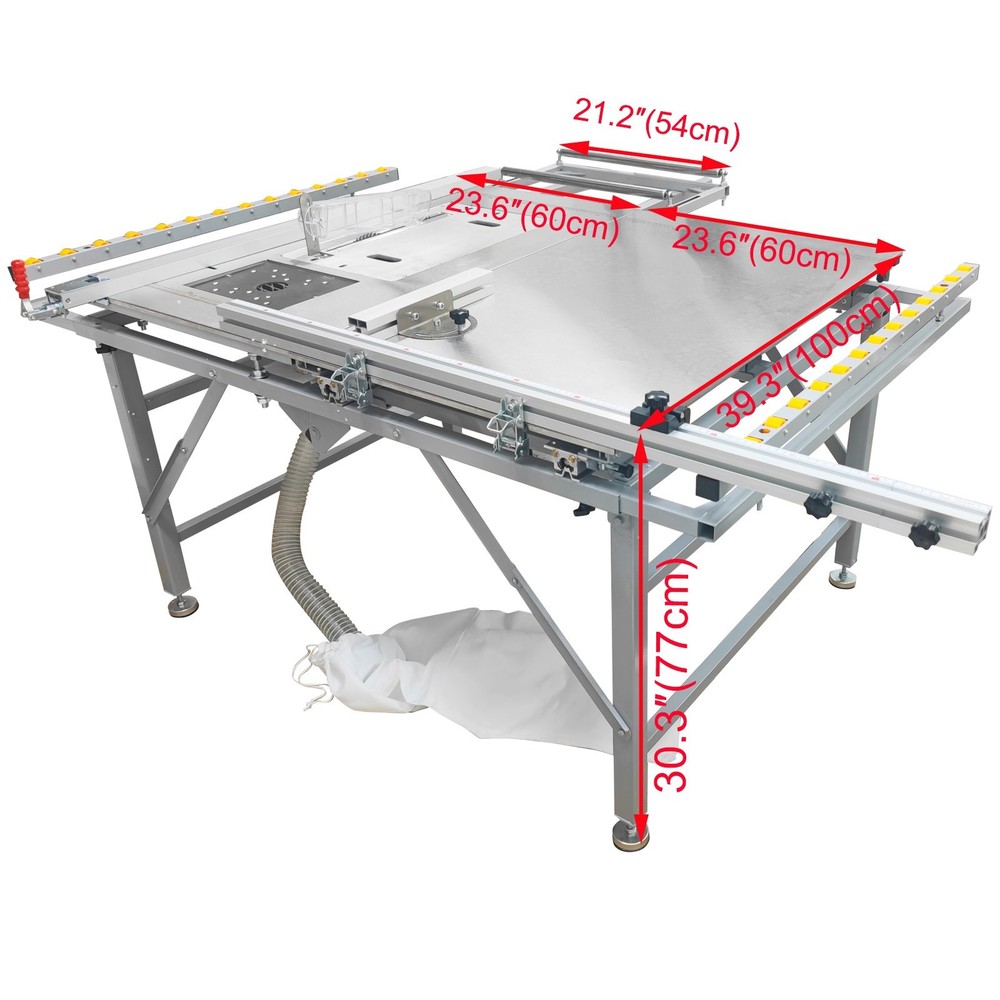Precision Dust-free Woodworking Saw Table Multifunctional Saw Bench 220V The woodworking saw table with an anti-chip dust-free saw is a professional saw combination specifically designed for achieving high precision cutting and environmentally-friendly operation. The saw table has the advantages of high cutting quality, effective dust collection, high operation safety and low energy efficiency. The woodworking saw table can be widely applied to the woodworking industry and is suitable for furniture manufacturing, musical instrument making, building model processing, woodworking teaching, etc. Parameters Voltage 220V 1-phase Material of pushing plate 0.7mm stainless steel plate Size of saw bite 50x30cm (19.7x11.8 inches) Size of Table top 100x120cm (39.3x47.2 inches) Material of saw table Aluminum alloy linear precision square rail Frame structure Disassembly-free right-angle foldable inclined beam Total net weight About 75kg (165.3LBs) Attention 1. Keep children and other persons away from the machine when operating the power tools. 2. Correctly connect the machine to the 220V power supply with reliable grounding. 3. Keep alert, and pay attention to the operation. Do not operate the machine when you are tired or have a drug, alcohol or treatment response. 4. Use personal protective equipment and always wear goggles. Do not wear loose clothes or accessories. 5. Before adjustment, replacement, repair and storage, be sure to turn off the switch and pull out the plug. 6. Do not put hands into the machine. Do not touch the moving parts during use. Features 1. Small size, light weight, foldable structure, and convenient for workers to carry. 2. Durable and aesthetically pleasing. 3. Environmentally friendly, avoid secondary pollution in decorated rooms and ensure the health of construction personnel. 4. The safety switch and safety cover prevent personal injury caused by operational errors. 5. Dry dust removal, longer motor life, safe and reliable. 6. Workers can easily clean the dust, and the elastic belt dust collection bag is fast and convenient to clean. Anti-chip Saw Unit The anti-chip saw is equipped with a main saw blade and an auxiliary saw blade, grooving and cutting can be accomplished at the same time, the processing time is remarkably shortened, the cut is flat and smooth, and the operating convenience and efficiency are greatly improved. Dust Collection Bag The dust collection bag is perfectly matched with the dust collection system to achieve effective dust collection during operation. The dust collection bag is low in cost, easy to install and use, high in compatibility, small in occupied space and good in dust collection effect. Dust Cover By means of the transparent dust cover, the dust generation source can be completely covered as much as possible, the dust can be quickly sucked into the pipe before dispersion, and the dust removal efficiency is remarkably improved. As a physical barrier, the dust cover can also improve the operation safety. Fixing Handle The fixing handle can be controlled to fix and release the backing plate during use, effectively preventing the workpiece from movement and deviation during operation, improving the operating efficiency and ergonomic comfort and achieving precision adjustment. Positioner The positioner is movably installed on the backing plate and can be conveniently adjusted as required, the high precision and consistency of cutting can be achieved, the measurement error can be effectively eliminated, and the positioning requirement can be perfectly met. Angle Regulator The angle regulator can be easily adjusted to achieve high-precision angle setting and cutting, the angle error can be eliminated, seamless splicing can be easily achieved, the efficiency of complex cutting can be substantially improved, and the processing consistency is well enhanced. Preformed Hole The preformed hole is designed for installation of a milling machine, effectively enhancing the functionality of the saw bench, achieving seamless integration and quick switching of saw cutting and milling, and greatly improving the processing accuracy and capacity. Extension Roller The extension roller can stably support long/large workpieces, the workpieces can be prevented from deformation during operation, the cutting error can be avoided, the grooving quality can be effectively ensured, and the ergonomic demand can be well met. Moving Wheels The moving wheels are additionally provided for the saw bench, facilitating movement after the saw bench is folded. The saw bench can adapt to different working requirements, the physical output can be greatly reduced, and the safety is also well improved. Operation Method 1. Assemble the saw table and saw system, and connect the dust collection bag. 2. Place the material to be processed on the table top, adjust the positions of backing plates according to the processing requirements, and adjust the angle as needed. 3. Connect the saw system to the 220V power supply with reliable grounding, and start the saw system. 4. Slowly push the material to achieve cutting operation. 5. After processing, unplug the saw system, clean the saw bench thoroughly and clean away the dust in the dust collection bag. Item Number:1 x Multifunctional Saw Bench with Anti-chip Saw Unit 220V (033168) Shipping & Handling Details Default Shipping Cost or Free Shipping Information: ▲ Default shipping cost or free shipping service is only for the lower 48 United States by UPS Ground or USPS. Other areas or needs other shipping ways, please contact us. ▲ Buyers from Guam, Puerto Rico, Virgin Islands, American Samoa, Alaska, Hawaii, PO Boxes, APO/FPO addresses or other countries/areas, there WILL be extra shipping costs, please contact us for more detailed information. ▲ Please make sure your address is valid for both UPS and USPS services. Any costs incurred because of incorrect or undeliverable address should be undertaken by buyer. Handling Time: Shipping i