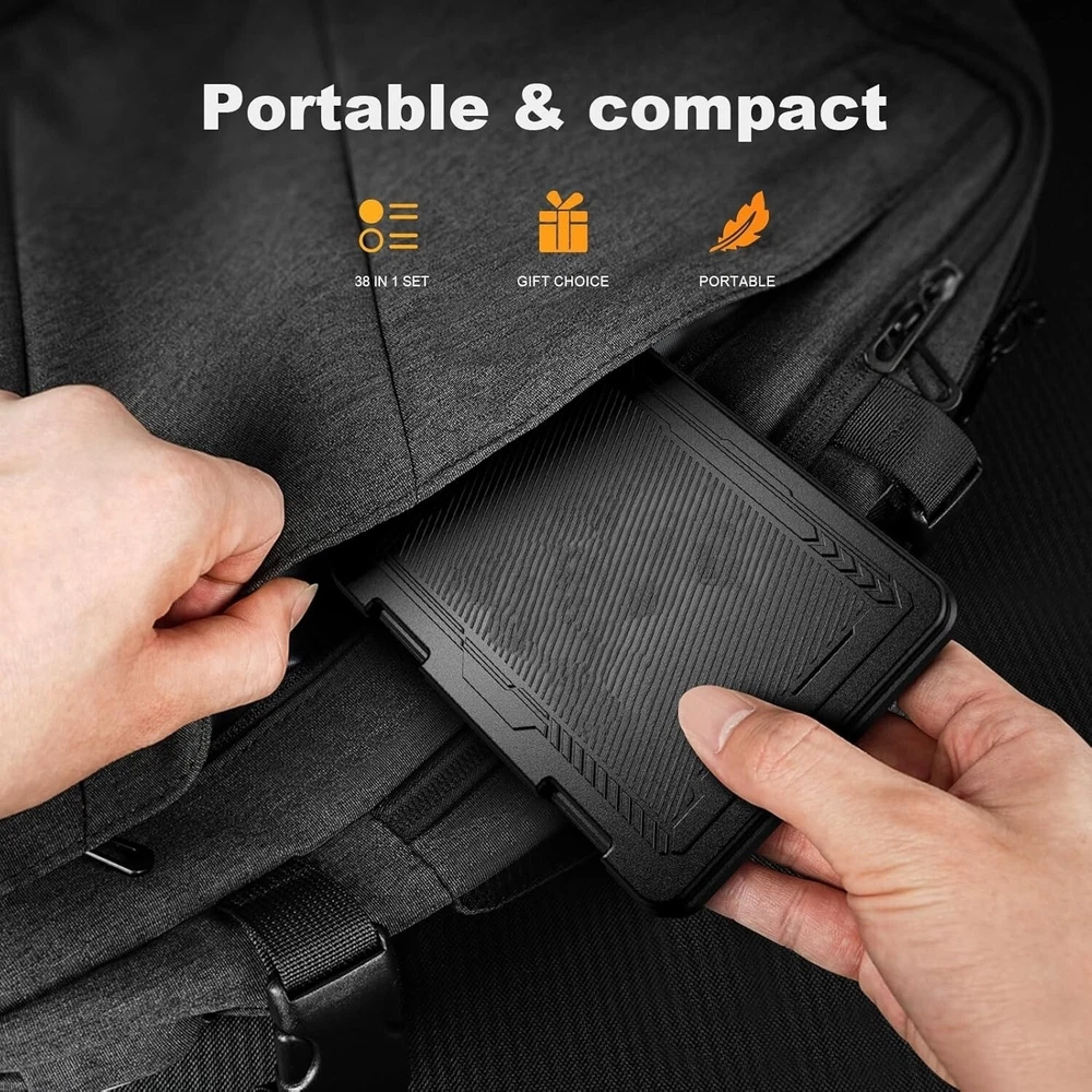 Juego De Destornilladores De Precisión 38, Regalo Para Hombres, Kit De Her NUEVO 【Juego de destornilladores de precisión】-- El juego de destornilladores de 38 piezas tiene 30 puntas de destornillador CRV que son phillips PH000(+1.2) PH000(+1.5) PH00(+2.0) PH0(+3.0) PH1(+4.0), cabeza plana -0.8 -1.2 -1.5 -2.5 -3.0, torx T1 T2 T3 T4 T5, torx security TR6 TR7 TR8 TR9 TR10 TR15 TR20, triwing Y000(Y0.6) Y00(Y1.5) Y0(Y2.5) Y1(Y3.0), pentalobe P2(0.8) P5(1.2) P6(1.5), MID 2.5, con un mango de destornillador, un spudger de doble punta, un spudger largo, un spudger triangular, pinzas, un cepillo de limpieza y una ventosa Con dedal para tarjeta SIM. 【Mango giratorio antideslizante】-- Todas nuestras puntas de destornillador están fabricadas en acero al cromo vanadio CR-V de alta calidad. Las puntas CR-V no se oxidan fácilmente ni se rompen. El mango del destornillador está fabricado con materiales TPR y PP, con un diseño antideslizante especial que ofrece una gran comodidad. La parte superior del mango tiene un diseño giratorio que facilita la extracción de los tornillos; la cabeza del mango y la del tornillo cuentan con adsorción magnética que permite reemplazar los tornillos rápidamente. 【Dispositivos portátiles】-- El spudger triangular es ideal para abrir la pantalla del teléfono móvil. El spudger de doble punta es ideal para abrir la tapa trasera de consolas. El spudger largo permite hacer palanca en las partes internas del dispositivo. La ventosa permite abrir la pantalla, lo que facilita la reparación del teléfono móvil. El dedal para tarjeta SIM se puede utilizar para reemplazar la tarjeta SIM del teléfono móvil. El cepillo de limpieza limpia el polvo del dispositivo. Las pinzas sujetan piezas pequeñas. 【Amplia gama de aplicaciones】-- +1.5/2.0 P2 Y0.6 MID2.5 se utilizan para iPhone 7/8/X/XR/11/12/13. +1.2/1.5/2.0/3.0 T2/3/4/5 P2 se utilizan para Samsung/Huawei/Xiaomi y otros teléfonos. +1.5/2.0/3.0 T3/4/5/6/9 se utilizan para iPad/Mini/Air/Pro. +1.2/1.5/2.0/3.0/4.0 T2/3/4/5 -2.5 se utilizan para Huawei/Honor y otras tabletas. P2/5/6 +1.5/2.0/3.0/4.0 T3/4/5/6/7/8/9 Y2.5/3.0 se utilizan para Macbook/Air/Pro. +1.5/2.0/3.0 T5 se utilizan para Kindle/Kindle Fire. T6/15 se utilizan para Ring Video Doorbell/Video Doorbell 2/Pro/Elite. 【Amplia gama de aplicaciones】-- T8 +1.5/2.0/3.0 se utilizan para mandos y consolas PS3/PS4/PS5. T6/8/10 se utilizan para mandos y consolas Xbox 360/Xbox One/Xbox Series. Y1.5/2.5/3.0 +1.5/2.0 se utilizan para Switch/NS-Lite/Joy-Con/Wii/Game Boy Advance. T3/8 se utilizan para pulseras/cuchillos plegables Fitbit. +1.2/1.5/2.0/3.0/4.0 T3/4/5/6/7/8/9 Y2.5/3.0 -2.5 se utilizan para Microsoft/Acer/Dell y otras computadoras portátiles. +1.2/1.5/2.0/3.0/4.0 -0.8/1.2/1.5/2.5/3.0 se utilizan para computadoras de escritorio/relojes/gafas/juguetes.