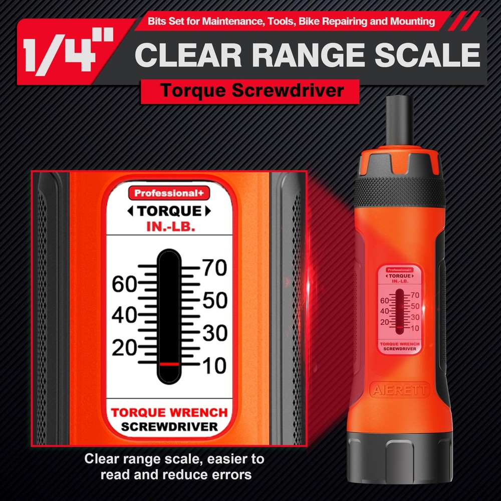 MATERIAL: The torque screwdriver is constructed from premium alloy steel and ABS resin. The head is made of hardened alloy steel. The resin handle is comfortable to grip, anti-skid, and corrosion-proof. The color-coded bits: Hex, Slotted, and Torx bits constructed with S2 steel for extremely durability HIGH ACCURACY: Calibrated according to DIN 6789, 10 to 55 inch-pounds is pre-calibrated accuracy of +/- 3, 55 to 70 inch-pounds is +/- 4%. When the pre-set torque value is reached, you will hear audible "click" sound EASY READ AND USE: Pull down to unlock, then set the torque you need and push up to lock lock. Clear range scale, easier to read and reduce errors VERSATILE: It be used to apply torque to scope mounting, bicycle and precision instrument. It is perfect for hunters, road cyclists and road motorcycle enthusiasts PACKAGE: 1 x Torque screwdriver, 30 x Bits: PH0, PH1, PH2, PH3; SL3mm, 4mm, 5mm, 6mm, 8mm, 11mm; T6, T8, T10, T15, T20, T25, T30, T40; H3/32", 7/64", 5/32", 3/16", H2mm, 2.5mm, 3mm, 4mm, 5mm, 6mm, 8mm. 1 x 1/4" hex to 1/4" driver socket adapter, and protective hard case