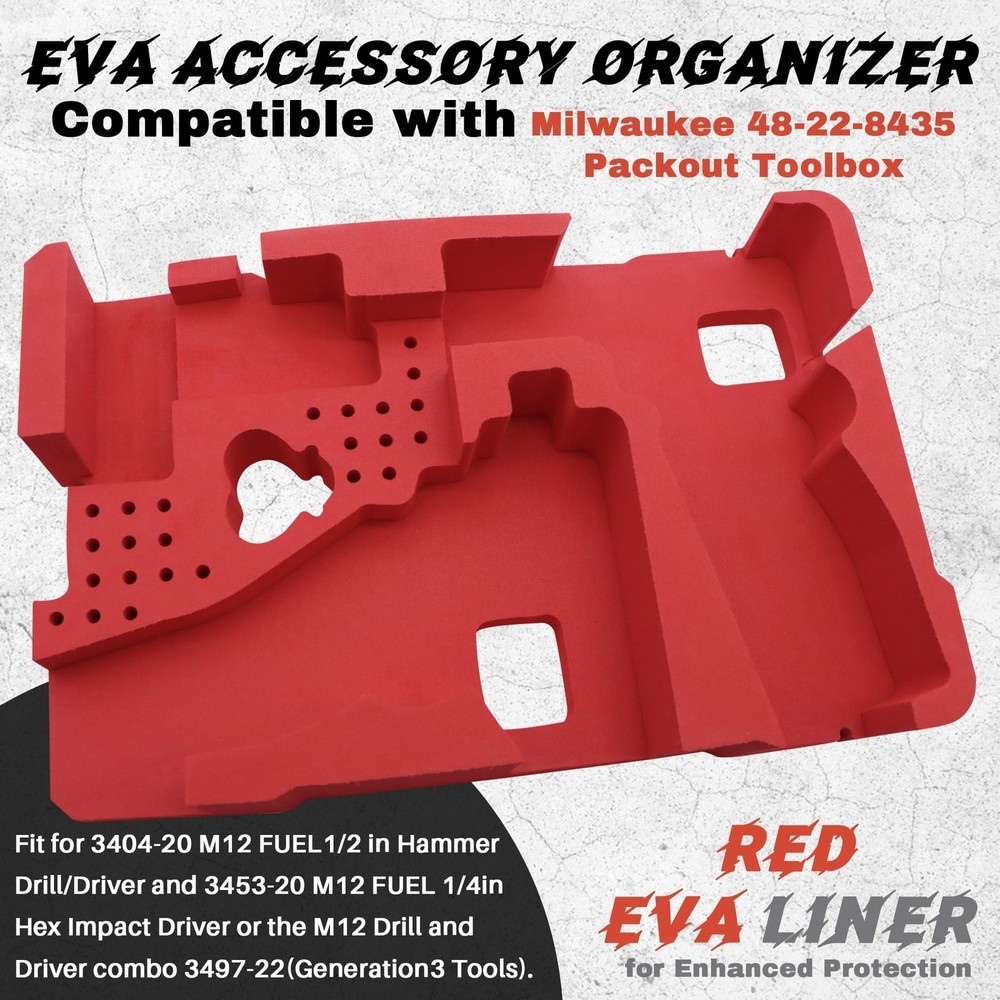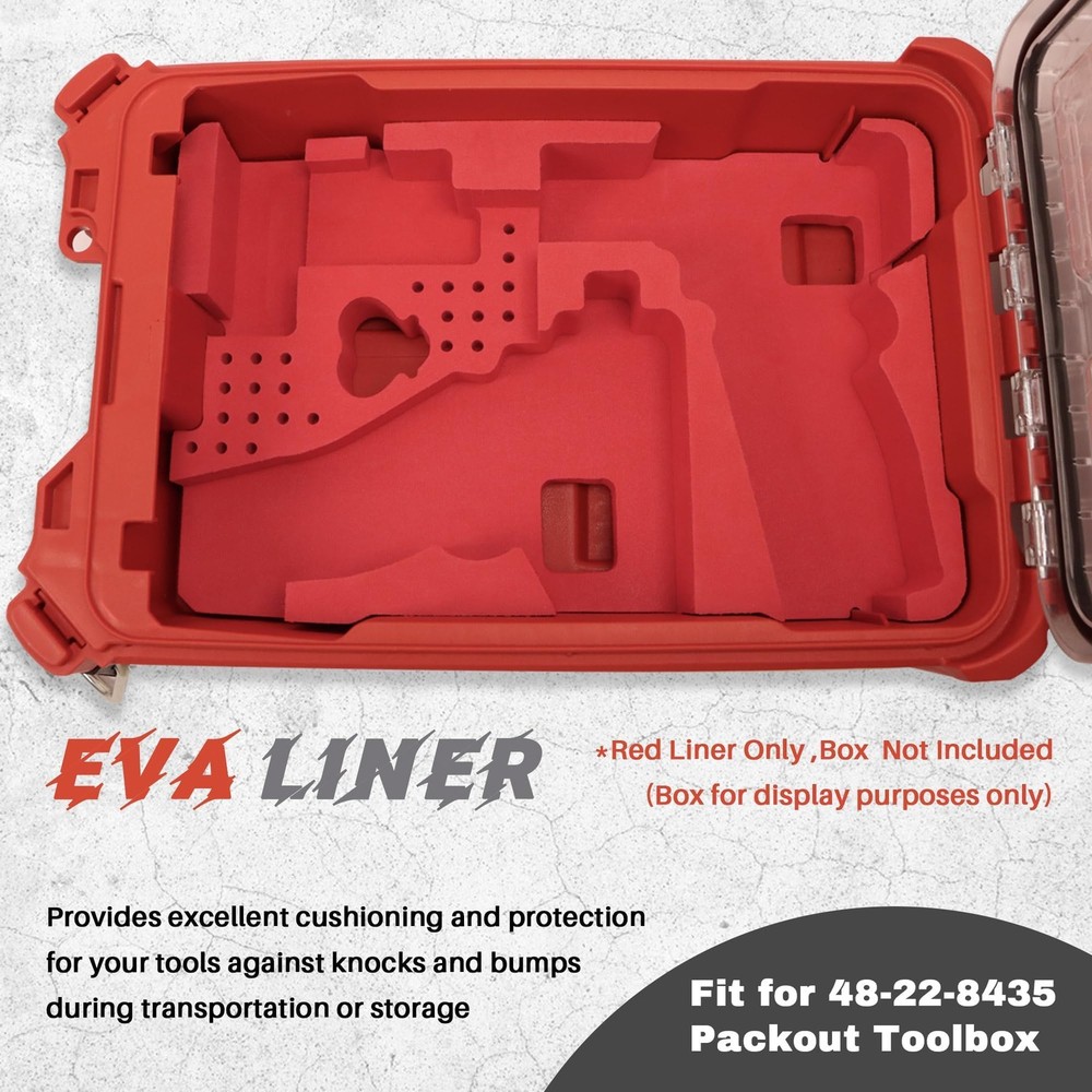 Maximize Your Packout Tool Box with ’s Custom Foam Insert! Upgrade your 48-22-8435 Packout Tool Box with ’s premium EVA foam organizer, engineered for craftsmen who demand precision and durability. Designed to seamlessly integrate into your Packout ecosystem, this insert transforms your toolbox into a fortress of organization, safeguarding your M12 FUEL tools (3404-20, 3453-20, 3497-22) and accessories with good protection. Perfect Fit for 48-22-8435: Designed exclusively for Milwaukee Packout 48-22-8435 Tool Box, this EVA foam insert ensures a snug, secure fit to maximize storage efficiency and protect your tools from bumps and scratches Precision-Cut EVA Foam: Crafted with advanced laser-cutting technology, our foam insert features contoured slots tailored for M12 FUEL tools (3404-20, 3453-20, 3497-22) and accessories, keeping everything organized and instantly accessible Durable & Lightweight: Made from high-density EVA material, this Packout organizer resists wear, moisture, and oxidation while remaining lightweight. Built to endure job site rigors, it’s the ultimate upgrade for 48-22-8435 tool box accessories Quick Setup, No Hassle: Simply drop the foam insert into your 48-22-8435 toolbox and arrange tools into pre-cut slots. Includes a step-by-step guide for effortless organization—no trimming or adjustments needed Satisfactory service: Our EVA liner is designed to meet your needs. If you have any questions about our products, please feel free to contact our customer service support for a satisfactory solution