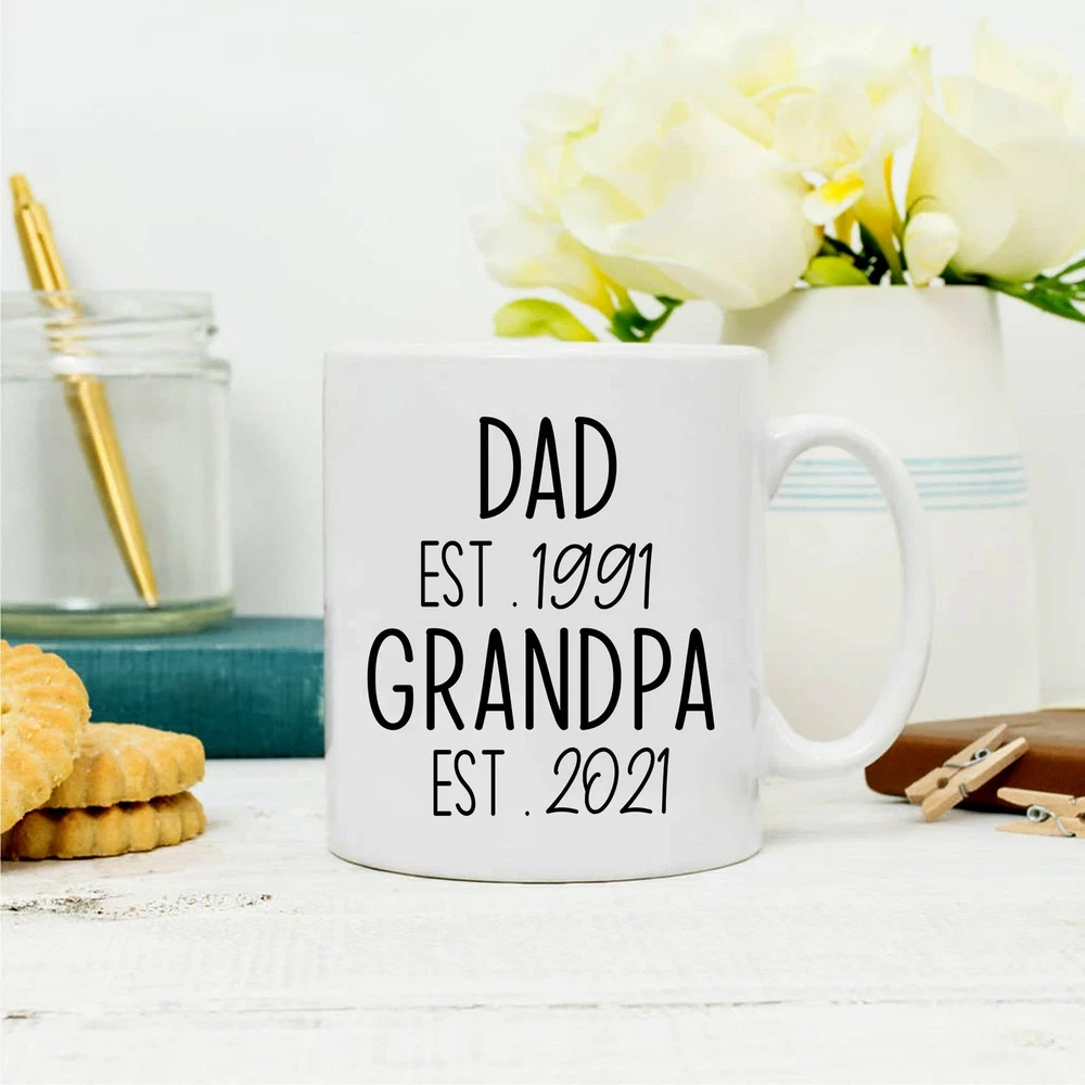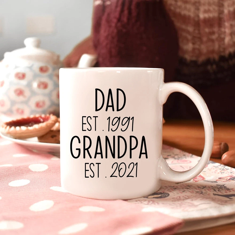 Pregnancy Announcement Mug Grandpa Est 2021 Father's Day Mug New Grandpa Mug Product Details.. This high quality 11oz. ceramic white mug has a premium hard coat that provides crisp and vibrant color reproduction sure to last for years. Perfect for all hot & cold beverages. The highest quality printing possible is used. It will never fade no matter how many times you wash it. Material: 100% Ceramic. Print both sides. Dishwasher and Microwave Safe. High Gloss + Premium White Finish. Printed in the U.S.A. Personalized & Custom. We support personalized and custom mug to add custom, when placing an order, you can add notes to the "order note" in shipping address section. Also you can contact us directly via message. Shipping Info. Ready to ship in 1 to 2 business days, All products are made-to-order and proudly printed in the United States. Shipped by USPS and DHL, You will receive your order in 5-7 days. Replace & Refund. All products are defective during shipping broken, chipped will be replaced free of charge. You are not satisfied with the product, we will refund 100% money to you. If any other issues arise, please do not hesitate to message, we would be more than happy to assist you.