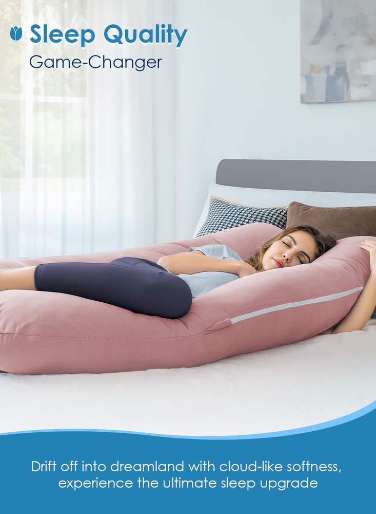 pregnancy pillow 55in, with silky jersey cover, pink Symmetrical U Shape: The u shaped pregnancy pillow is 55”x31”x7”, ergonomic design drapes along your body, gives total support to your head, back, hips and legs. Consistent left and right makes it easy to flip over at night. Ensures long quality sleep Silky soft: So soothing. The maternity pillow comes with breathable silky cover. It’s stronger and softer than cotton and gentle on skin, moisture wicking, offers long lasting comfort. The cover is machine washable, easy for cleaning Cool to touch: The only pillow you’ll ever want next to your skin. With good heat dissipation, perfect for summer or during pregnancy, also heavenly soft, fillings adjustable through the pillowcase zip. Stay cool and comfy all night Anytime, Anywhere: Use the body pillow anywhere you want to get cozy. Position to your bed, sofa even the floor when sitting, nursing, reading or watching TV to get support. The pillow is loved by people recovered from injured, sciatica and reflux because of its extraordinary supportive function Have a try! We’re so confident you’ll love this pillow. If not, tell us why and we will make it right. Feel free to reach out to us if any concerns or questions you have. Better allow 72hrs for the pillow fluff up before first use due to vacuum transport