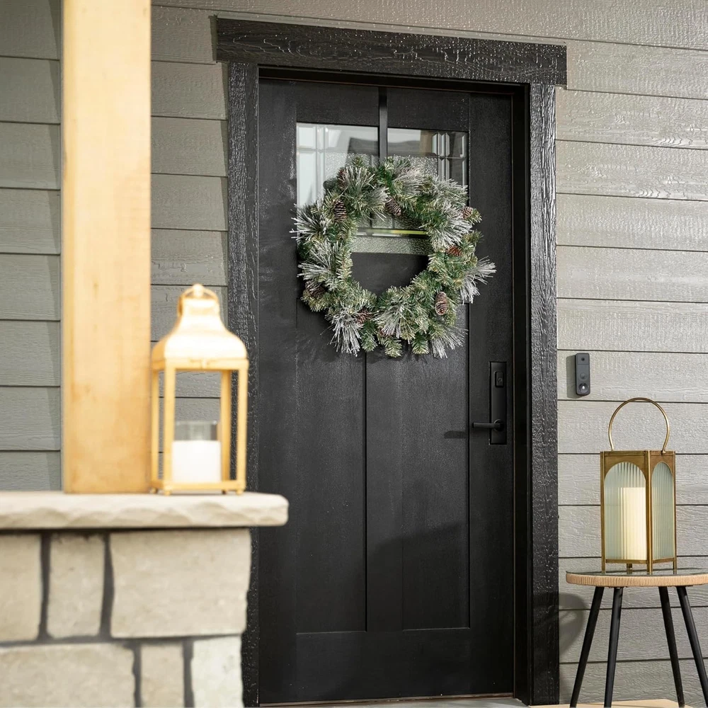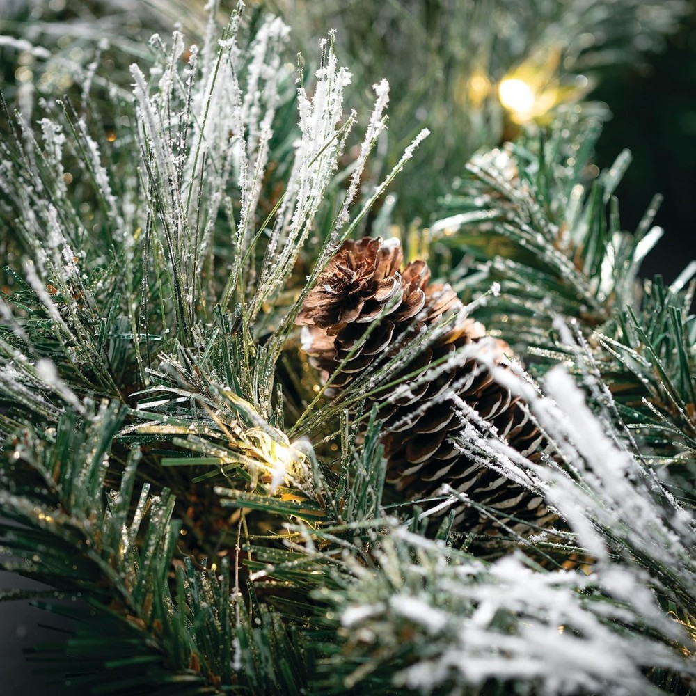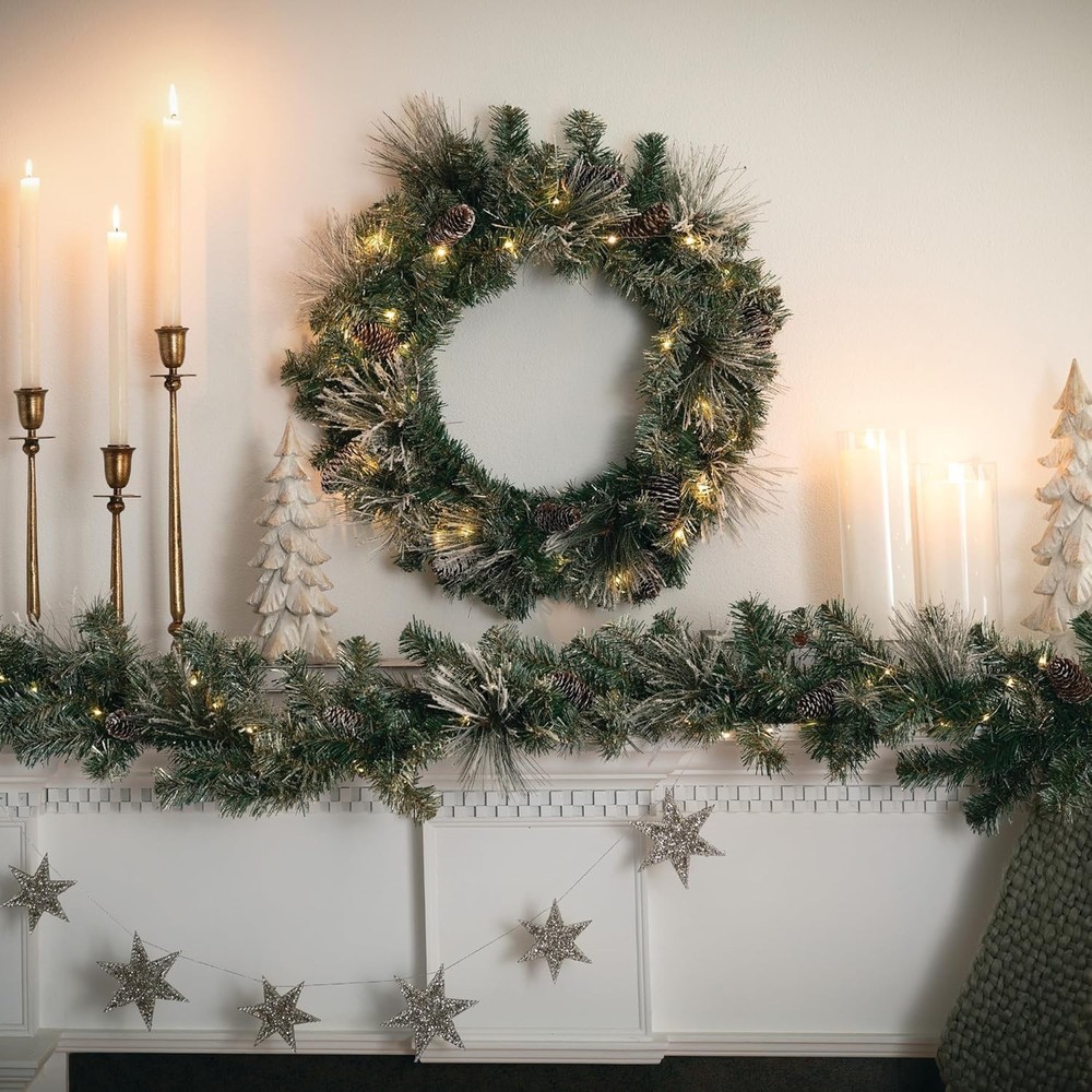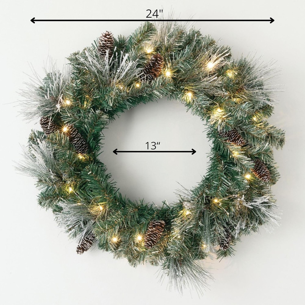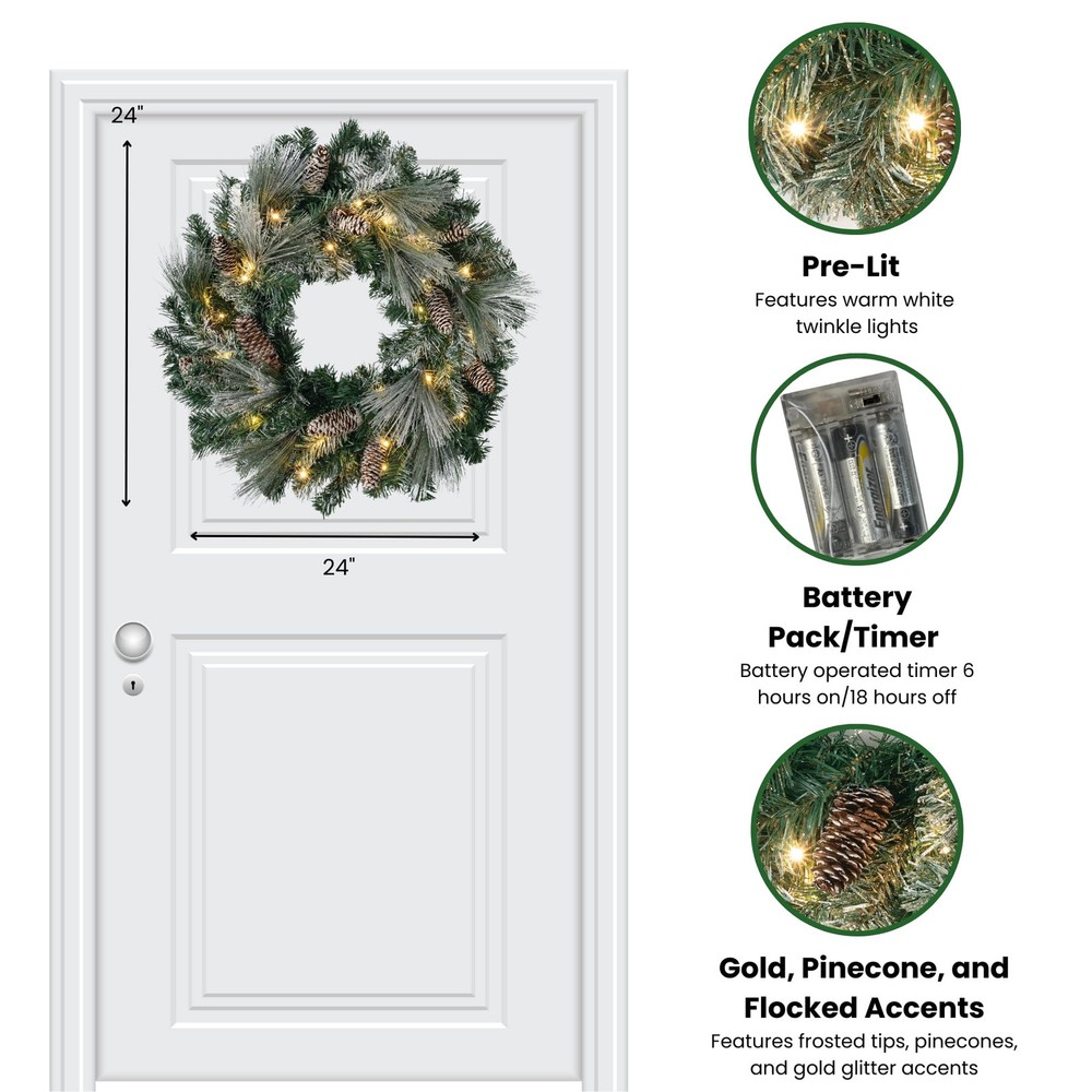 Elegant Flocked Christmas Wreath: Elevate your holiday decor with the 24" Lightly Flocked Pine Wreath. This beautiful Christmas wreath features lightly flocked pine needles, natural pinecones, gold glittered accents, and warm white twinkle lights adding a touch of snowy elegance to your Christmas decor. Prelit with Warm White LED Twinkle Lights: This lighted Christmas wreath is pre-lit with soft, white LED lights, creating a warm and inviting atmosphere. Perfect for illuminating your home with festive cheer, it's an essential addition to your Christmas door wreath collection. Battery Operated Timer: Designed for convenience, our Christmas wreath with lights includes a battery-operated timer, ensuring your wreath lights up automatically each evening at the same time, simplifying your holiday decorating routine. This battery operated LED prelit wreath is powered by 3 AA batteries (NOT INCLUDED). Once the timer is activated, the lights will turn on for 6 hours and 18 hours off. Versatile Christmas Decoration for Any Space: Ideal for both indoor and outdoor Christmas decorations, the Lightly Flocked Pine Wreath adds festive charm to doors, walls, and windows. Its versatile design makes it a beautiful addition to any holiday setting. Durable and Long-Lasting: Crafted from high-quality materials, this Christmas wreath is built to withstand. Its sturdy construction ensures that it remains a charming part of your Christmas decor for many seasons to come. Bundle with our matching prelit Christmas garland to complete your collection.
