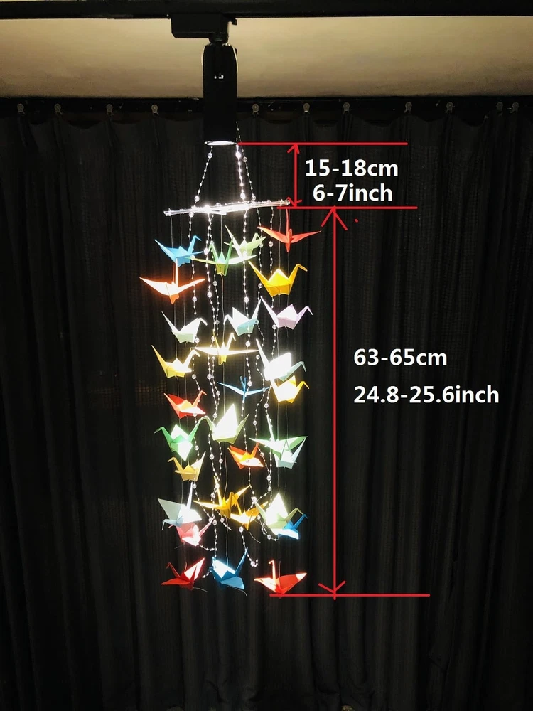 For Variety of Theme Party: The flying birds creating a natural party atmosphere, let you and your guest relax and refresh, perfect for decorating rustic wedding, bridal shower, baby shower, dancing recital, prom, fete, booth, bachelorette, anniversary, engagement, Valentine's Day, birthday party supplies Package Included -- 1* premade hanging origami paper cranes mobile garlands. All cranes are hand fold, and connected together with good quality fish line. Unique Design -- This paper cranes mobile is handmade, with the paper and transparent stick and beads chain. There are 6strings of paper crane garlands, 5pcs paper cranes on each string. The paper crane size: tall: 7.5cm, wing spread size about 10-12cm. The paper crane mobible size: Length:45cm/17.7inch, wide: 23cm/9inch. Various Applications -- Hanging them surround your house indoor or garden outdoor, yard, gazebo, balcony, baby kids room, Living Room, nursery, classroom, office Ceiling, doorway, wall, window, tree, fireplace, furniture etc For Variety of Theme Party -- The flying birds creating a natural party atmosphere, let you and your guest relax and refresh, perfect for decorating rustic wedding, bridal shower, baby shower, dancing recital, prom, fete, booth, bachelorette, anniversary, engagement, Valentine's Day, birthday party supplies. Best Wishes -- The crane has long been a symbol in Asian cultures representing good health, longevity, truth and fidelity; origami paper cranes have come to symbolize good fortune, healing, hope, peace, and love; hanging them around your home or displaying them at a party not only is a symbolic gesture, but is also a lovely way to bring a bit of whimsy and color to your space.