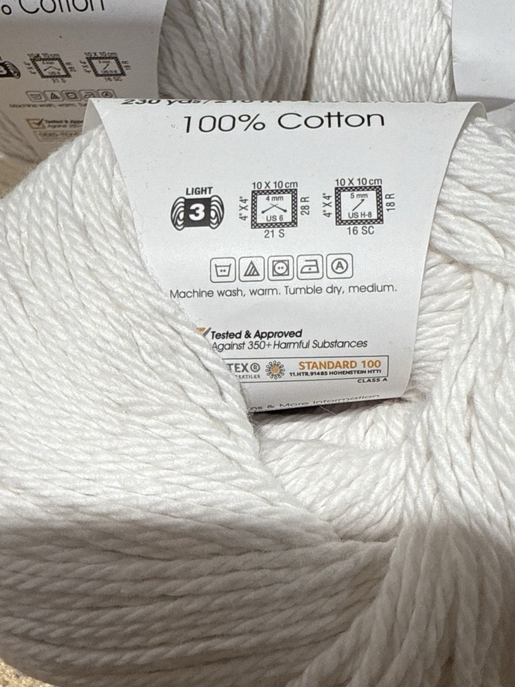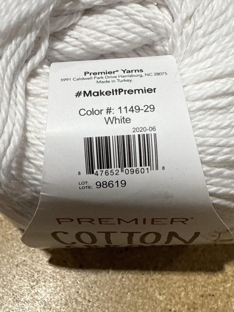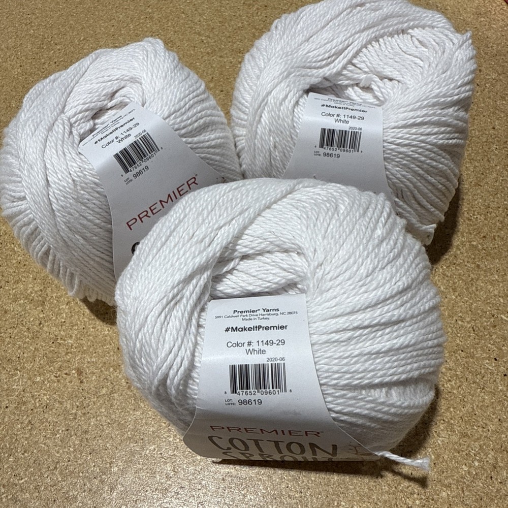 Set of 3 skeins of Premier Cotton Sprout yarn in White (Color #1149-29, Lot #98619). Each skein: 3.5 oz / 100 g, 230 yds / 210 m, 100% cotton, light weight (#3). Machine wash warm, tumble dry medium. Ideal for dishcloths, baby items, and home décor projects. ✨ Packing & Shipping Note: These will be packed with extreme care using extra cushioning materials when needed to ensure safe arrival! 📦 Combined Shipping: We’re happy to combine shipping and offer a discount when you purchase multiple items.