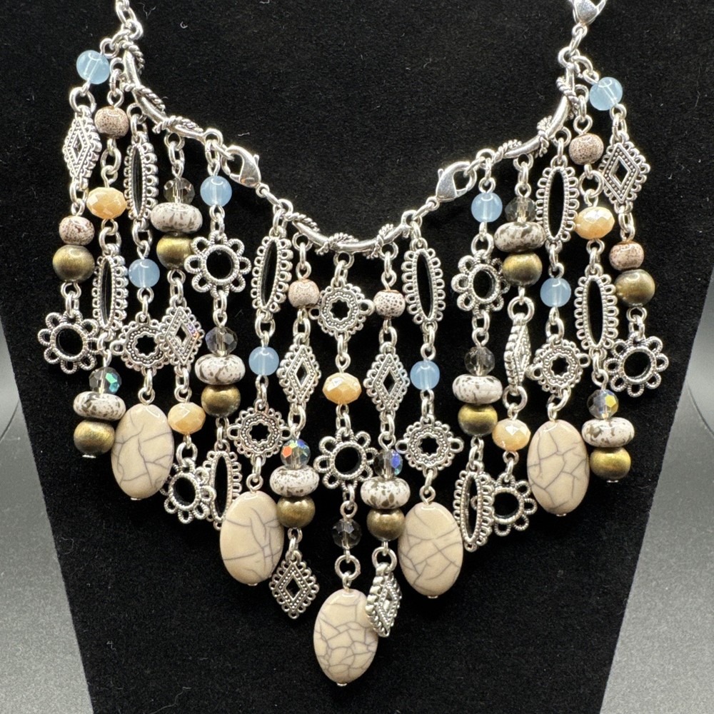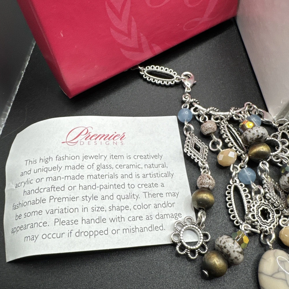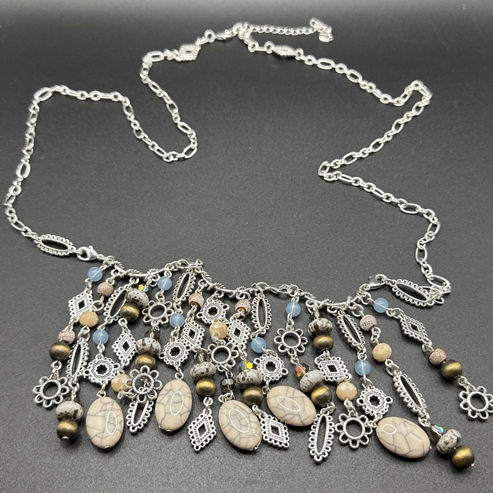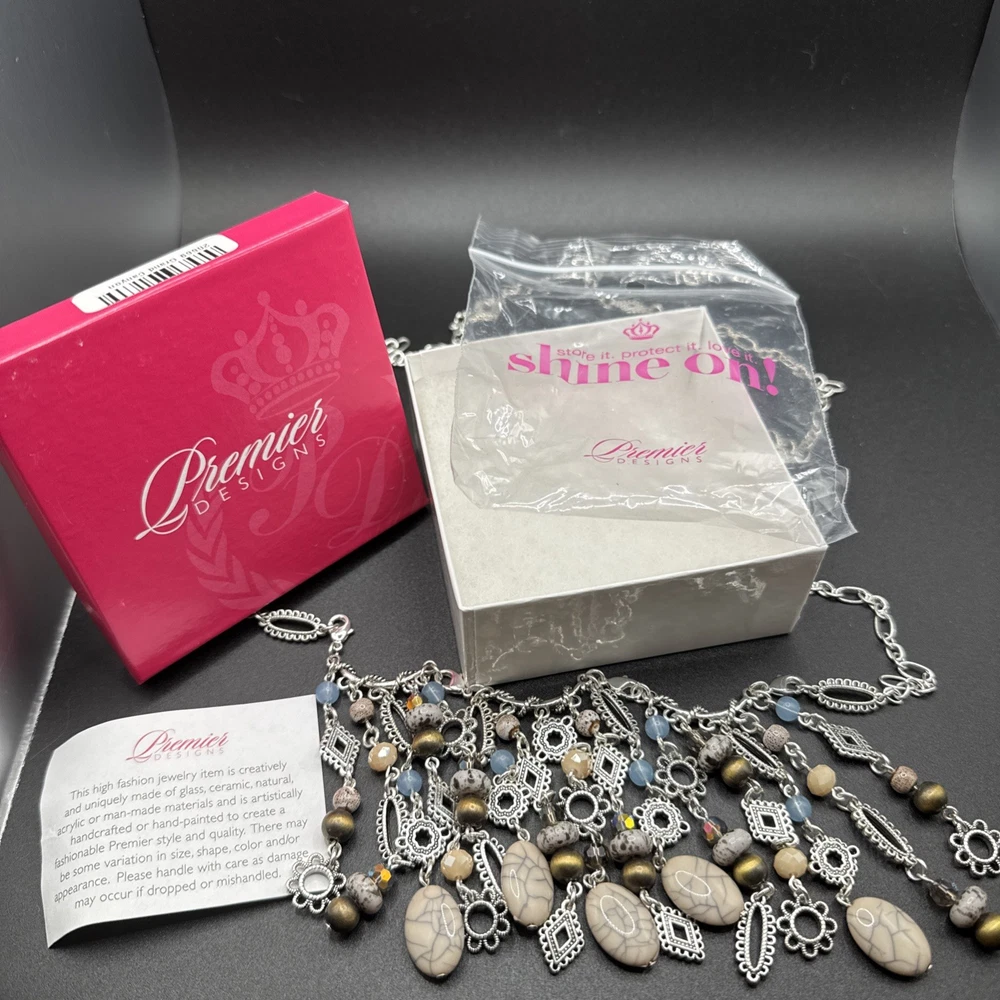 Elevate your jewelry collection with the Premier Designs Grand Canyon Charm Fringe Necklace. This stunning piece showcases a beautiful blend of blue and silver tones, with an oval-shaped pendant that houses a vibrant multicolor main stone. The necklace extends to a generous length of 36 inches, plus an additional 4 inches of extender, providing a comfortable and versatile fit for any occasion. Crafted with high-quality acrylic materials and featuring a lobster closure, this necklace is designed to be interchangeable, perfect for updating your look on the go. Ideal for a variety of special occasions, including birthdays, graduations, Mother's Day, and Valentine's Day, it's a statement piece that's both stylish and timeless.