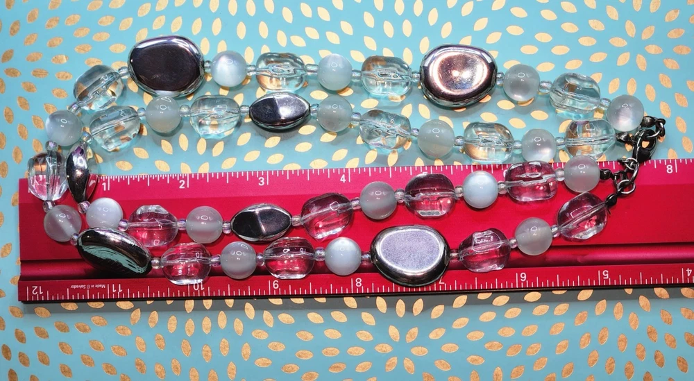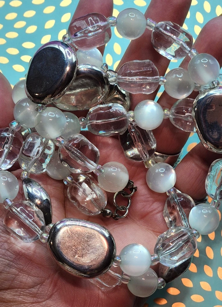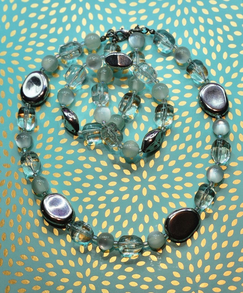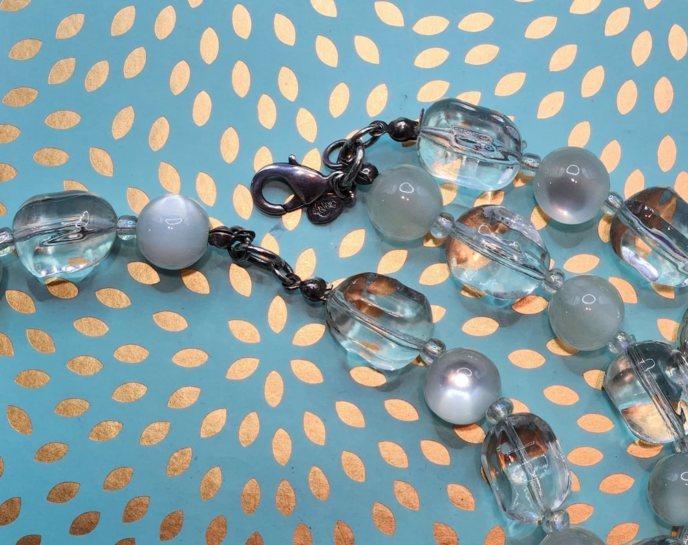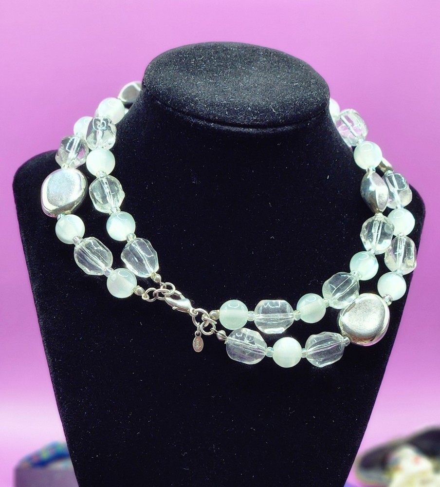 The Premier Designs Double Strand choker necklace features clear, silver, and cat's eye acrylic beads in a stylish beaded design. The necklace is signed by the brand and has a lobster closure for secure wear. With a vintage style this necklace is perfect for women who appreciate unique and fashionable jewelry pieces. If any questions plz contact me Tuly.