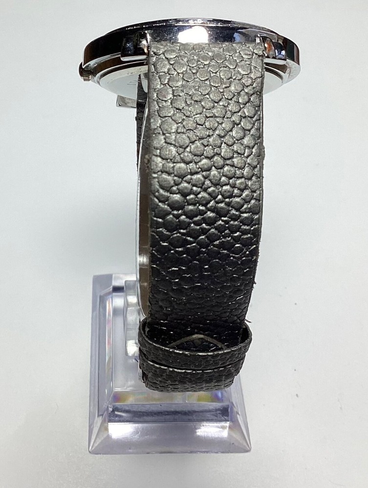 This Premier Designs women's wristwatch features a stunning mother of pearl dial with Arabic numeral indices and a gem-set bezel. The watch is powered by a quartz movement and comes with a two-piece faux leather strap with a buckle closure. The silver case has a polished finish and features a snap caseback. This wristwatch is perfect for both dressy and casual occasions, with its versatile style and analog display. It also includes features such as a central second hand, 12-hour dial, and push/pull crown. The watch is not water-resistant and does not come with papers, service records, or original box/packaging. 1155