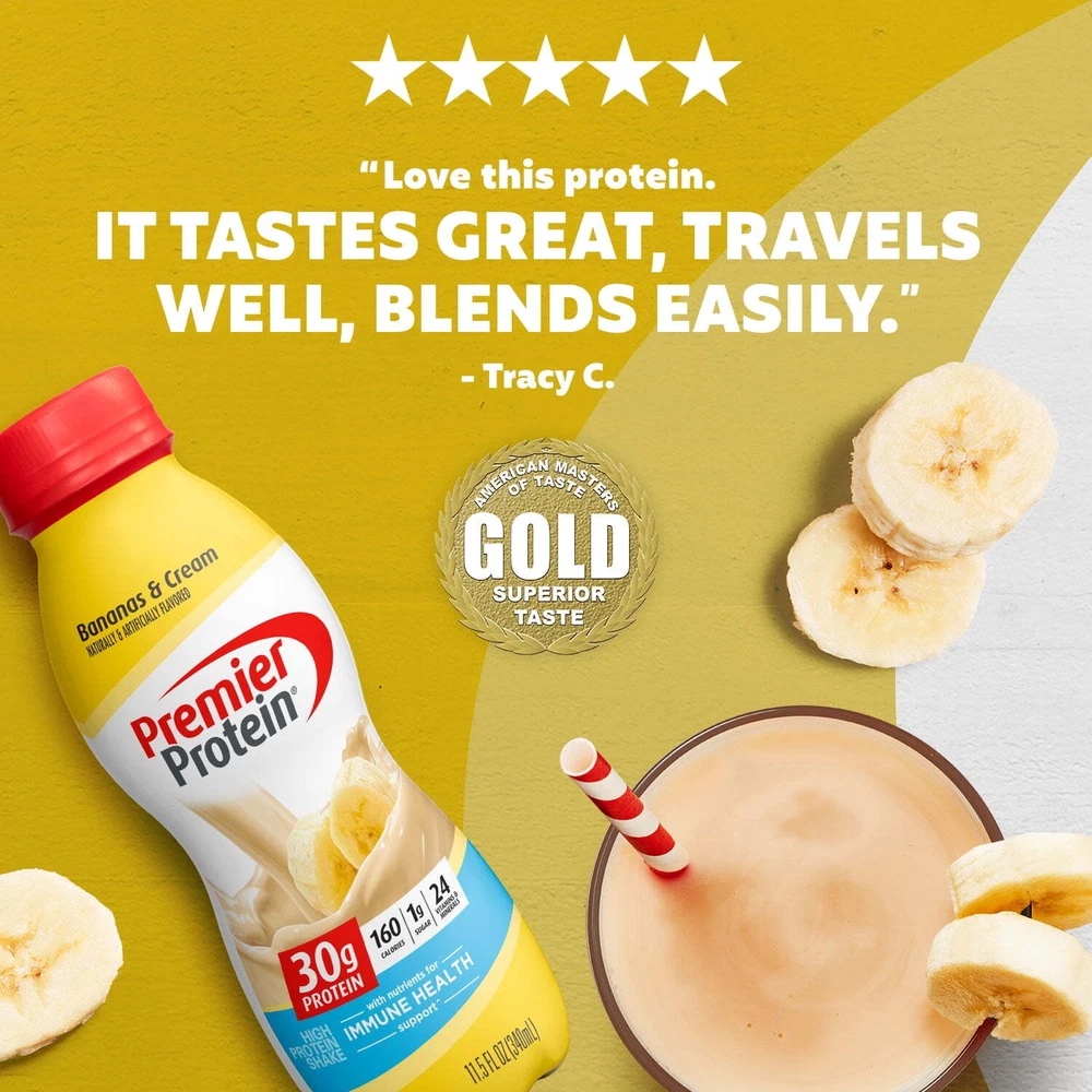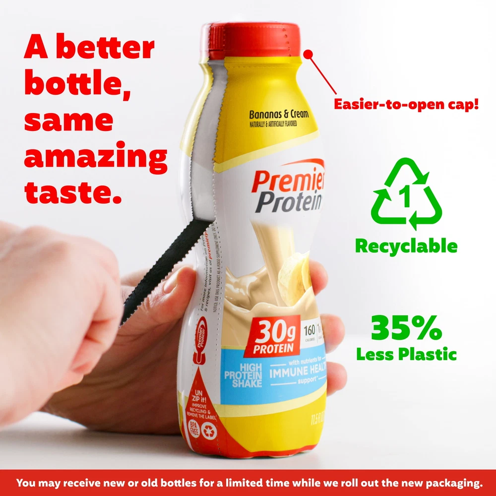 Product details Packaged in a recyclable 11.5 fl oz bottle, each Premier Protein Shake contains 30 grams of protein, complete with all of the essential amino acids, 1g of sugar, 3-5g carbs (depending on flavor), 160 calories, 24 vitamins & minerals, and is also low in fat. We use a proprietary blend of milk protein and casein in our shakes to help fuel muscles quickly and for several hours to help support your goals. Enjoy a shake as a healthy snack, a breakfast on-the-go, an afternoon snack, or as pre- or post-workout fuel. They are delicious as is but are also highly customizable. Try blending with your favorite fruits and vegetables for a delicious smoothie or adding to cereal or oatmeal. Available in 12 delicious flavors: Chocolate, Vanilla, Cafe Latte, Caramel, Cookies & Cream, Strawberries & Cream, Bananas & Cream, Peaches & Cream, Cinnamon Roll, Chocolate Peanut Butter, Cake Batter Delight and Cookie Dough. Enjoy the deliciously smooth bananas and cream flavor; Winner of American Masters of Taste Gold Medal for SUPERIOR TASTING ready-to-drink protein beverages. 30g of protein to help curb your hunger, as a mid-day snack or for post workout recovery; includes all essential amino acids. 24 Vitamins and Minerals: Support a healthy immune system as part of a healthy diet and lifestyle (Antioxidants Vitamins C and E plus Zinc), 50 percent daily value of calcium and 30 percent daily value of Vitamin D to help maintain healthy bones. Guilt free indulgence: 1g Sugar, 3-5g Carbs (depending on flavor), 160 Calories and Low Fat; Gluten Free, Keto and Bariatric Friendly, Kosher. We're all in it together when it comes to helping out the environment! That's why we've designed a more sustainable shake bottle. We've lowered our carbon footprint and created a bottle that's easier to recycle by using less material, eliminating the foil seal on the bottle, and switching to PET plastic. Oh, and don't worry- your shakes will still taste just as amazing as always! Skip the hassle of protein powder with the convenience of this ready to drink protein shake; great on the go nourishment that also pairs well with coffee, cereal, a pancake recipe, or in your favorite smoothie. NOTICE: Use this product as a food supplement only. Do not use for weight reduction. Contains: Milk & Soy Try all twelve (12) flavors: Chocolate, Vanilla, Caramel, Cookies & Cream, Cafe Latte, Chocolate Peanut Butter, Strawberries & Cream, Peaches & Cream, Bananas & Cream, Cinnamon Roll, Cake Batter Delight, and Cookie Dough.